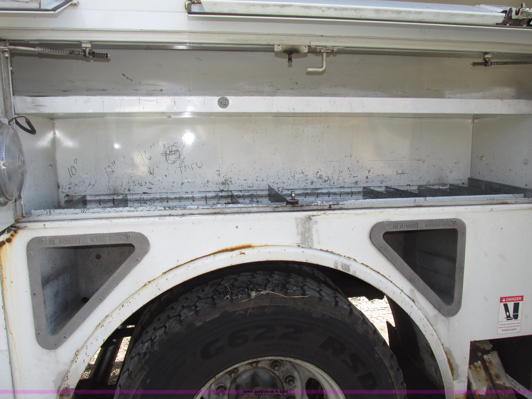 2003 Terex Telelect Hi Range 460M truck boom. 46' rated platform height, 500 lbs rated platform capacity, Rear hydraulic fittings, Basket and ground controls, Single man fiberglass basket, Reading utility bed 13'1"L x 96"W, (12) compartments, 2" rear bumper, Hazard and beacon lights, 58"L x 16 3/4"W cat walk, 60"W x 19"D front storage bin, 60"W I.D., (4) hydraulic outriggers (3) 24" x 24" wood pads, Approximately 16"D compartments, Mud flaps, Pintle hitch, Trailer wiring, Gladhand connections, Truck is not included, Unit will be removed from truck prior to auciton, Serial 2030421562, Unit# 506. S & N Auto. 6905 N 94th Plaza. Omaha, NE 68122