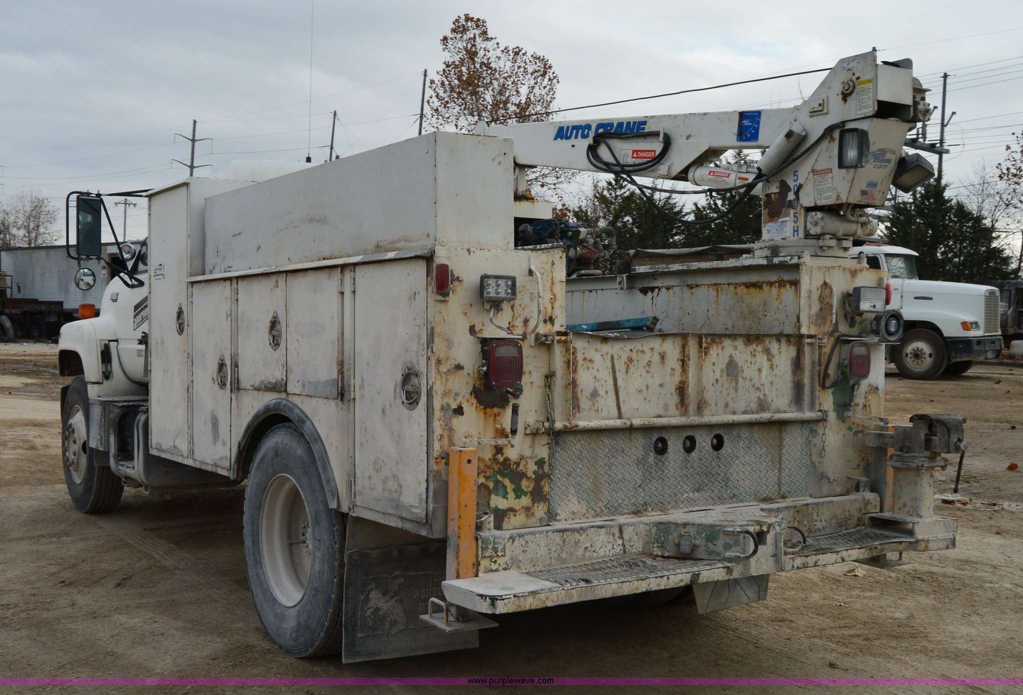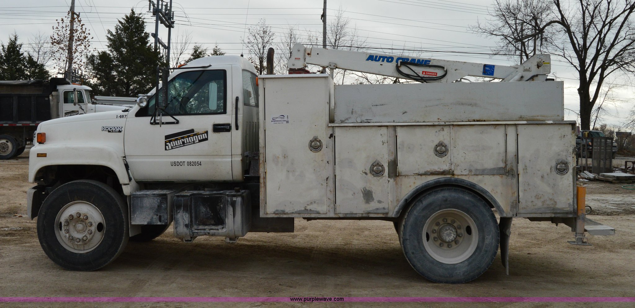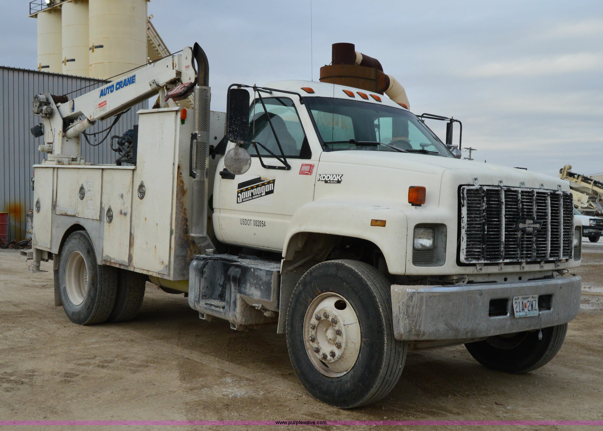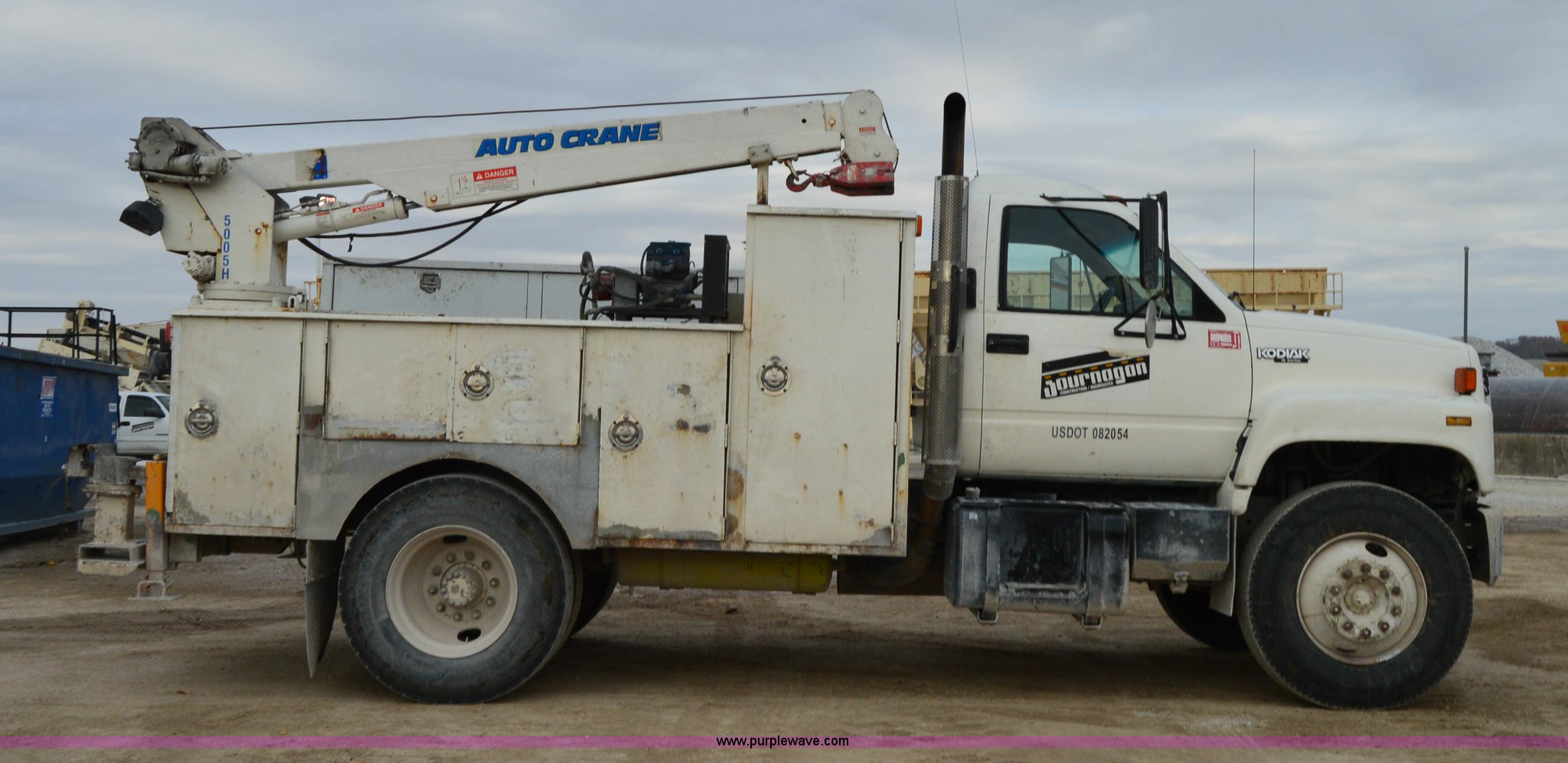 Purple Wave is selling a used Service Truck in Missouri. This item is a 1992 Chevrolet Kodiak service truck with the following: 367,449 miles on odometer, Miles may vary, still in use, Caterpillar 3116 7.6L L6 diesel engine, Five speed manual transmission, Two speed rear end, AC and heat, AM/FM/cassette, Manual windows and locks, Cloth interior, PTO driven air compressor, Auto Crane, Model 5005H, Dual 35 gallon fuel tanks, Rear work lights, Single rear exhaust stack, Receiver hitch, Air brakes, 11R22.5 tires, Tools, welder, and torch bottles are not included, Interior/exterior cosmetic damage, Unit# 01-487