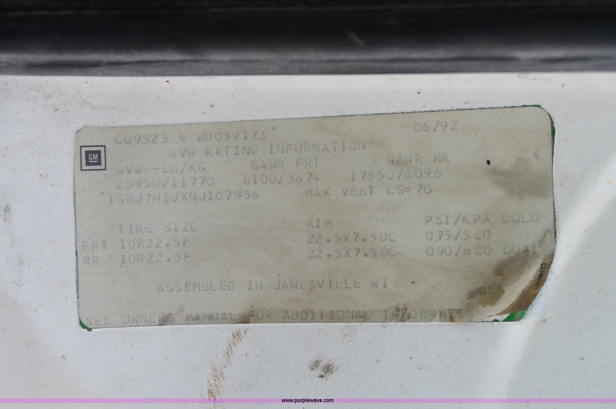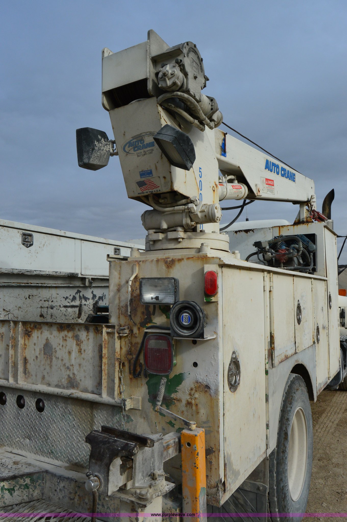 1992 Chevrolet Kodiak service truck. 367,449 miles on odometer Miles may vary, still in use, Caterpillar 3116 7.6L L6 diesel engine, Five speed manual transmission, Two speed rear end, AC and heat, AM/FM/cassette, Manual windows and locks, Cloth interior, PTO driven air compressor, Auto Crane Model 5005H, Dual 35 gallon fuel tanks, Rear work lights, Single rear exhaust stack, Receiver hitch, Air brakes, 11R22.5 tires, Tools, welder, and torch bottles are not included, Interior/exterior cosmetic damage, Unit# 01-487. 1GBJ7H1JXNJ107956. Leo Journagan Construction Company, Inc.. 3651 E Kearney. Springfield, MO 65802