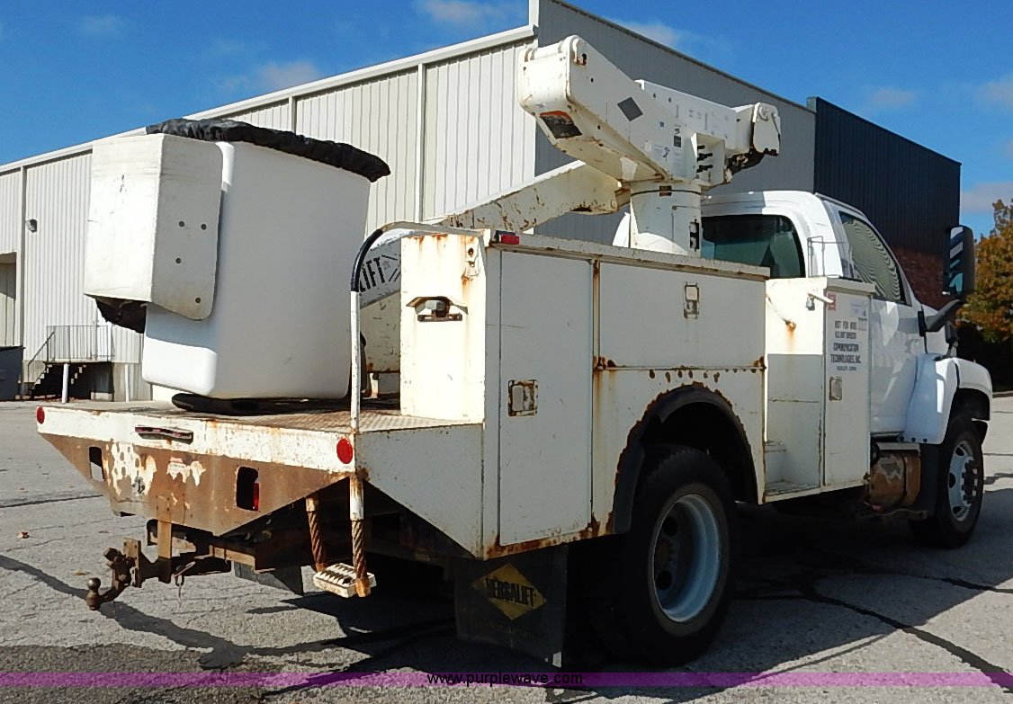 Purple Wave is selling a used Bucket Truck in Kansas. This item is a 2006 Chevrolet C6500 bucket truck with the following: 165,978 miles on odometer, 1,278 hours on meter, 8.1L V8 OHV 16V gas engine, Automatic transmission, AC and heat, Cruise, AM/FM, Manual windows and locks, Cloth interior, Block heater, Utility bed, (8) compartments, Versalift VST4000I bucket, 350 lbs maximum platform capacity, 40' maximum platform height, Insulated boom, Bucket insert and cover, Tow hooks, Strobe light, Pintle hitch, Trailer wiring, 11R22.5 tires, GVWR 25,950 lbs, FAWR 10,000 lbs, RAWR 19,000 lbs, Recently replaced transmission, Scratches, Unit# 626