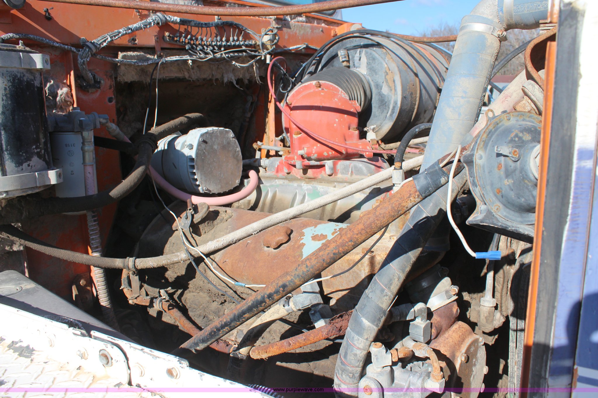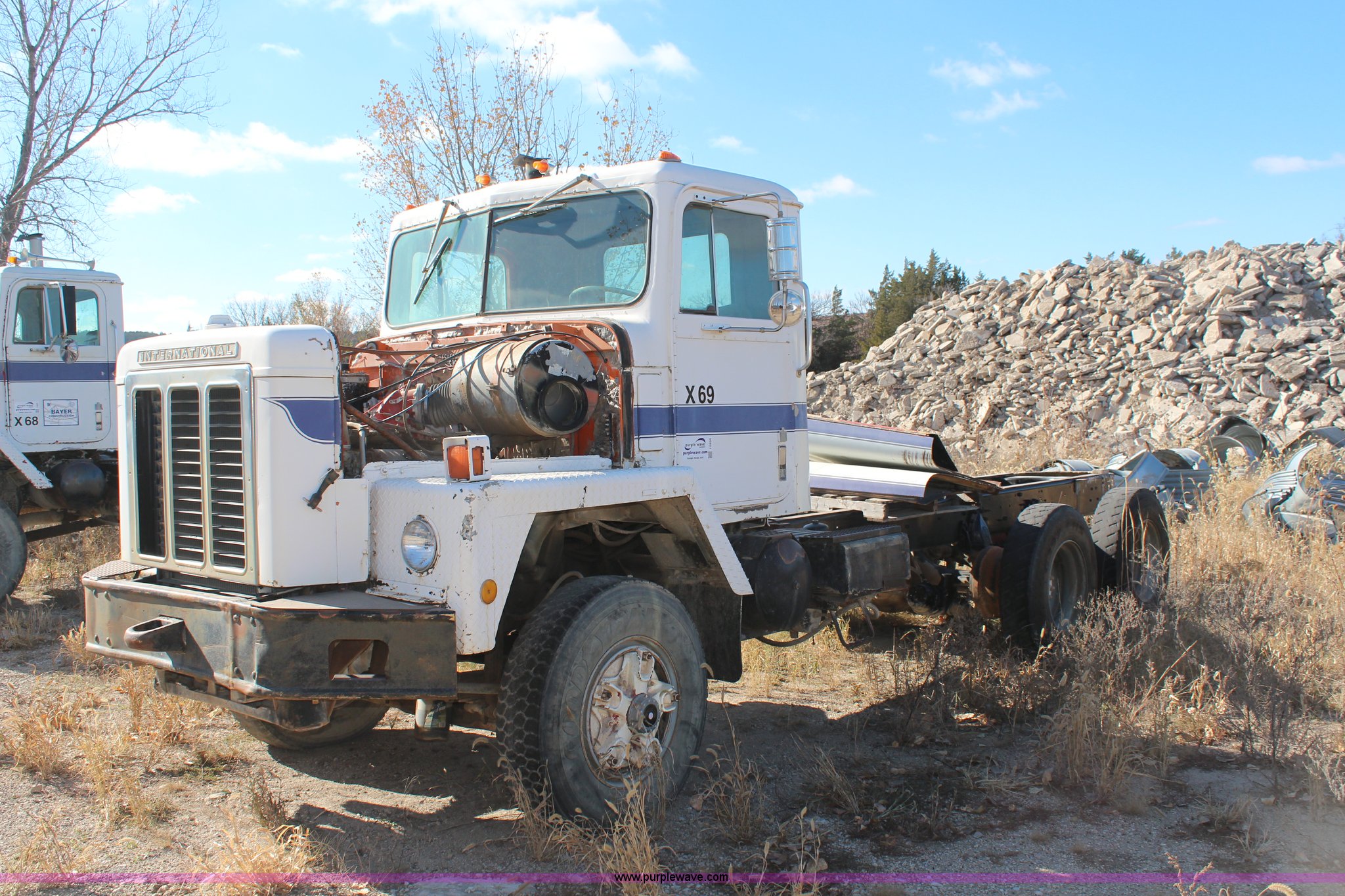 1977 International Paystar 5000 truck cab and chassis. 97,720 miles on odometer, 4,313 hours on meter, Eight cylinder diesel engine, Nine speed manual transmission, Twin screw, Heat, Manual windows and locks, 50 gallon fuel tank, 204" from cab to tail, Spring suspension, Air brakes, 11R22.5 tires, Hood has been removed, Dead batteries, Has not been used in two years, Unit# X69. D3117FGB21525. Bayer Construction Company. 120 Deep Creek Road. Manhattan, KS 66502