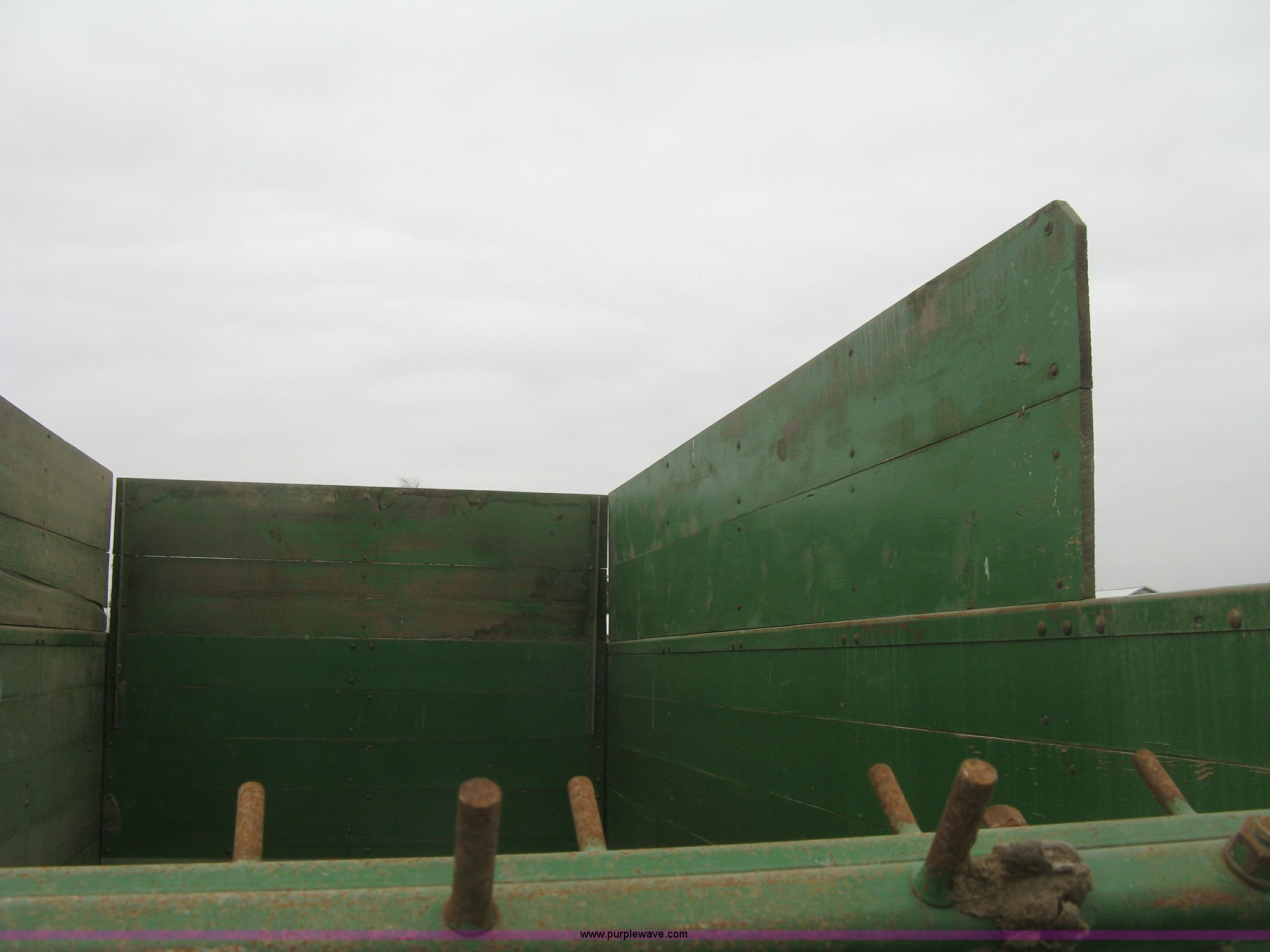 John Deere 125 chuck wagon. Type E0125, 540 PTO, Front and left side discharge, Running gear Type SNE1065, Serial 033950W, Chain drive floor, Unloading chute, 8.50-14 tires, Serial 000081C. Newton, KS 67114