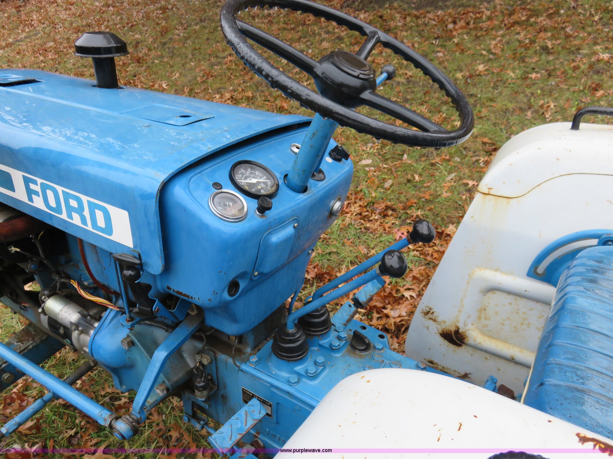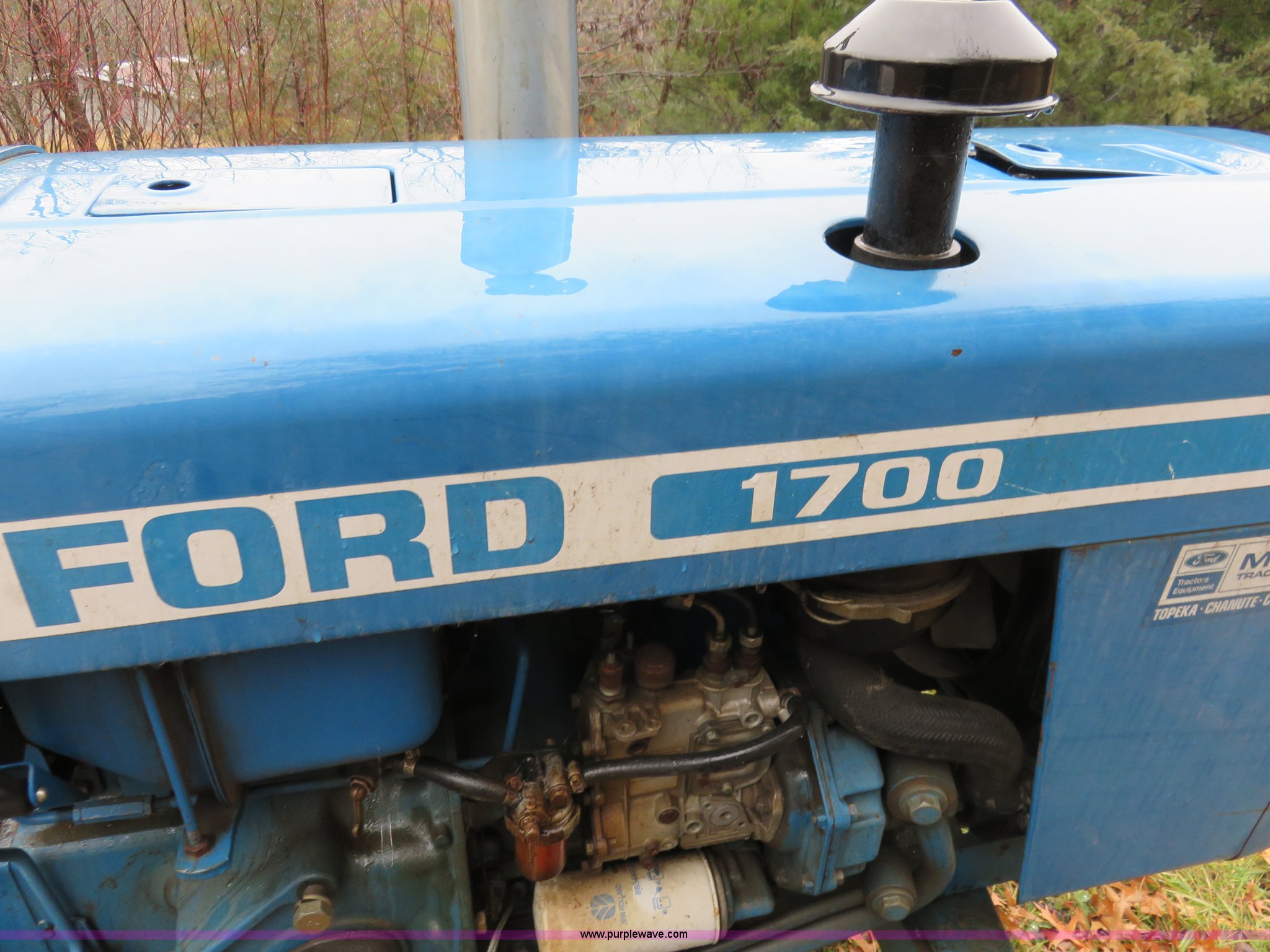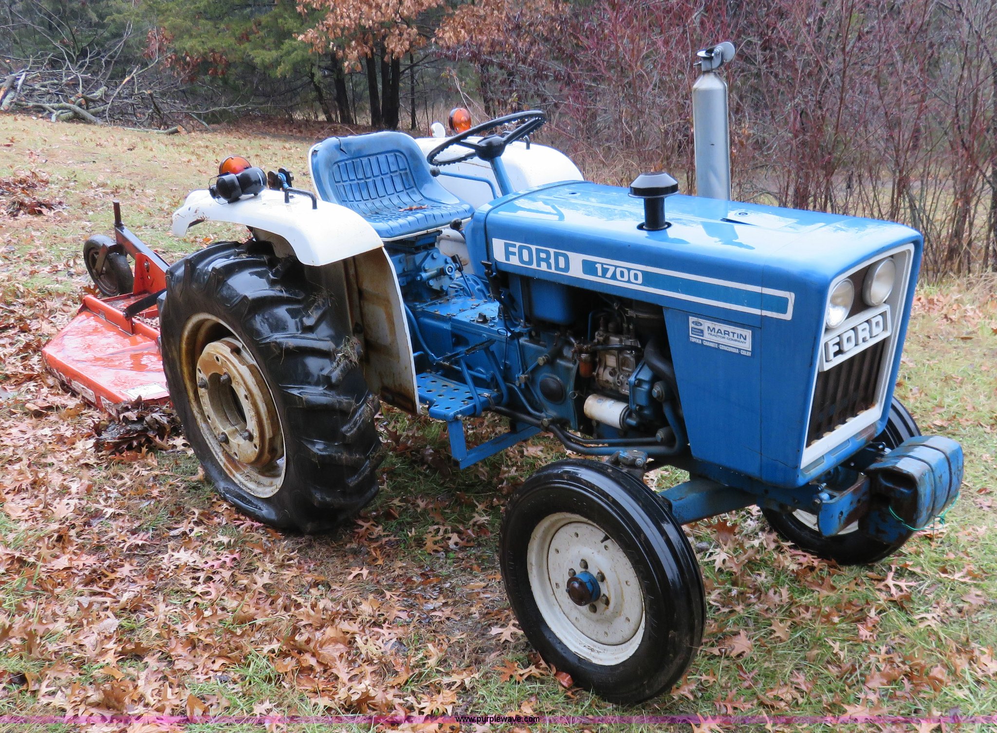 Purple Wave is selling a used Tractor in Kansas. This item is a 1979 Ford 1700 tractor with the following: 673 hours on meter, Shibaura 1.3L two cylinder diesel engine, 25 HP, Manual transmission, 12F-4R gears, Three point, Draw bar, 540 PTO, Taylor-Way rotary mower, Model 24060, 5'W, 540 PTO, Three point, Serial 1006443, 5.8 gallon fuel tank, (3) suitcase weights, Wheel weights, 5.00-15 front tires, 11.2-24 rear tires, Runs rough, Serial U701607