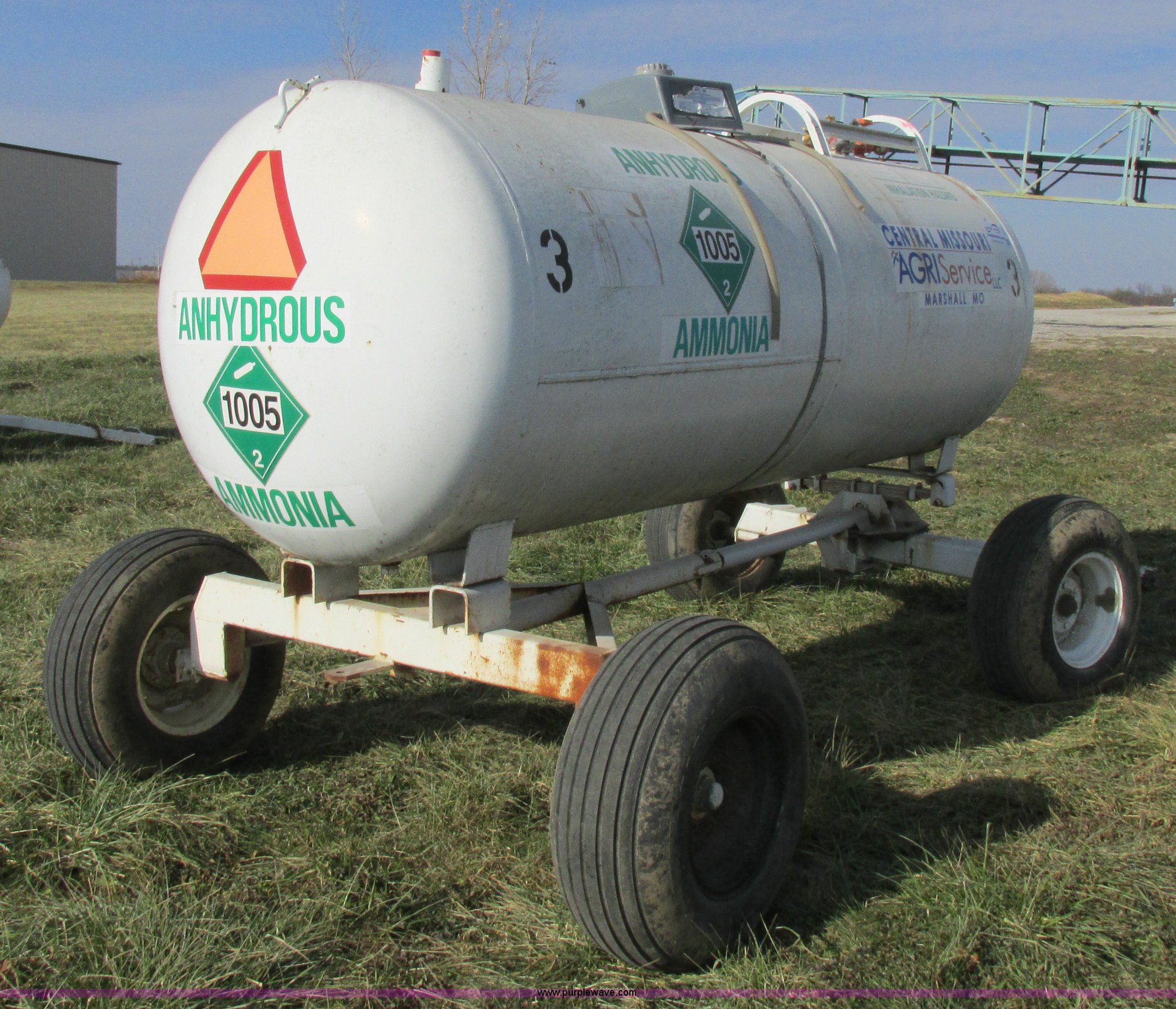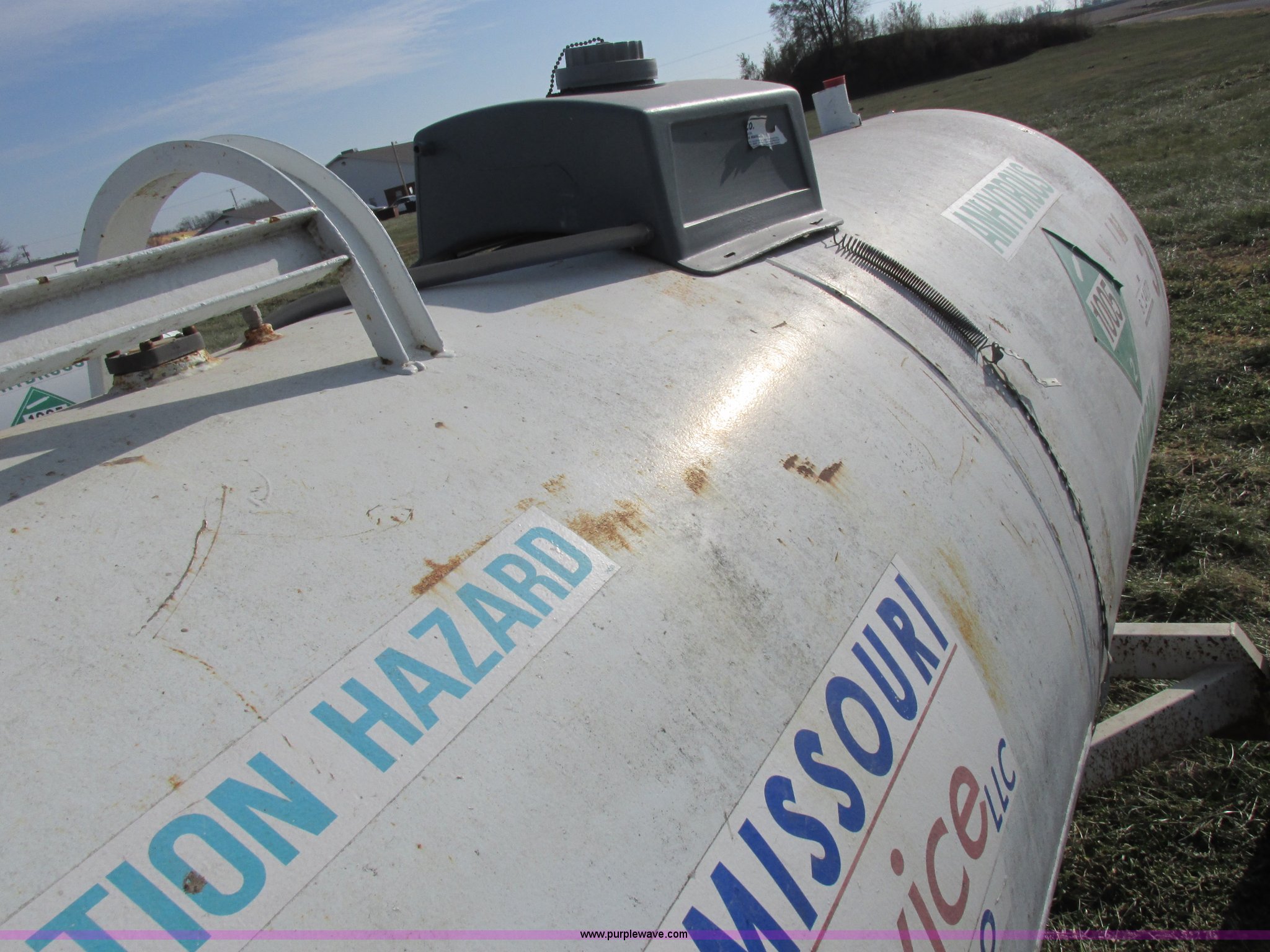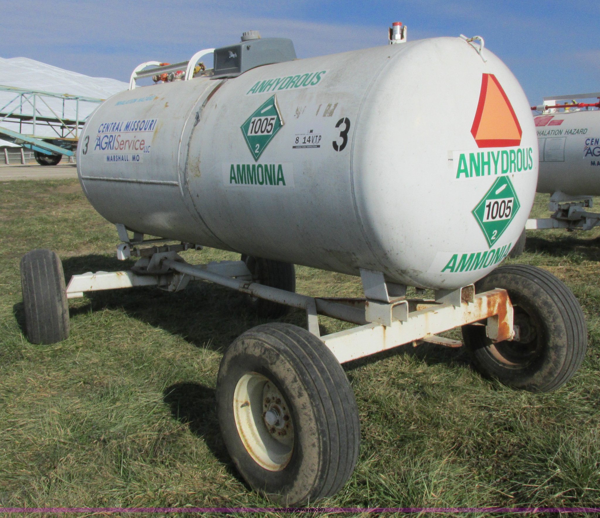 Purple Wave is selling a used Applicator Pull Type in Missouri. This item is a Anhydrous nurse tank with the following: 1,000 gallon capacity, Approx. 11.5' x 54", Pin hitch, 11-15SL tires, DOT inspected, Unit# 3