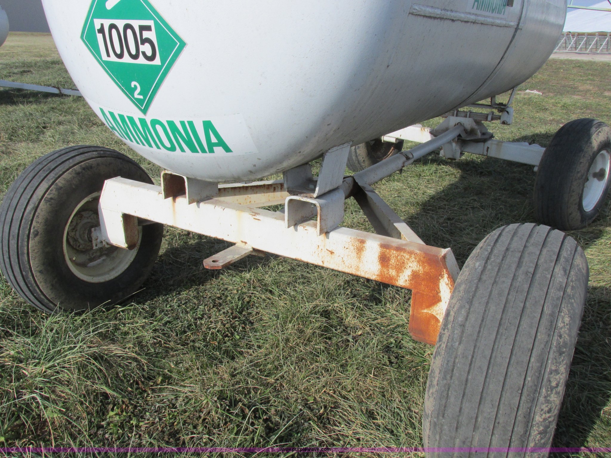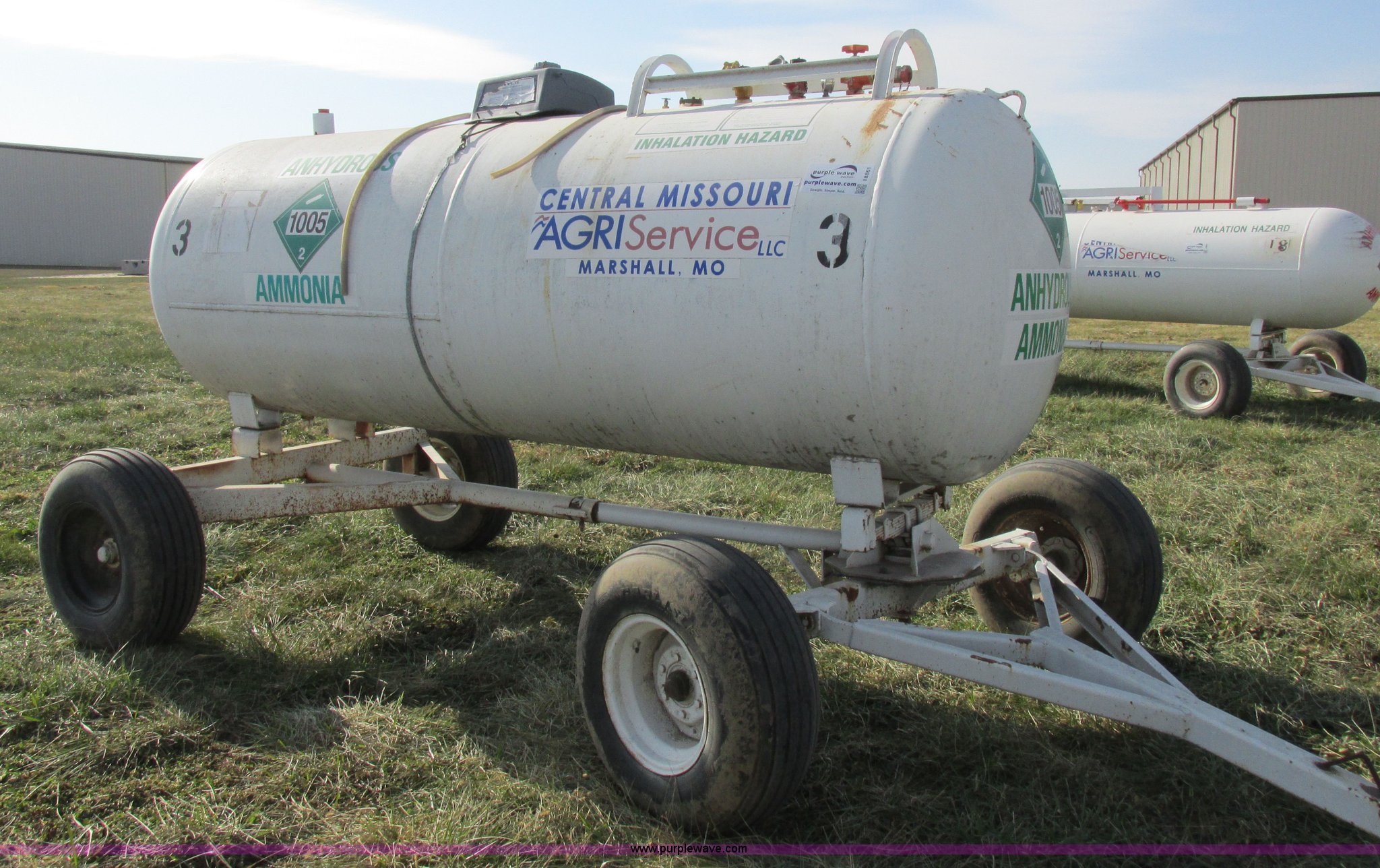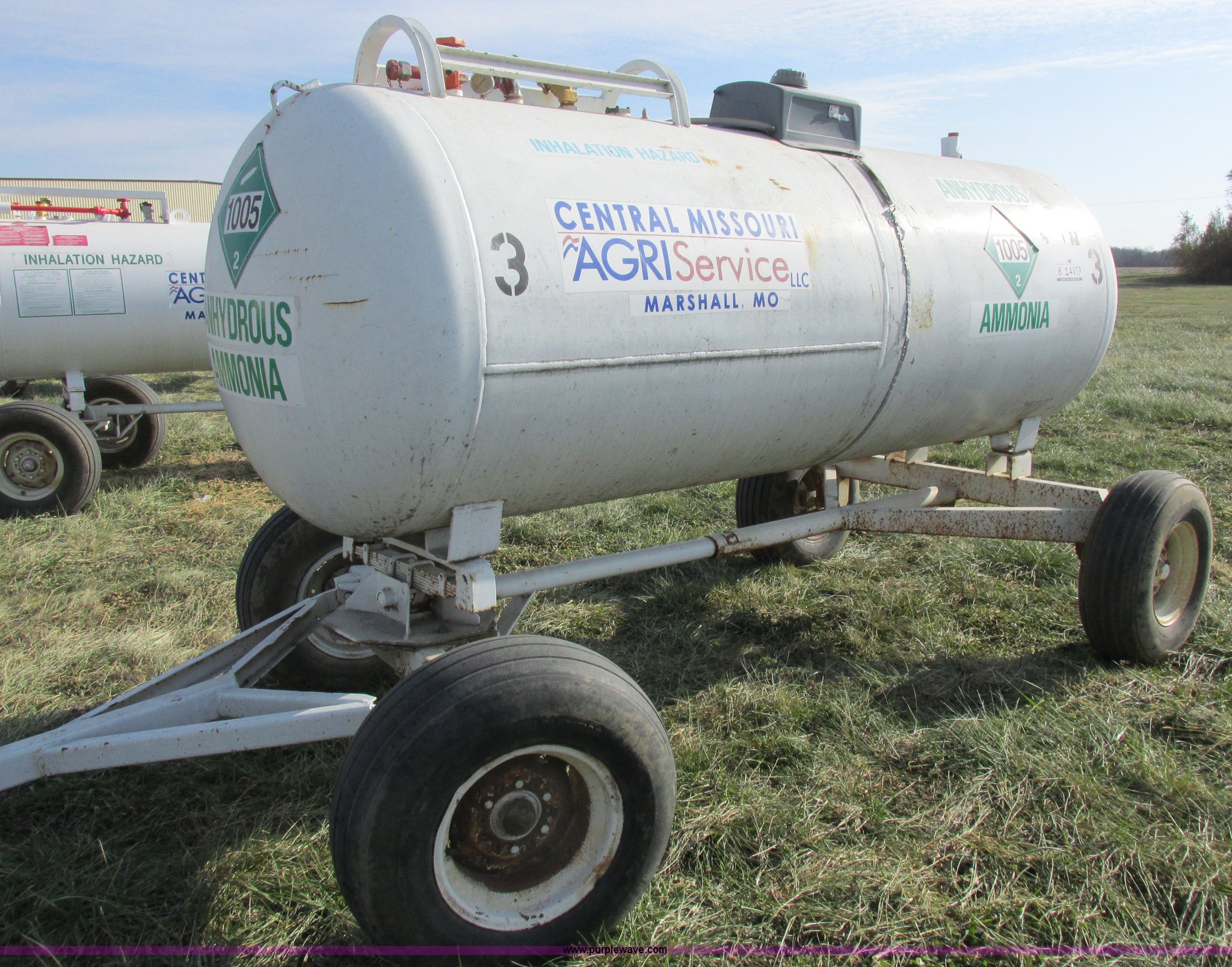 Purple Wave is selling a used Applicator Pull Type in Missouri. This item is a Anhydrous nurse tank with the following: 1,000 gallon capacity, Approx. 11.5' x 54", Pin hitch, 11-15SL tires, DOT inspected, Unit# 3