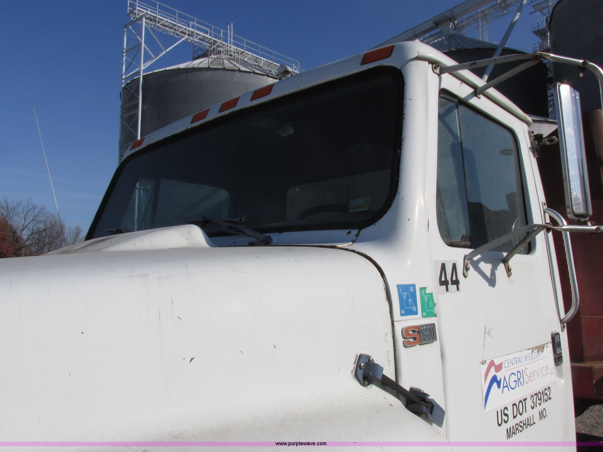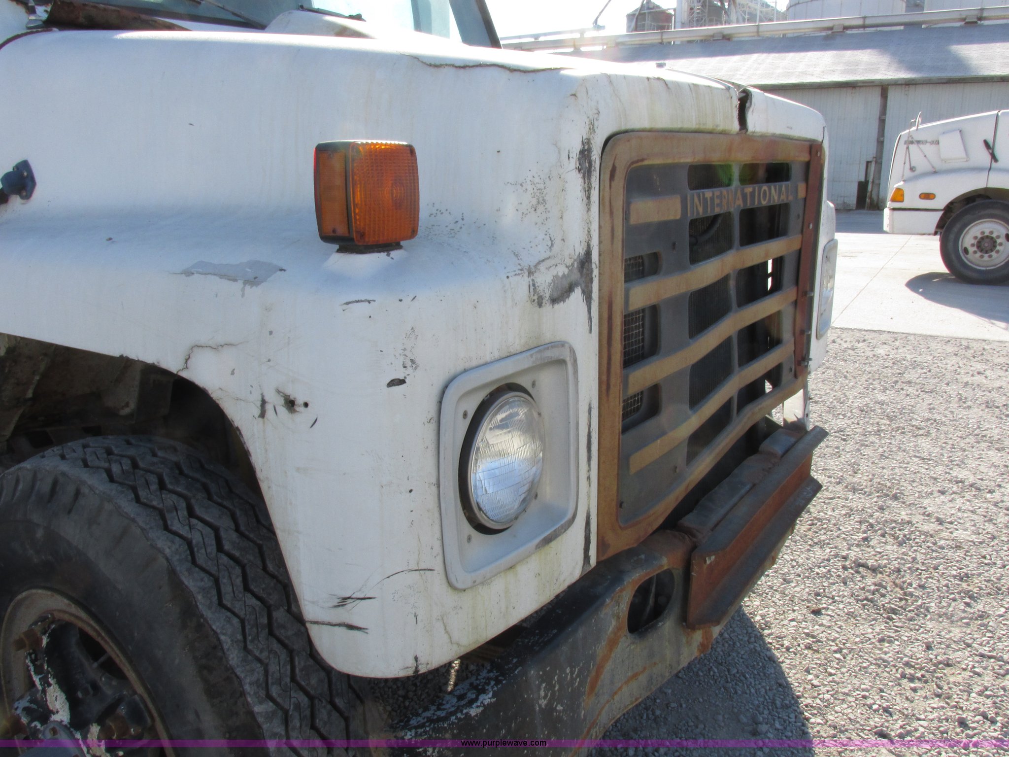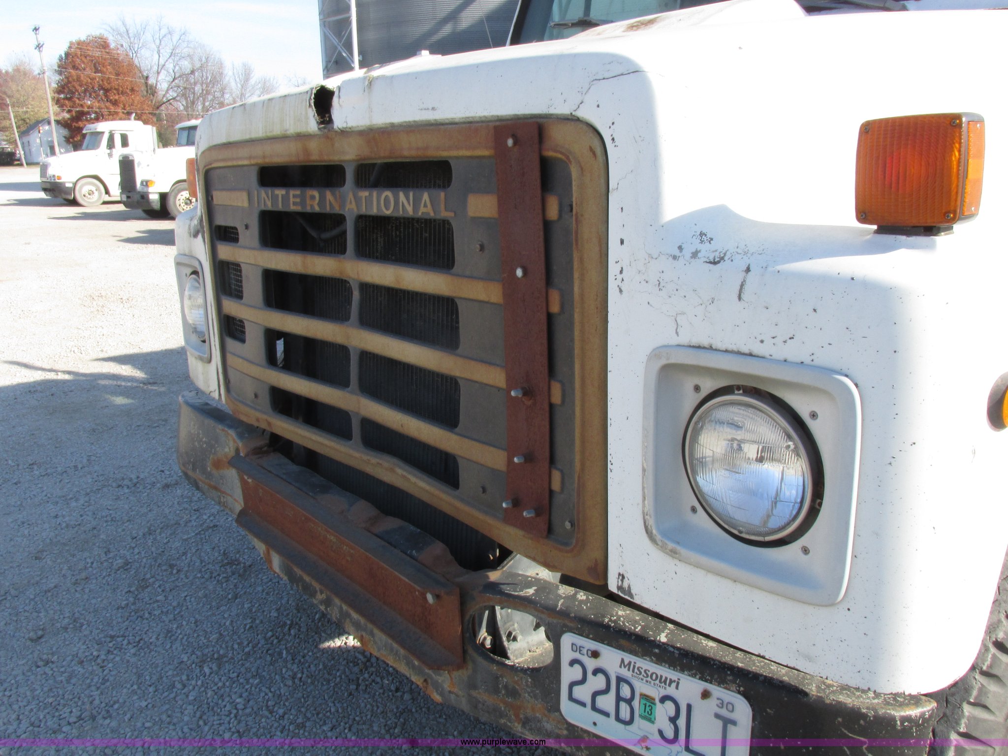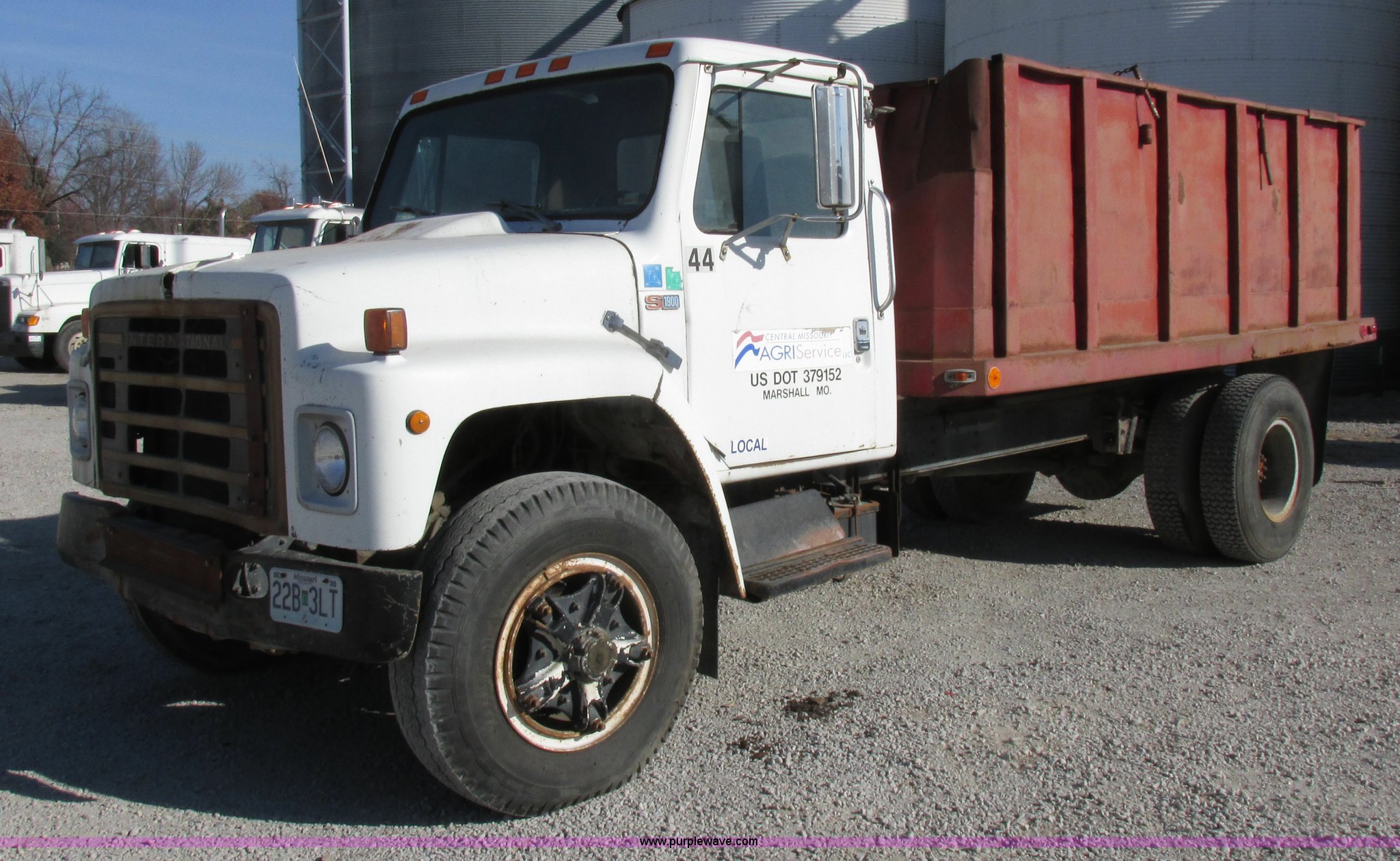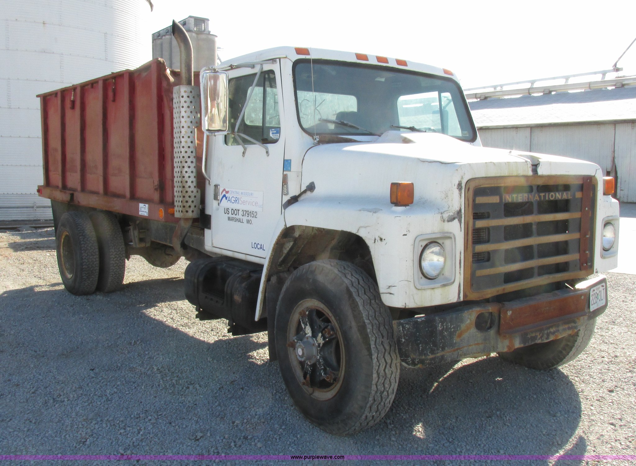 Purple Wave is selling a used Grain Truck in Missouri. This item is a 1986 International 1954 grain truck with the following: 250,676 miles on odometer, International DT466 7.6L L6 diesel engine, Five speed manual transmission, Two speed rear end, Heat, AM/FM/cassette, Spring suspension seat, 15'L x 8'W x 4'H bed, Single ram hoist, Block heater, Trailer wiring, PTO, Spring suspension, Hydraulic brakes, 10R20 tires, Interior/exterior cosmetic damage, Start button inoperable, Unit# 44