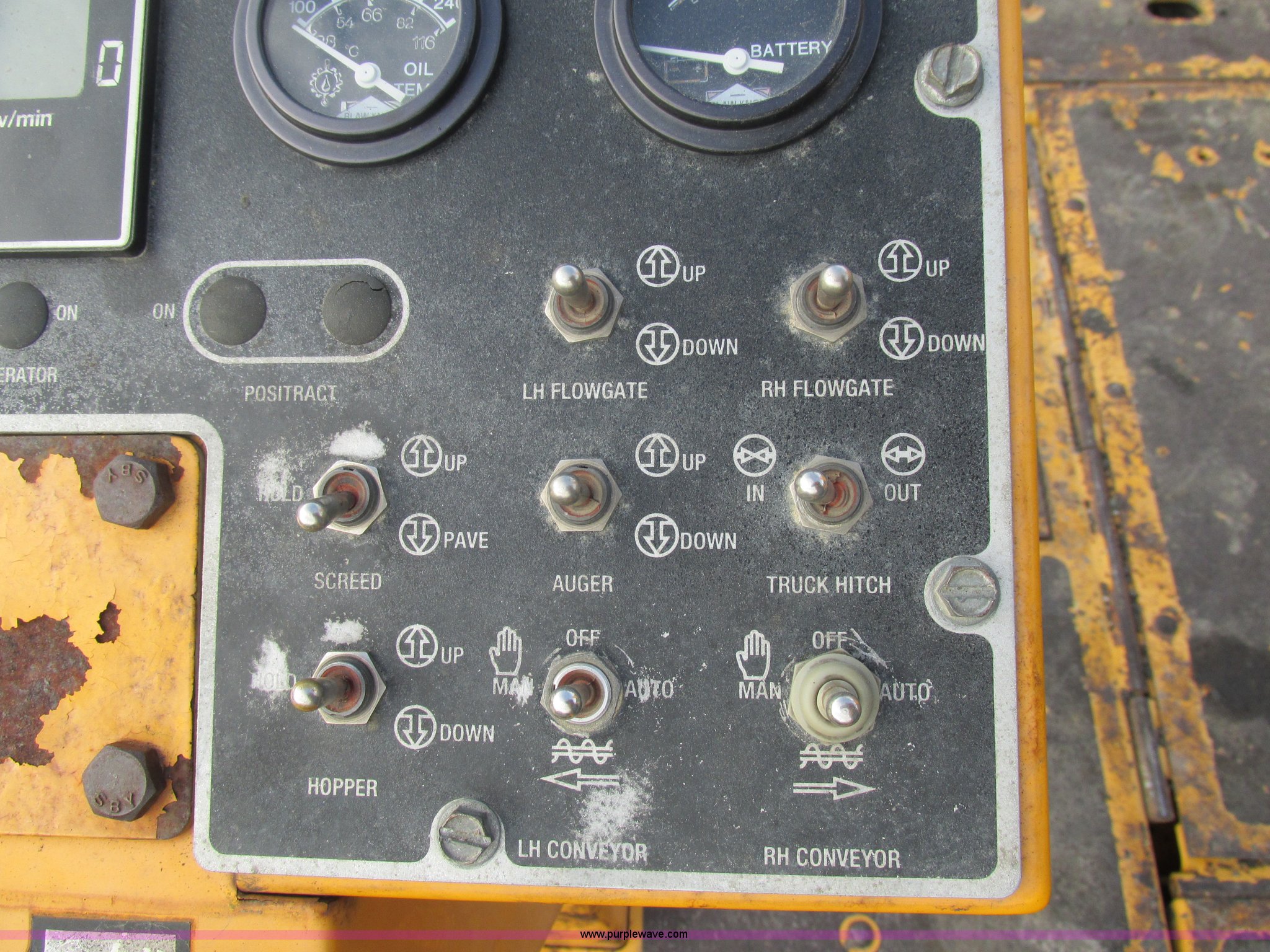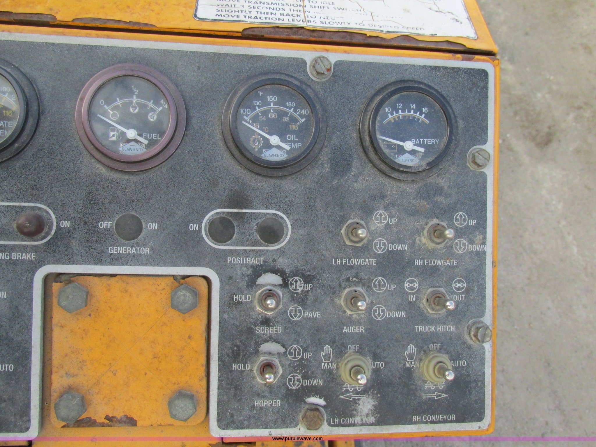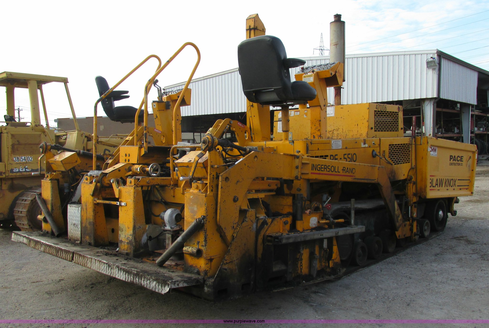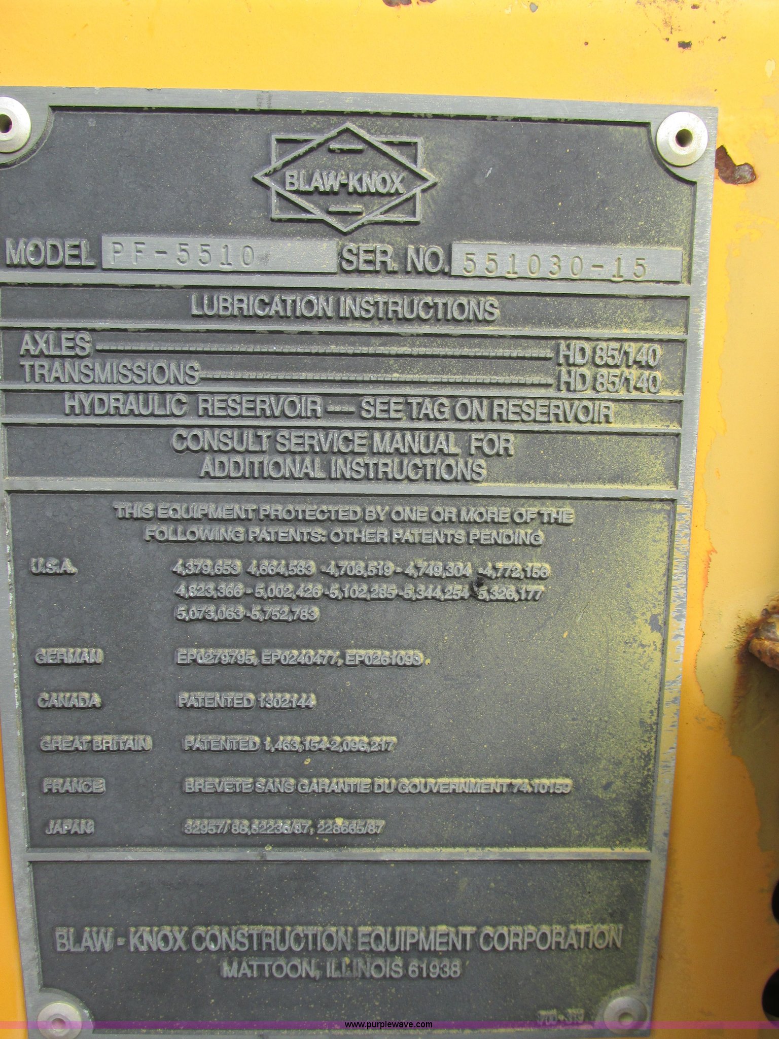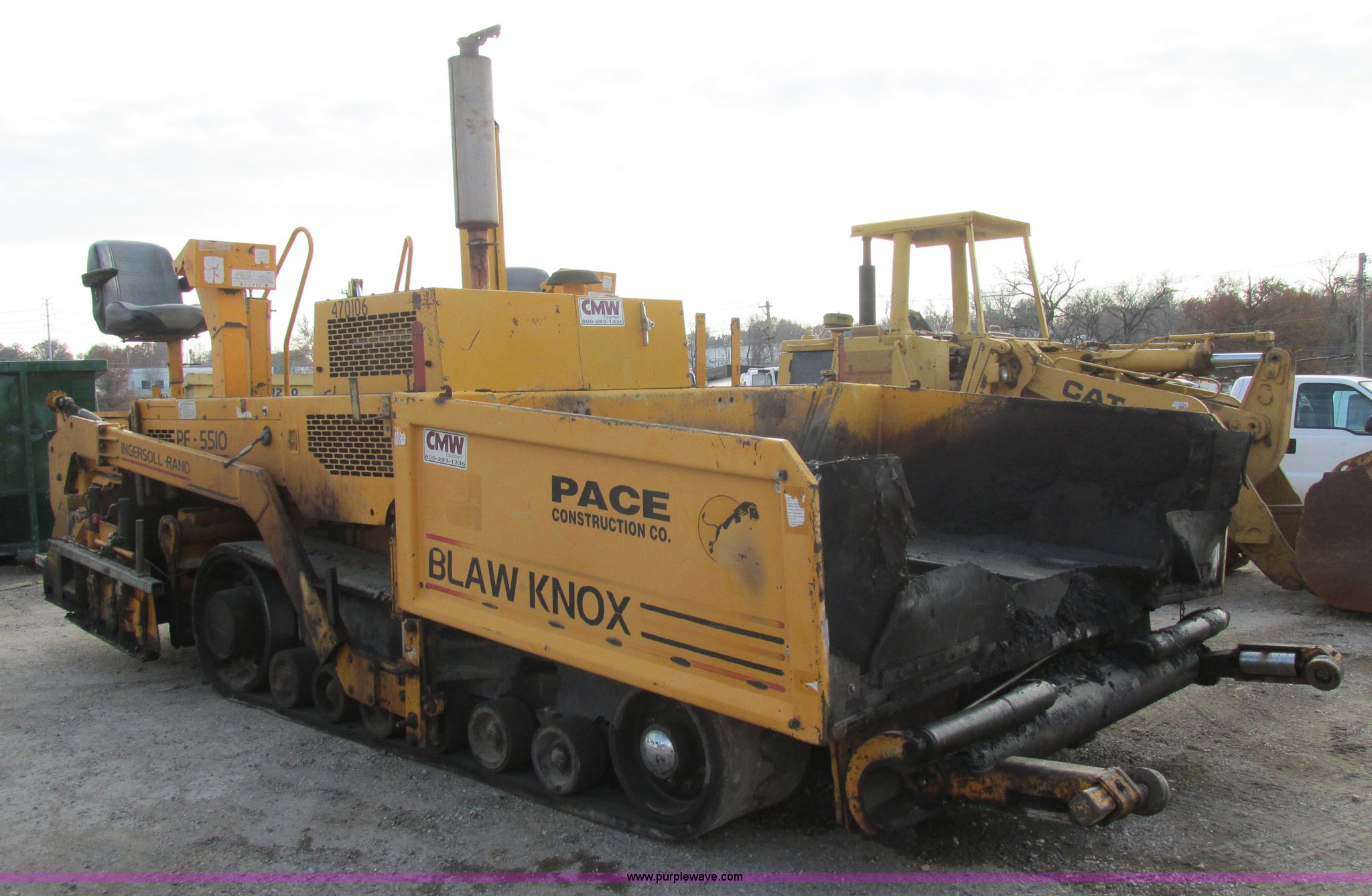 2000 Blaw Knox PF5510 paver. Cummins six cylinder diesel engine, Hydrostatic transmission, Dual operator stations Vandalism covers, Adjustable speed auger, Slope meter, OMNI IIT-A screed Serial 105C2A602, Goodyear Trackman 19"W tracks, 36,950 lbs. base operating weight, Serial 55103015. Pace Construction. 1620 Woodson Road. St. Louis, MO 63114