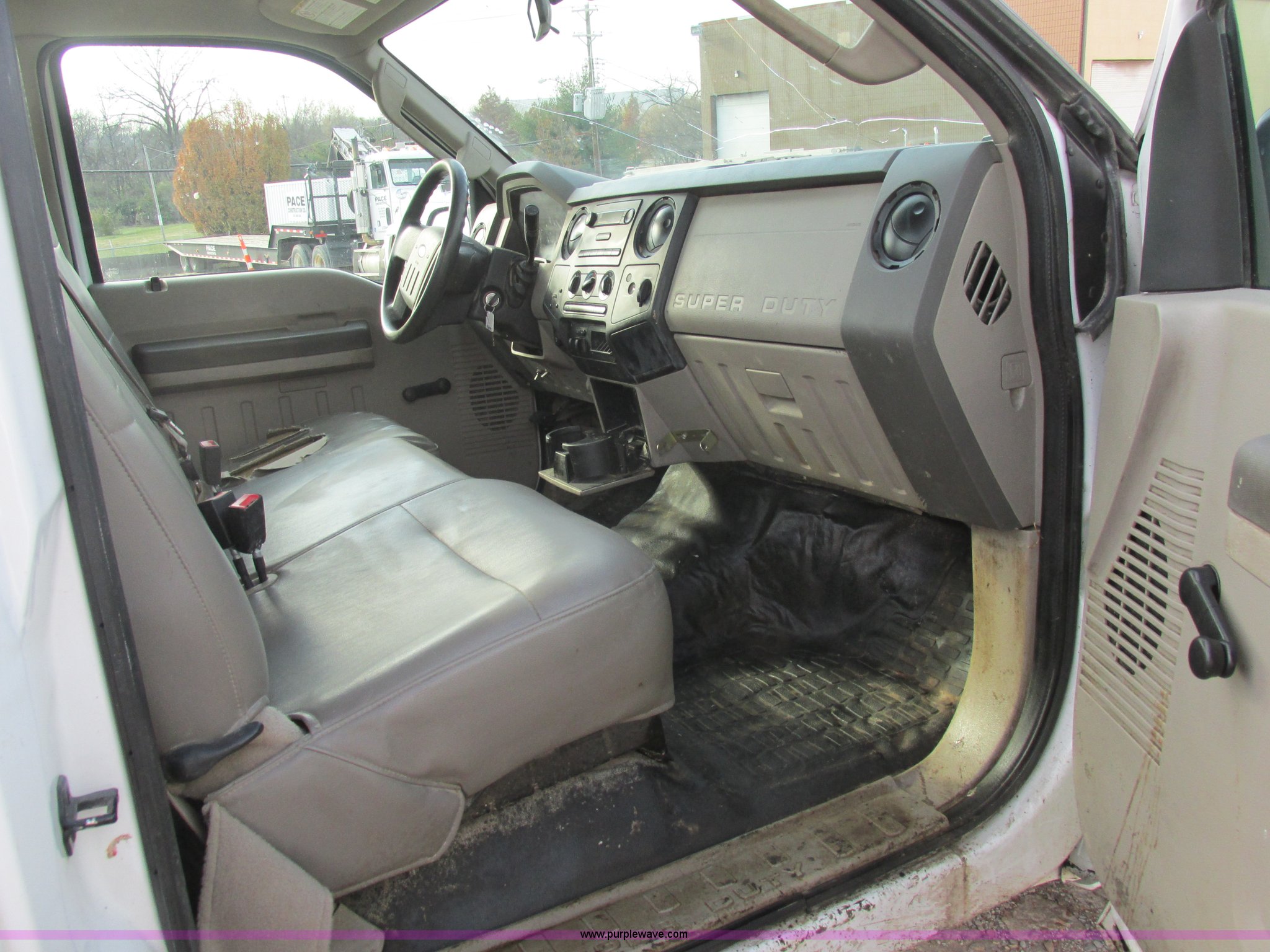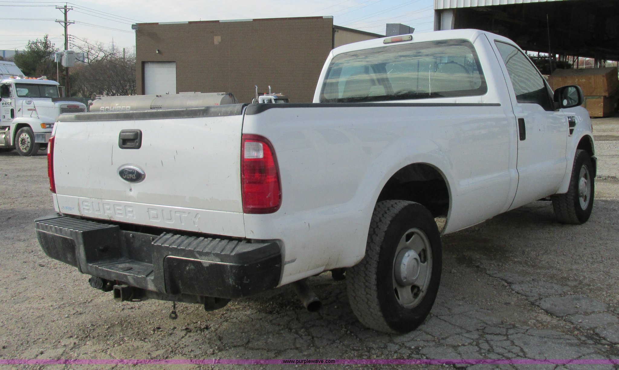 2008 Ford F250 Super Duty XL pickup truck. 226,630 actual miles, 5.4L V8 SOHC 16V gas engine, Automatic transmission, AC and heat, AM/FM, Manual windows and locks, Vinyl interior, Factory trailer brake controller, Receiver hitch, Trailer wiring, 137" wheelbase, 245/75R17 tires, Windshield cracked, Interior/exterior cosmetic damage. 1FTNF20518EA02415. Pace Construction. 1620 Woodson Road. St. Louis, MO 63114