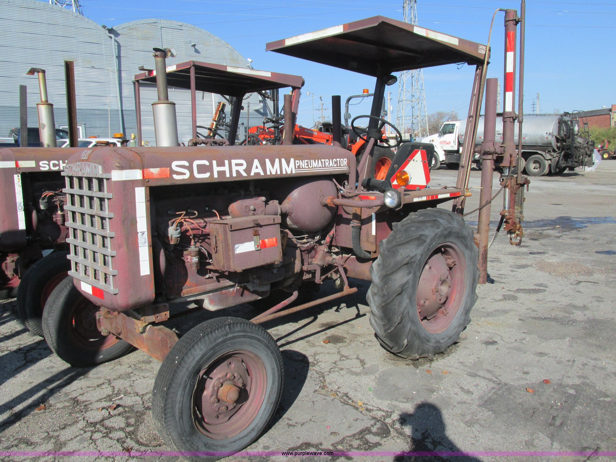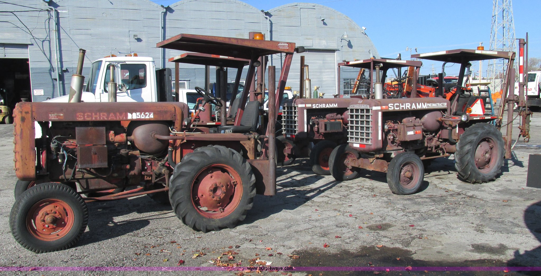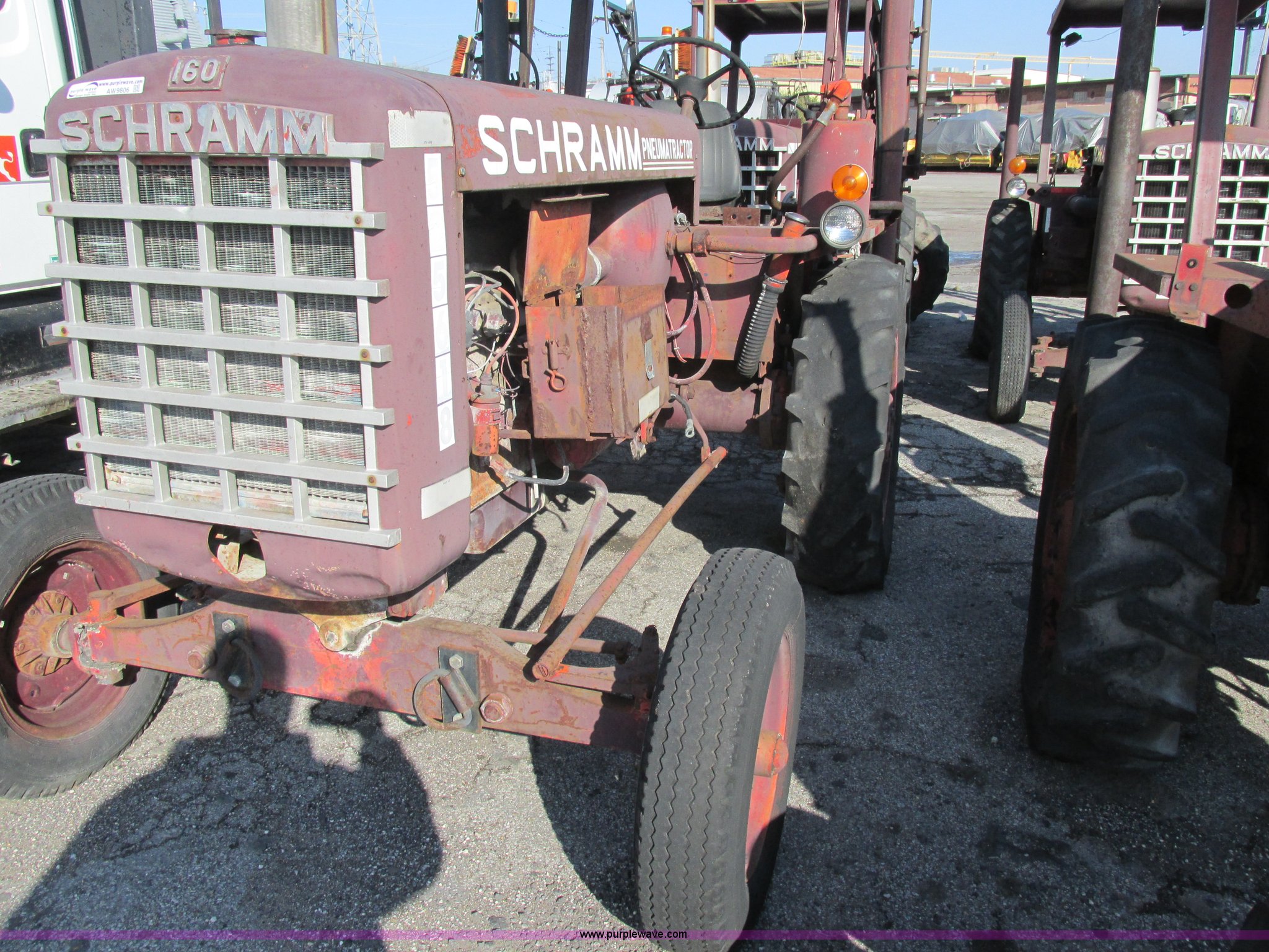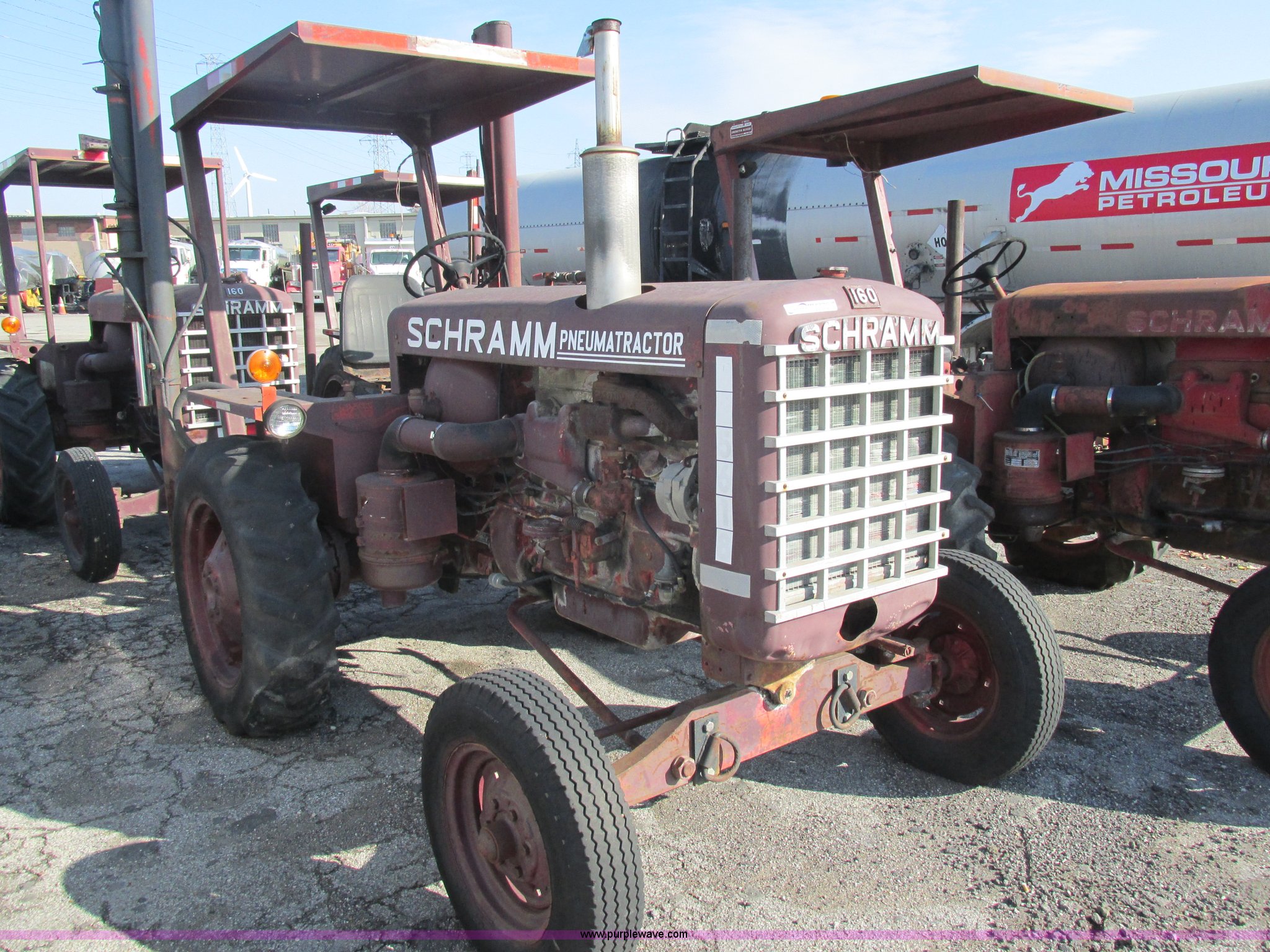 Purple Wave is selling a used Tractor in Missouri. This item is a (4) Schramm 160 Pneumatractors with the following: Schramm 160 Pneumatracor, 3,254 hours on meter, Gas engine, Four speed manual transmission, Canopy, Built-in air compressor, Dual rear hydraulic cylinders, 6.00-16LT front tires, 11.2-24 rear tires, Serial 3-213278, Unknown running condition, Schramm 160 Pneumatractor, 393 hours on meter, Gas engine, Four speed manual transmission, Built-in air compressor, Pin hitch, 6.50 x 16 LT front tires, 11.24 x 24 rear tires, Serial 5213282, Unknown running condition, Schramm 160 Pneumatractor, 2,853 hours on meter, Gas engine, Four speed manual transmission, Hydraulic cylinder with hammer, 6.00-6 front tires, 12.4-24 rear tires, One tire flat, Serial 5213281, Schramm 160 Pneumatractor, 1,941 hours on meter, Gas engine, Four speed manual transmission, Canopy, Built-in air compressor, 6.00-16 front tires, 12.4-24 rear tires, Serial 51212171, Additional wheel included, Spare parts
