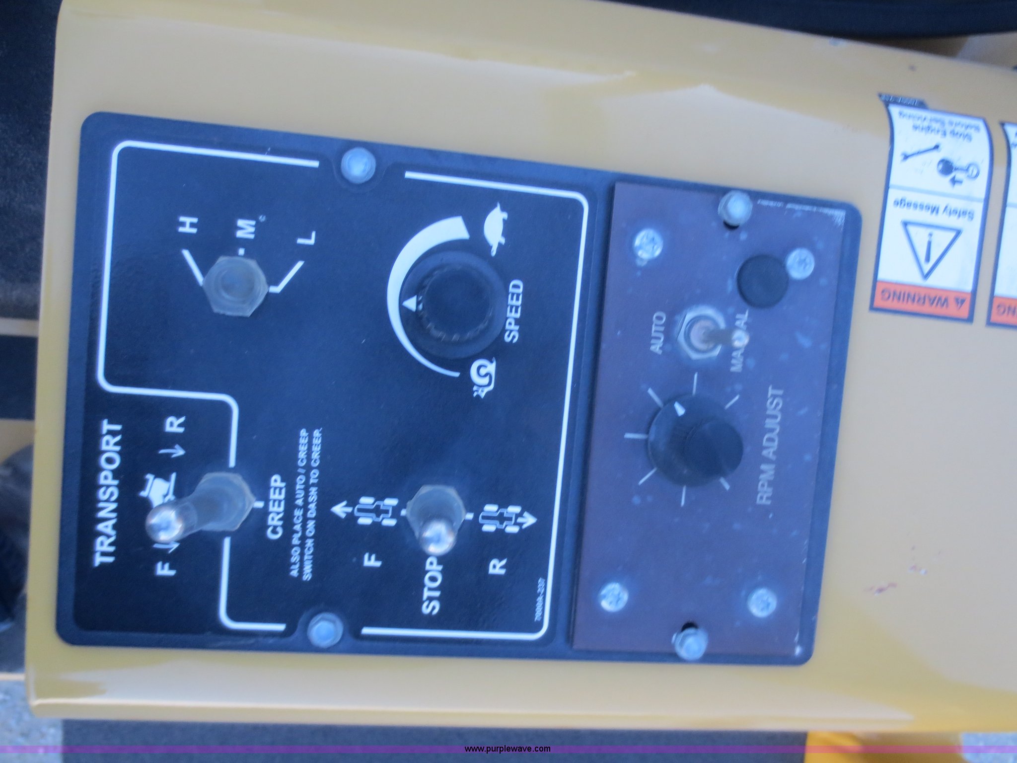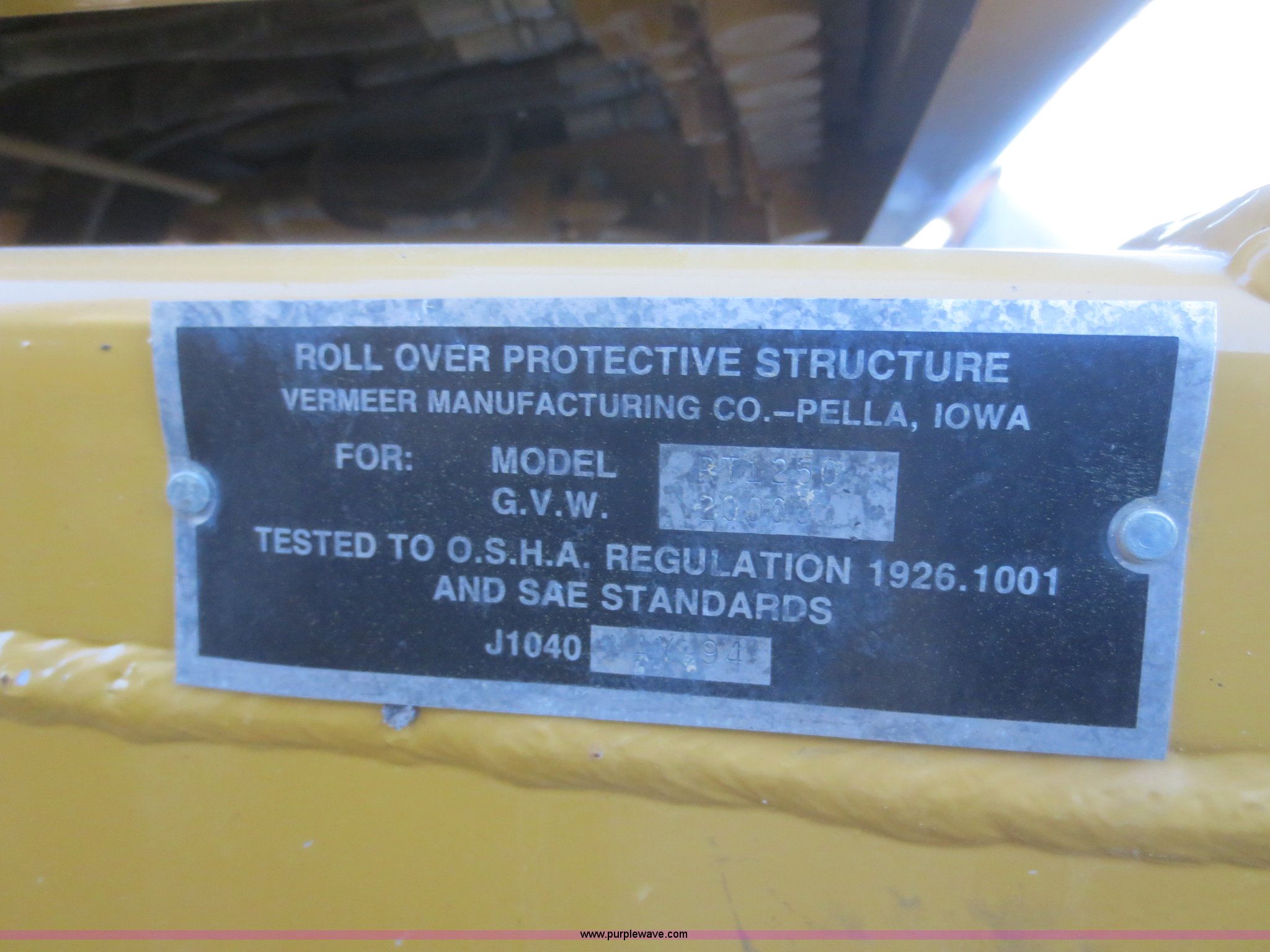 Purple Wave is selling a used Trencher or Rock Saw in Kansas. This item is a 2006 Vermeer RT1250 rock saw with the following: 190 actual hours, Cummins 3.9L four cylinder turbo diesel engine, 120 HP, Hydrostatic transmission, Locking differential, Four wheel drive, Four wheel steer with crab, OROPS, Vermeer RW1240 rock saw, 6"W carbide teeth, 42" maximum digging depth, Serial 1VR4110R461000136, Cold weather hydraulic pump bypass, (29) counter weights, Front auxiliary hydraulics, 80"W back fill blade, Six way, 38 x 18.00-20NHS tires, 18,361 lbs. base operating weight, Unit has been stored inside, One owner, Serial 1VR4112E861000201