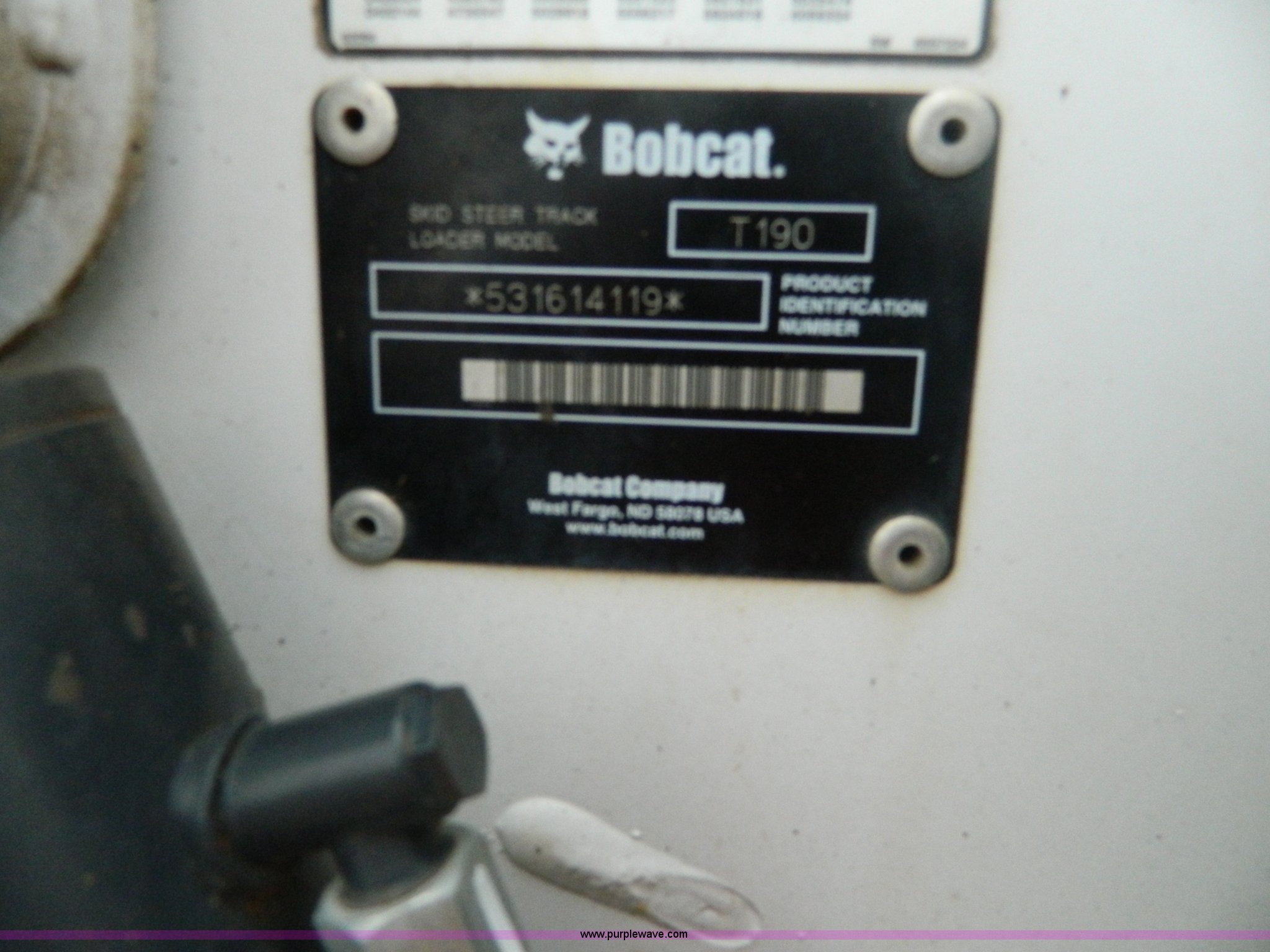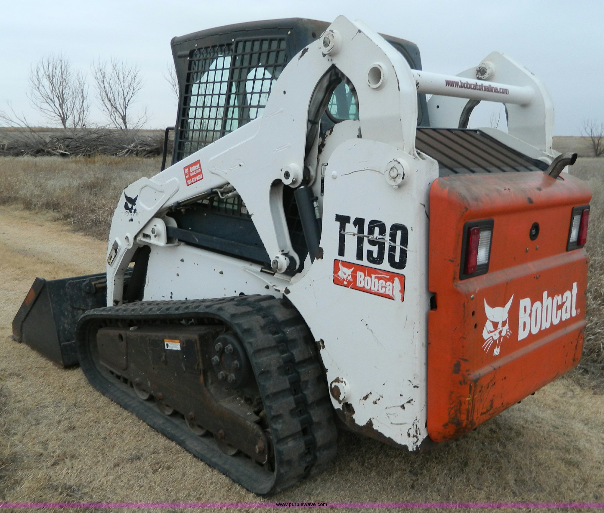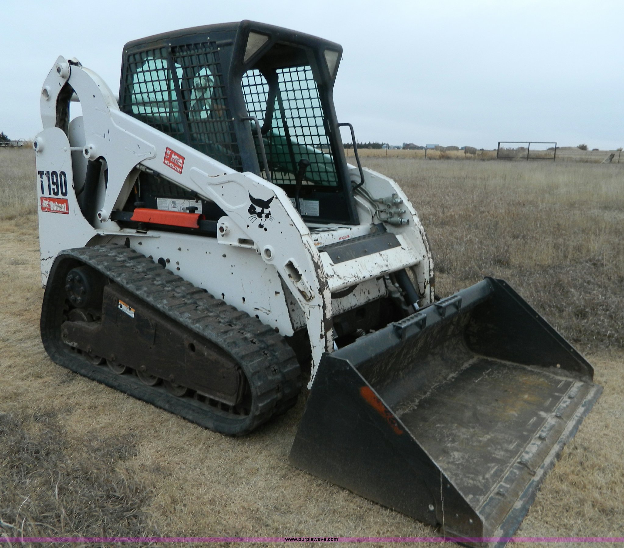 Purple Wave is selling a used Tracked Skid Steer Loader in Kansas. This item is a 2007 Bobcat T190 skid steer with the following: 1,360 hours on meter, Kubota V2403 four cylinder diesel engine, Serial 06G0408, Glow plugs, Side glass, Back glass, Hand and foot controls, EMS panel, Spring suspension seat, Front and rear work lights, Auxiliary hydraulics, 67"W bucket, Weld-on cutting edge, (4) rollers, 12"W tracks, 7,775 lbs. base operating weight, Serial 531614119