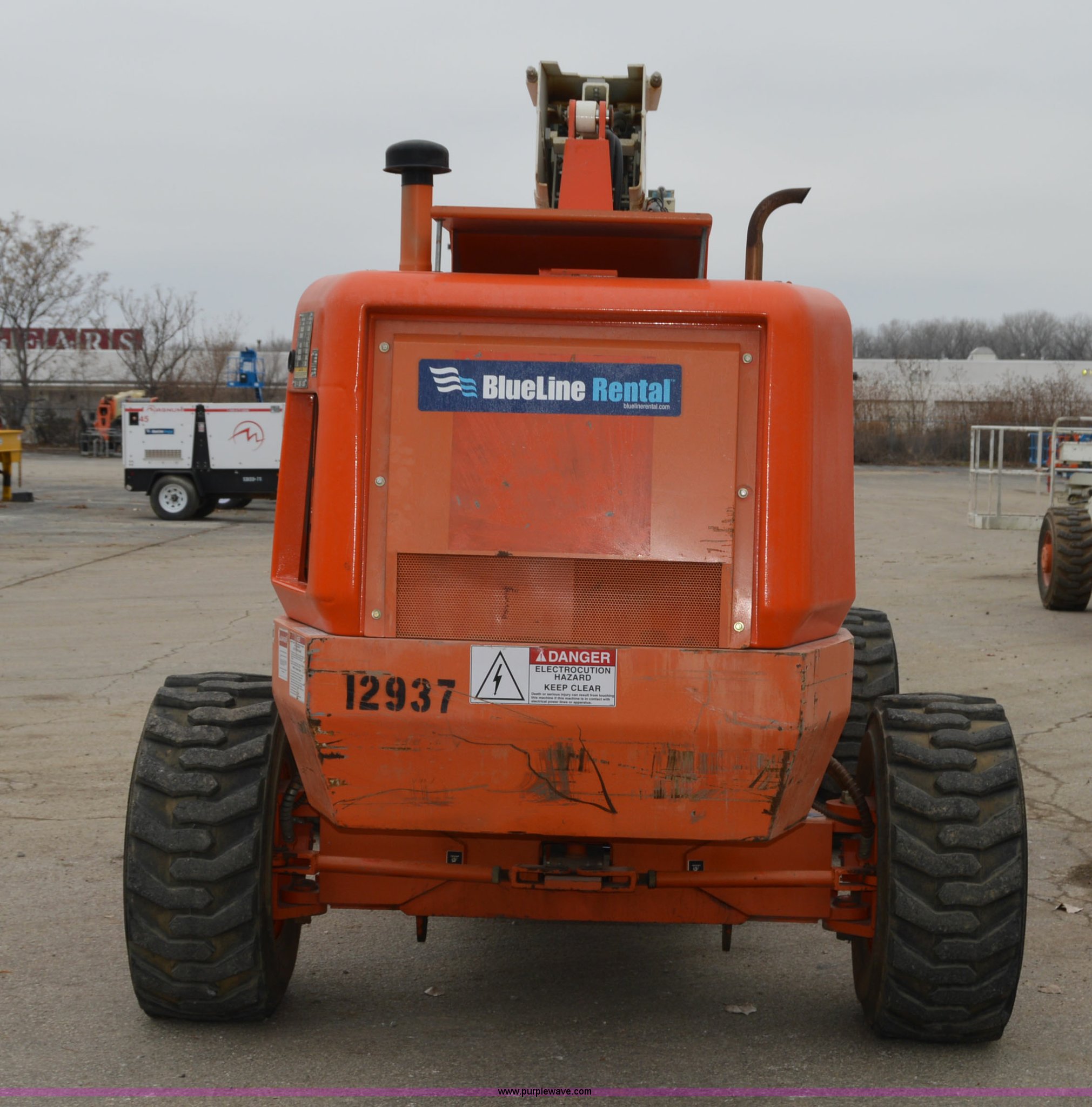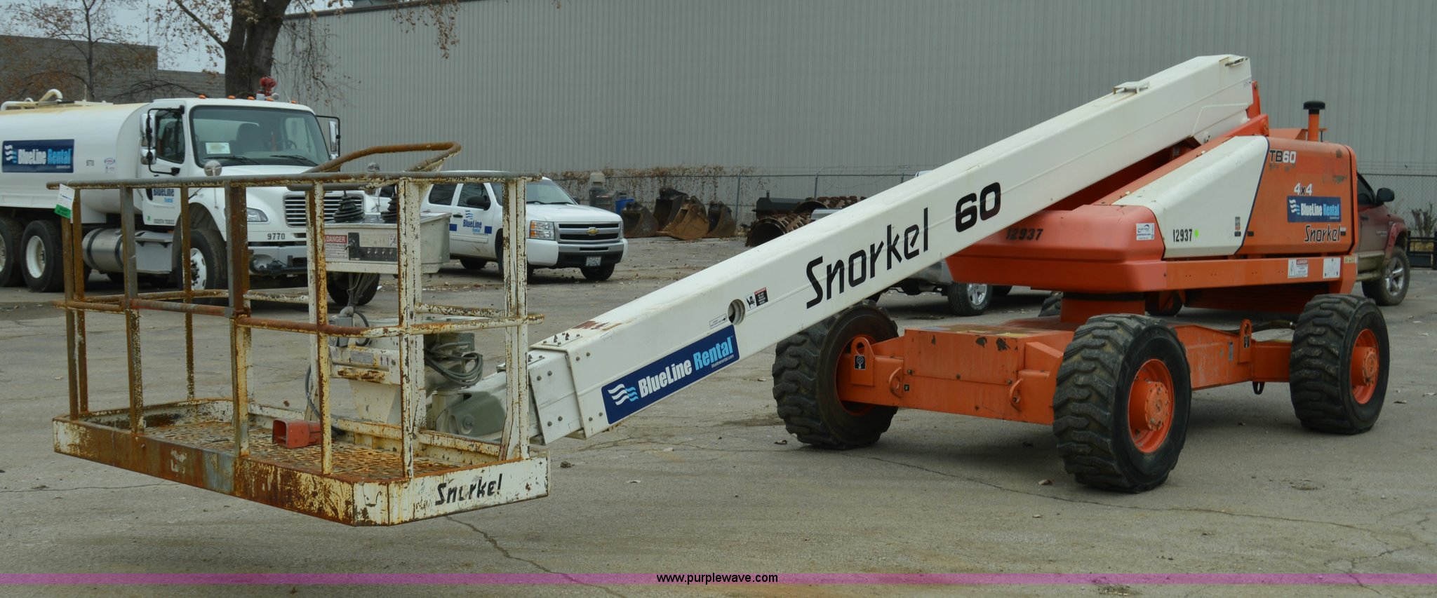 2007 Snorkel TB60 boom lift. 2,292 hours on meter, Four cylinder diesel engine, Four wheel drive, 500 lbs maximum lift capacity, 60' maximum platform height, 49.9' maximum platform reach, Power to platform, Ground and platform controls, Three mile per hour maximum travel speed, 13" ground clearance, 102" wheelbase, 15-19.5 foam filled tires, Serial 0I07182, Unit # 12937. Blueline Rental. 4120 East Front Street. Kansas City, MO 64120