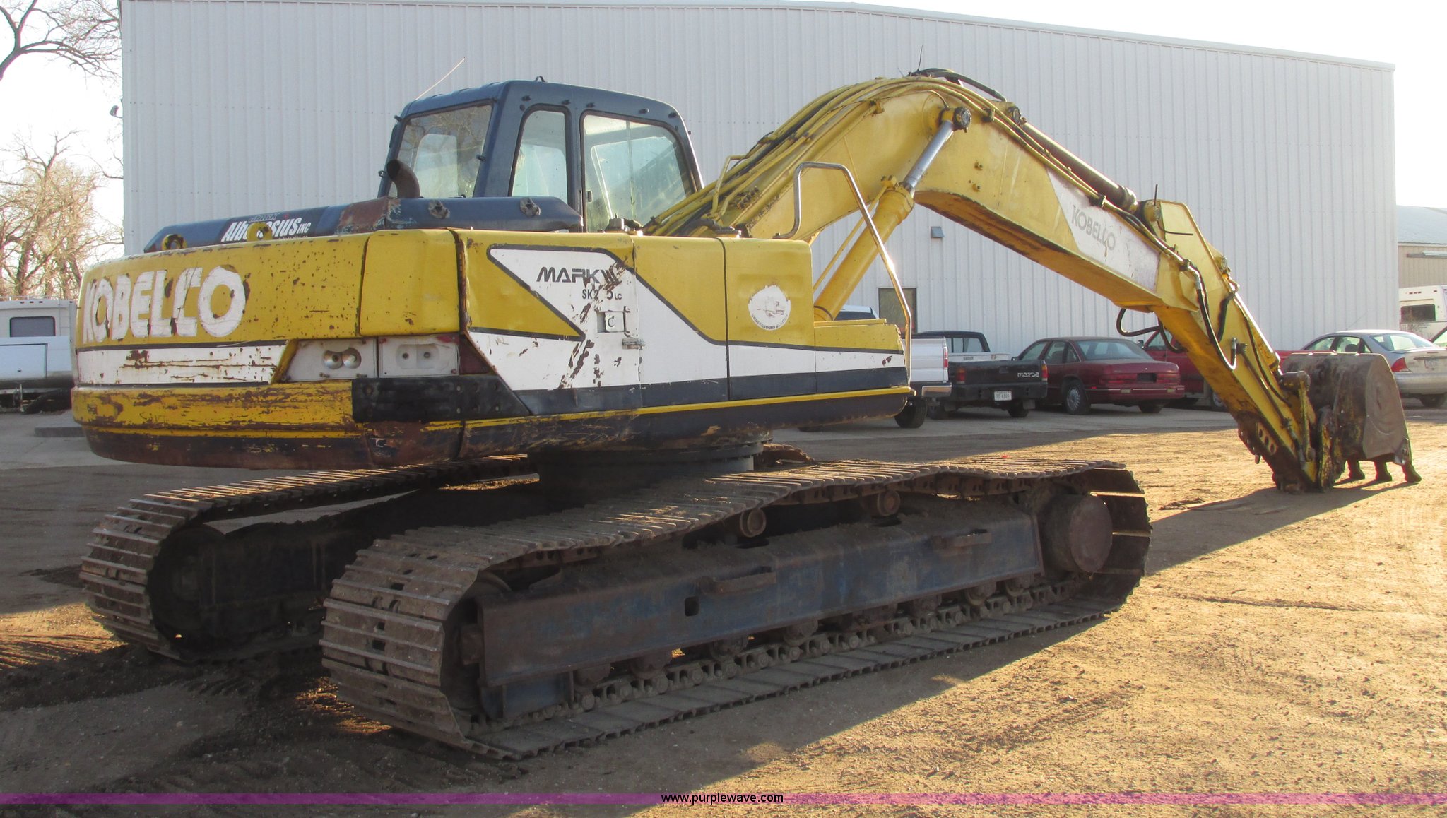 Purple Wave is selling a used Hydraulic Excavator in Nebraska. This item is a 1992 Kobelco SK200LC Mark III excavator with the following: 7,698 hours on meter, Actual hours unknown, Mitsubishi six cylinder turbo diesel engine, Two speed hydrostatic transmission, EROPS, Heat, Spring suspension seat, Joystick controls, Front and rear work lights, Rear lights damaged, Standard boom, 12'2.5" stick length, 30.5' maximum reach, Hensley 39"W bucket, (4) weld-on cutting teeth, Hydraulic quick coupler, Auxiliary hydraulics, JB manual thumb, 48"L x 22"W, Thumb detached, but included,, Eight bottom rollers, 31.5"W steel triple grouser track pads, 44,500 lbs. base operating weight, Unit does not track straight, Drive chain replaced Spring 2013, Sprockets replaced Spring 2014, Boom cylinder replaced Summer 2014, Serial YQU0892