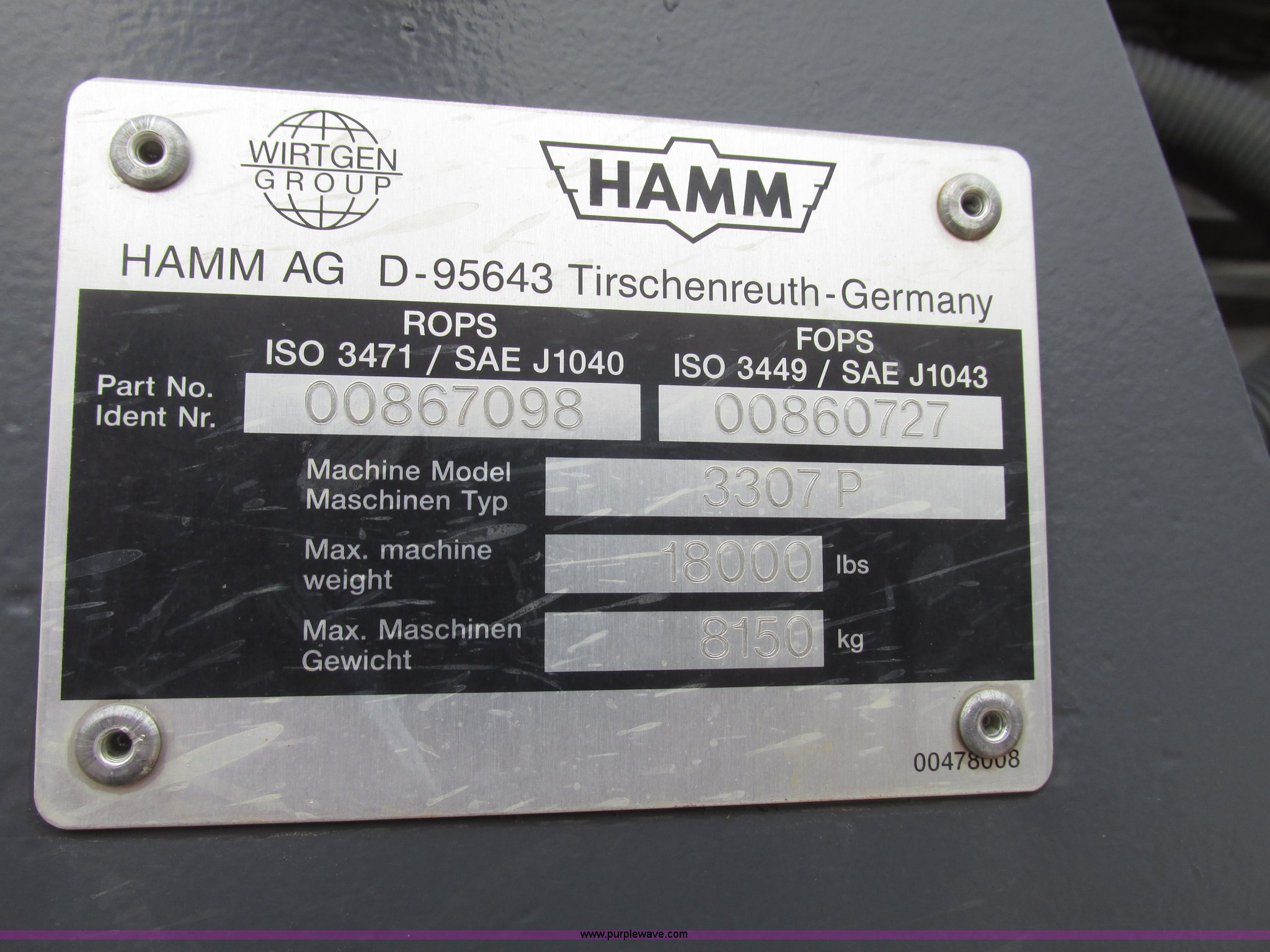 Purple Wave is selling a used Single Drum Roller Compactor in Iowa. This item is a 2004 Hamm 3307P articulated pad foot roller with the following: 1,355 hours on meter, Deutz BF4M1011F 2.914L four cylinder turbo diesel engine, Serial 00801371, Hydrostatic transmission, ROPS, Tilt steering, Swivel seat, Digital instrument panel, Weather cover, Dual side step entry, Approximately 66"W drum, Two speed drum vibration, 3.1" pad height, 46 gallon fuel tank, Master battery disconnect, 9.2' to top of ROPS, 18,000 lbs maximum machine weight, 14.9-24 tires, 14,594 lbs. base operating weight, ROPS serial 00867098, FOPS serial 00860727, Serial 50659