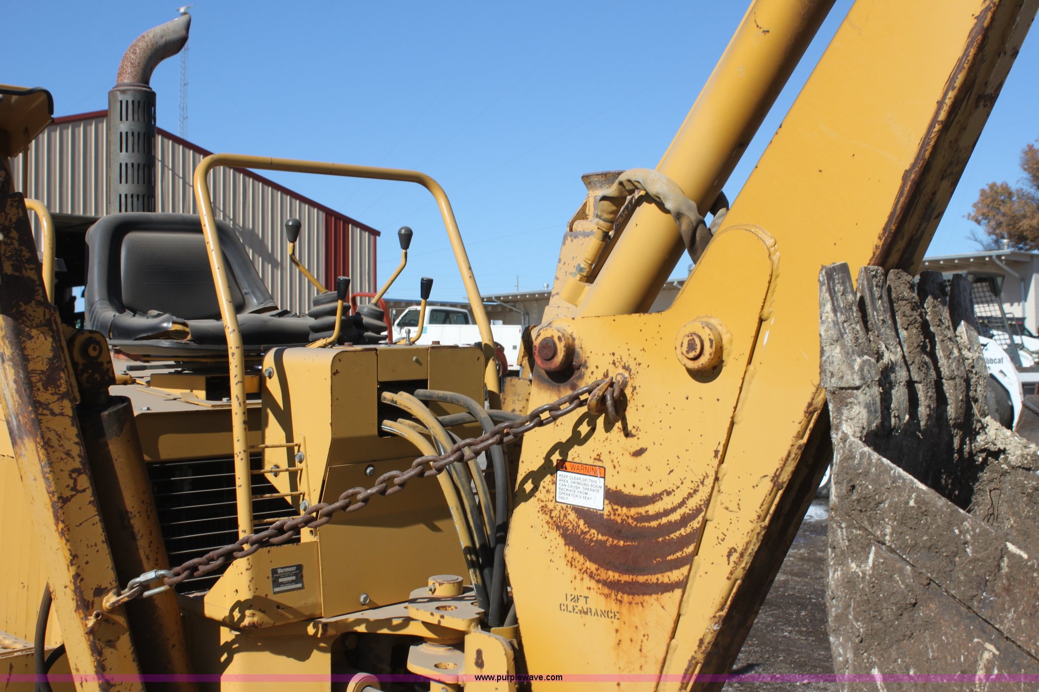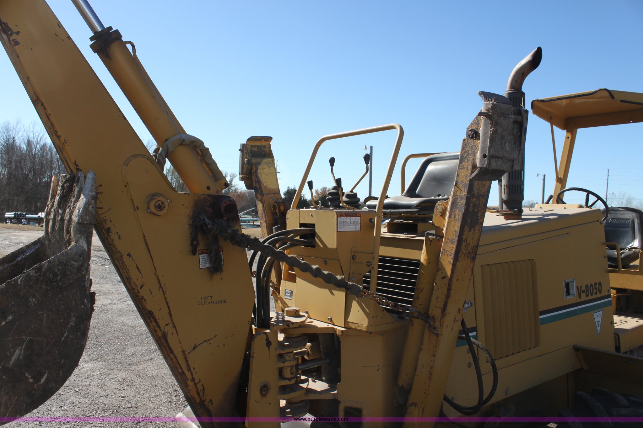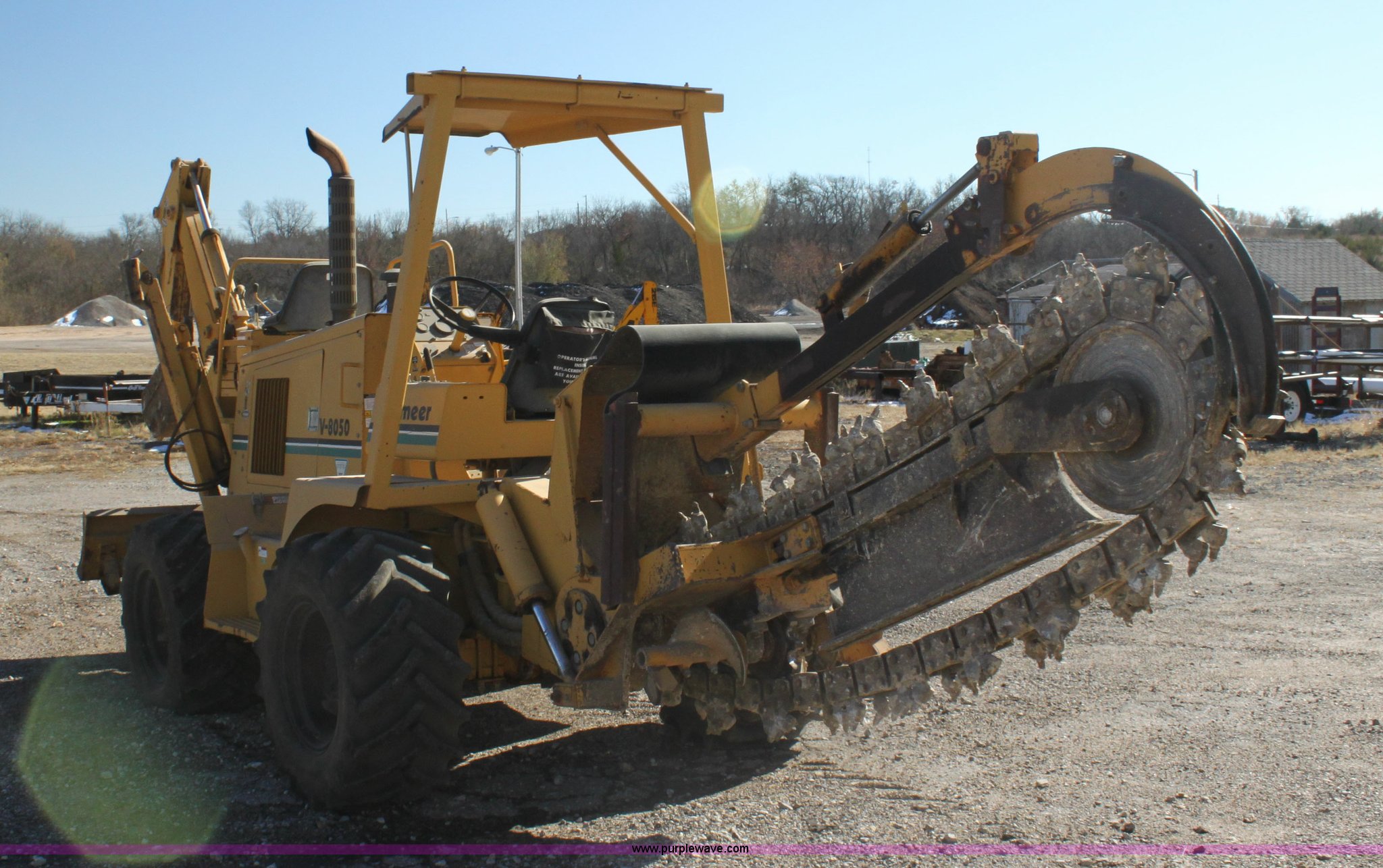 1993 Vermeer V8050 trencher. 2,310 hours on meter, John Deere four cylinder diesel engine Serial T04045D398760, Four wheel drive, Open station, Front and rear steering, 80" back fill blade Tilt, V9300 backhoe Serial 1VRG10093P1000346, VH1850 trencher Serial 1VRH08076P100376, 18"W five tooth bucket, Trencher hydraulic crumber, Rock toothed digging chain, 36 x 13.00-20 NHS tires, Serial 1VRF112W0P1000616. View equipment video. City of Winfield. Winfield, KS 67156