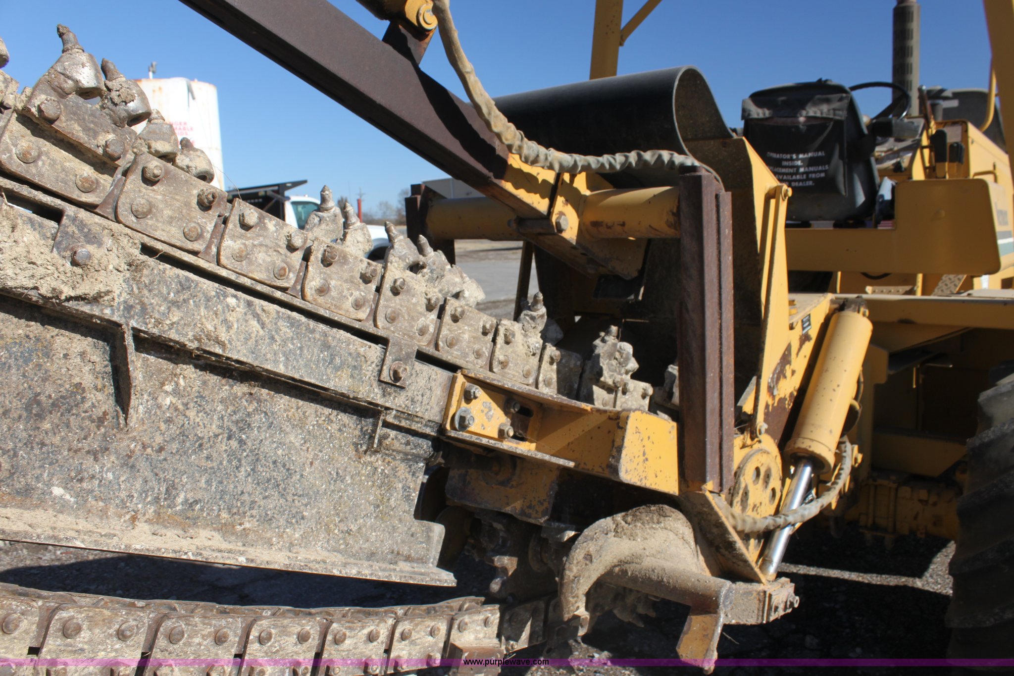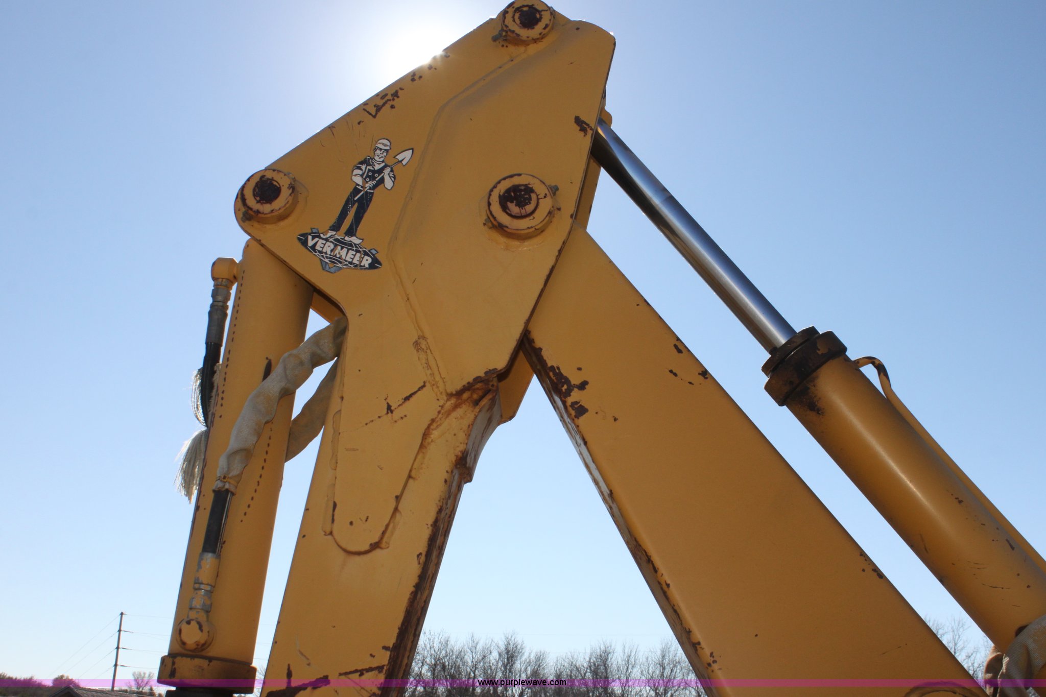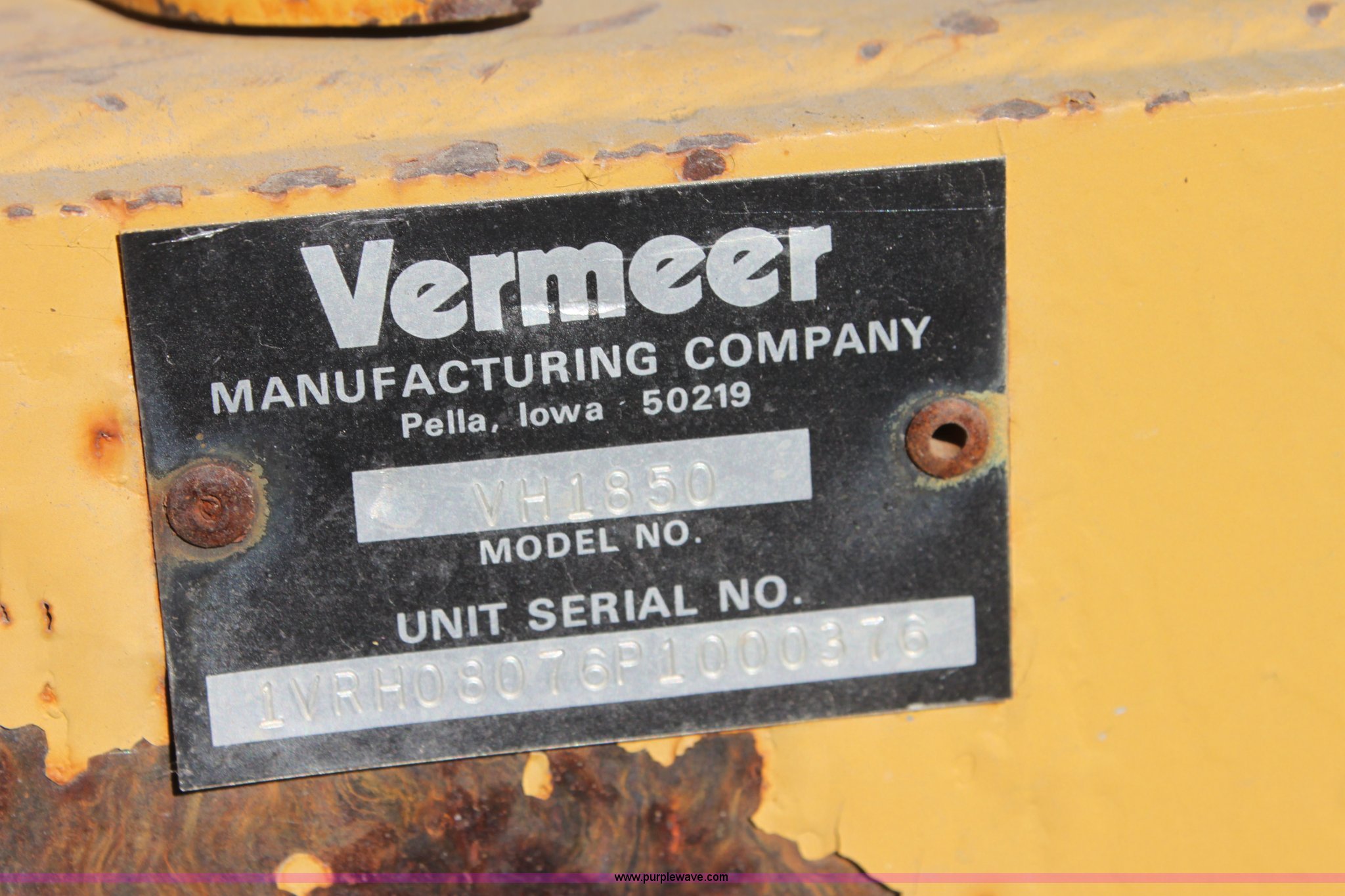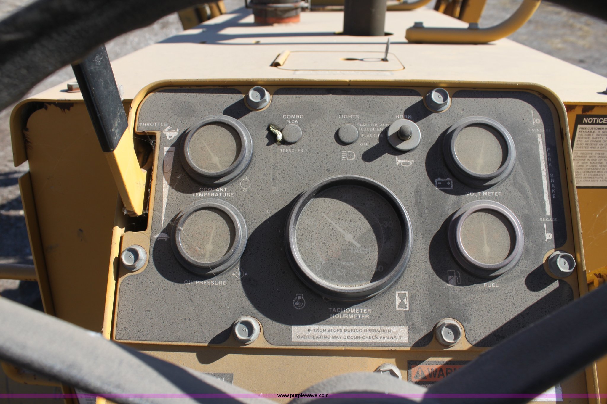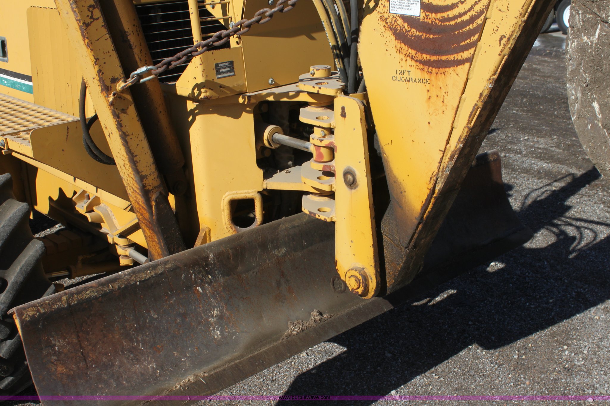 Purple Wave is selling a used Trencher or Rock Saw in Kansas. This item is a 1993 Vermeer V8050 trencher with the following: 2,310 hours on meter, John Deere four cylinder diesel engine, Serial T04045D398760, Four wheel drive, Open station, Front and rear steering, 80" back fill blade, Tilt, V9300 backhoe, Serial 1VRG10093P1000346, VH1850 trencher, Serial 1VRH08076P100376, 18"W five tooth bucket, Trencher hydraulic crumber, Rock toothed digging chain, 36 x 13.00-20 NHS tires, Serial 1VRF112W0P1000616