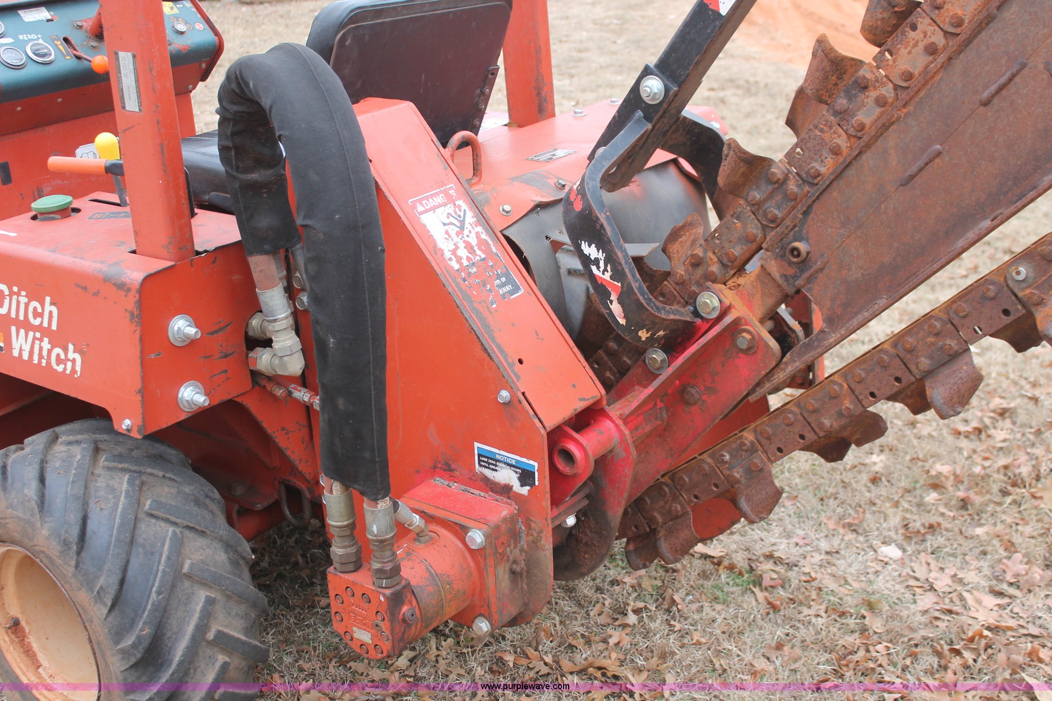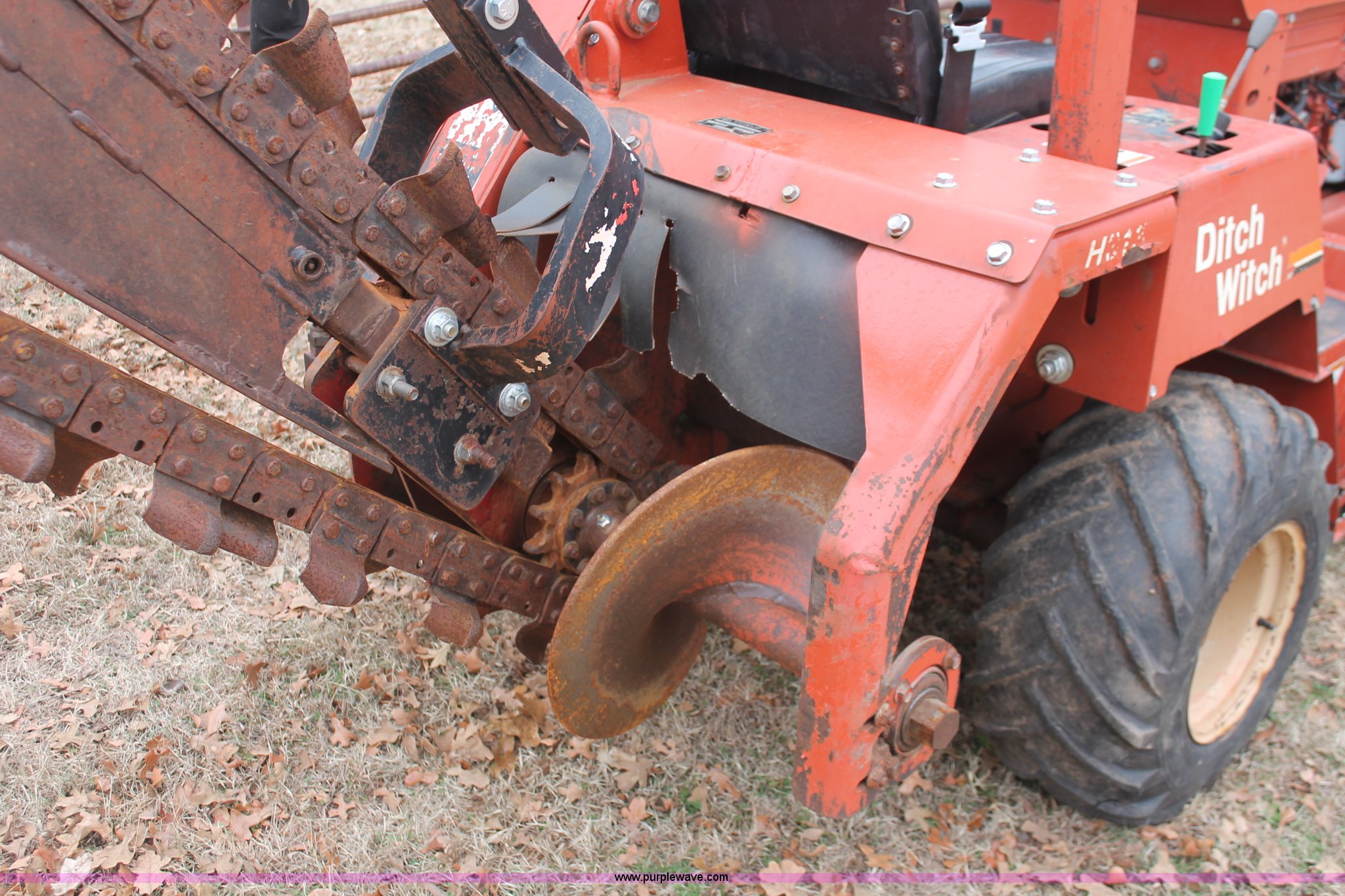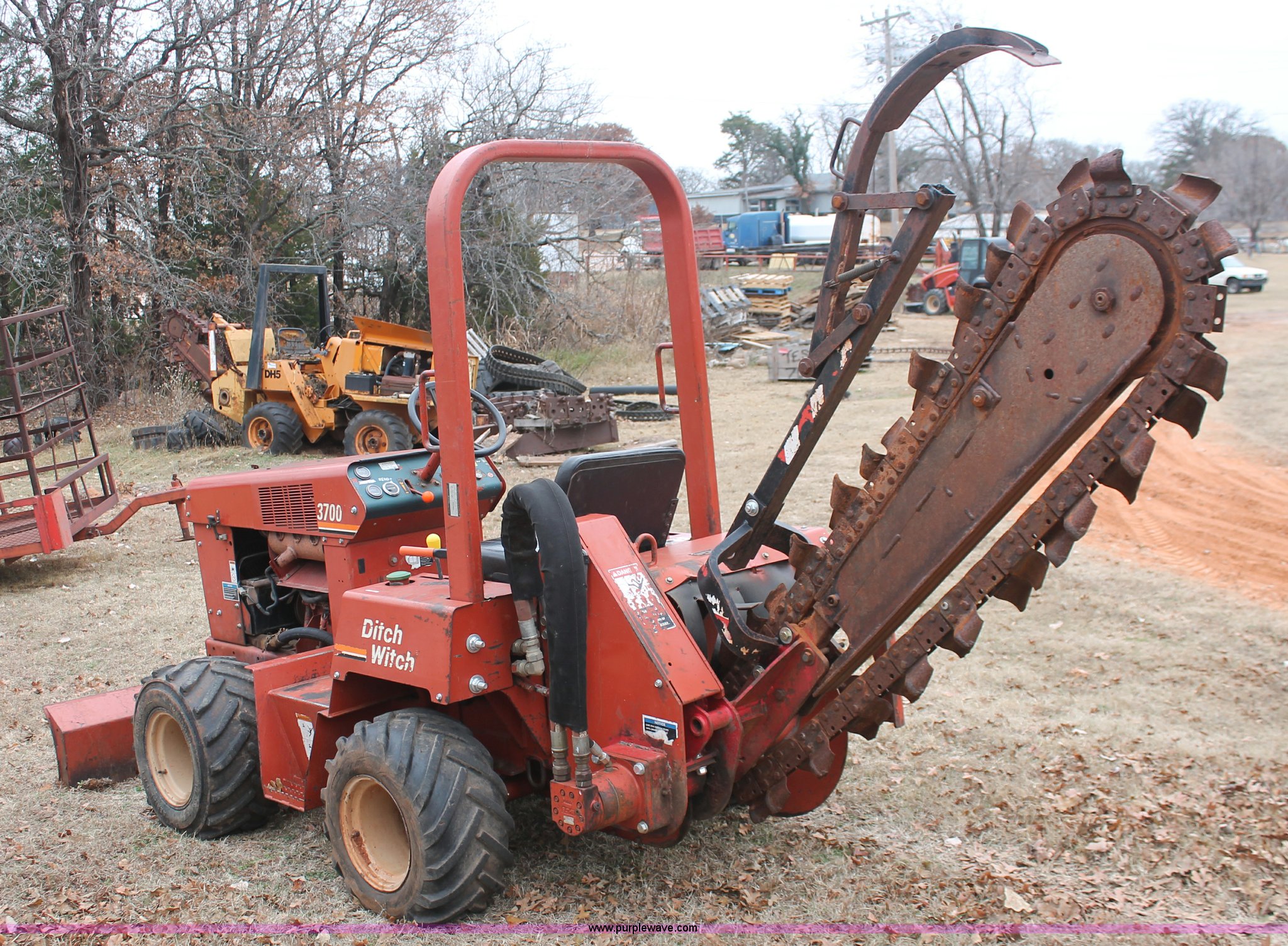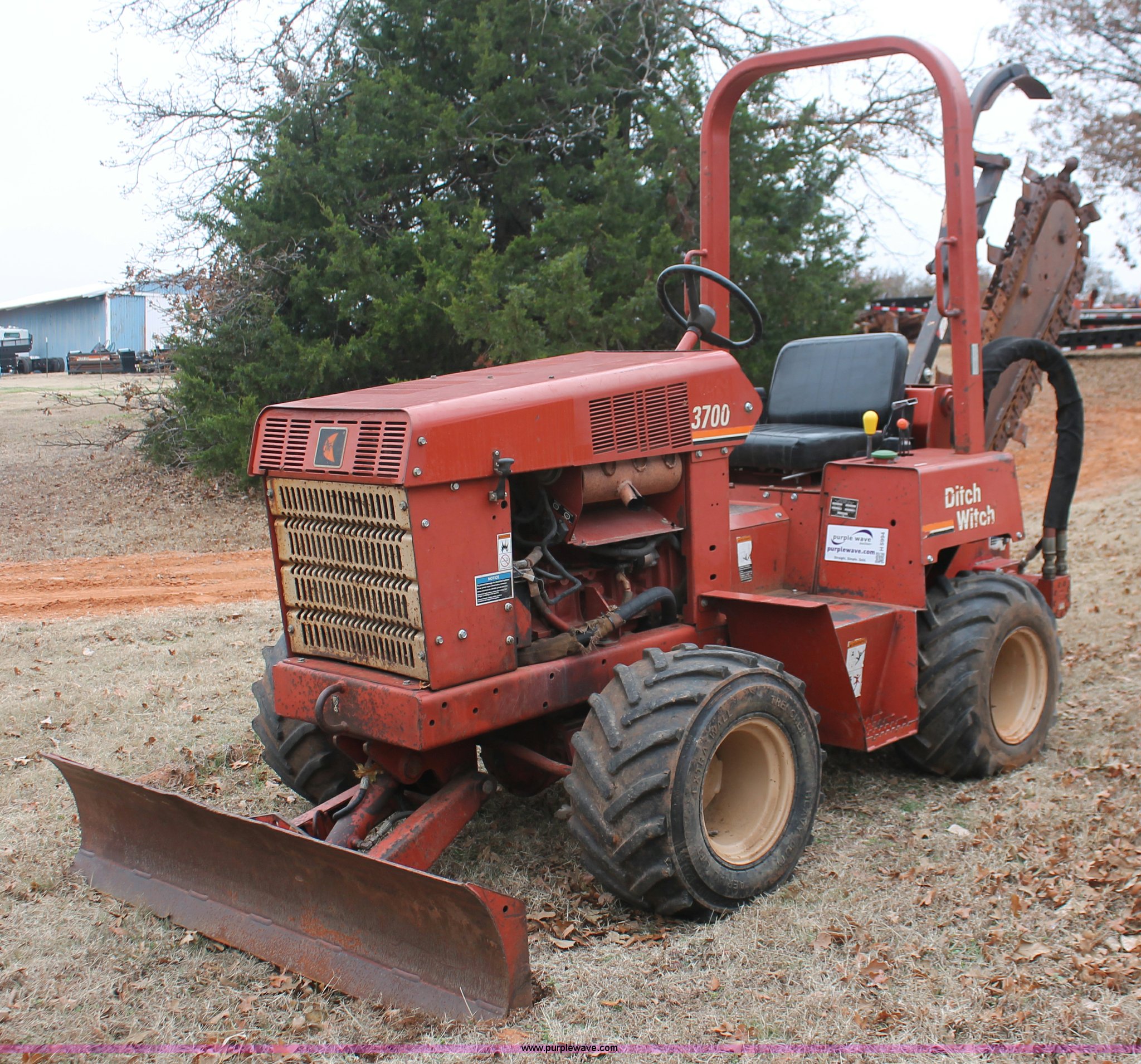 Purple Wave is selling a used Trencher or Rock Saw in Oklahoma. This item is a 2003 Ditch Witch 3700 trencher with the following: 24 hours on meter, Hour meter replaced at 2,520 hours, Deutz three cylinder diesel engine, Hydrostatic transmission, Four wheel drive, OROPS, Vinyl seat, 2007 H313 trencher, 48" maximum trenching depth, 6" trench width, 16" discharge auger, Serial CMWH313XC70000534, 64" back fill blade, 26 x 12.00-12 NHS tires, Serial 3X0743