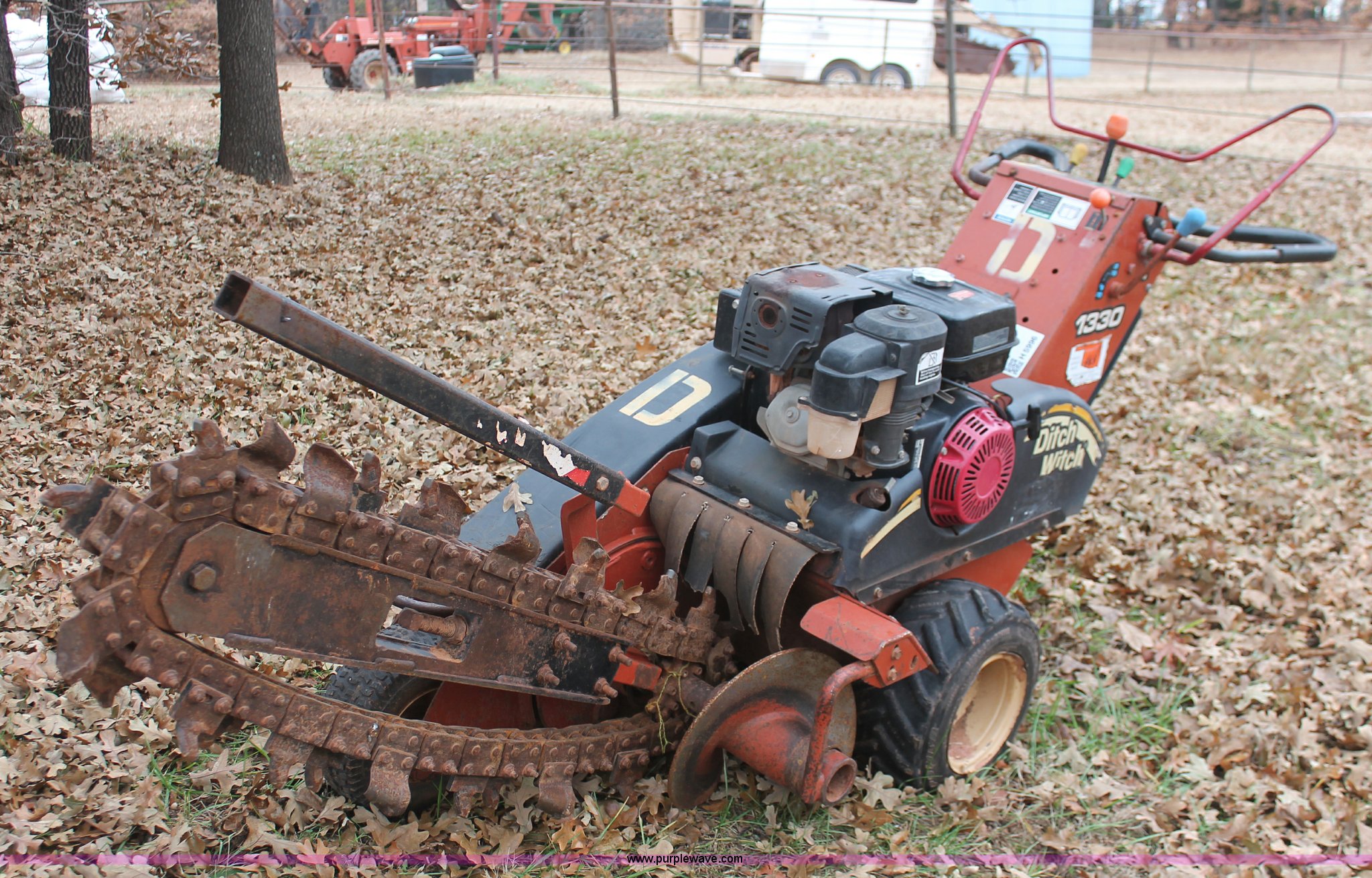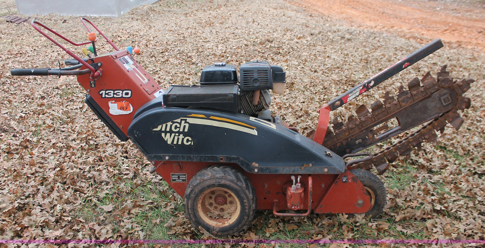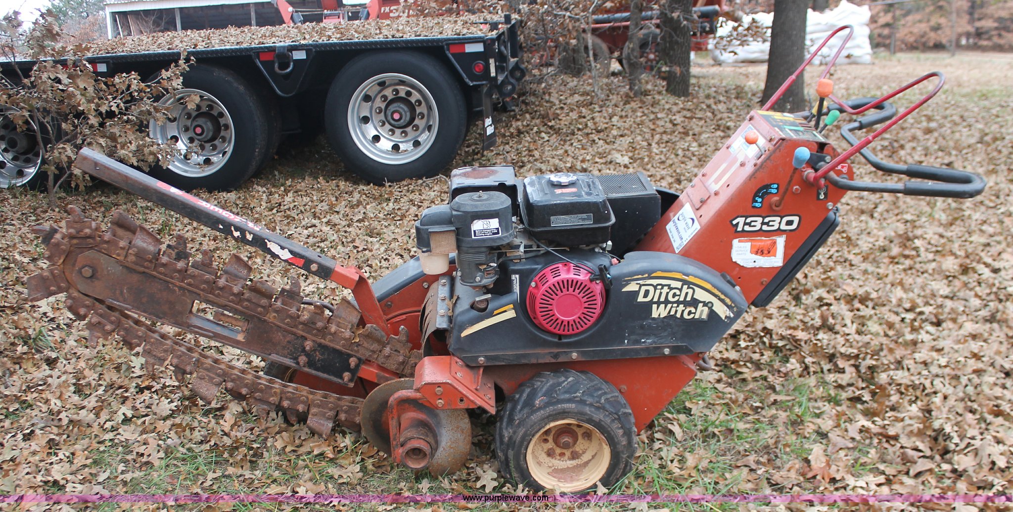 Purple Wave is selling a used Trencher or Rock Saw in Oklahoma. This item is a 2003 Ditch Witch 1330H walk-behind compact trencher with the following: 448 hours on meter, Honda GX390 gas engine, Hydrostatic transmission, 36" maximum trenching depth, 4"W chain, 12" discharge auger, 13 x 5.00-6 front tires, 16 x 6.50-8 NHS rear tires, Serial 1X2279