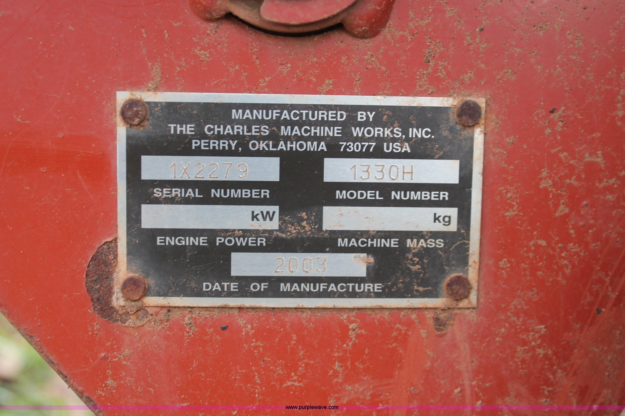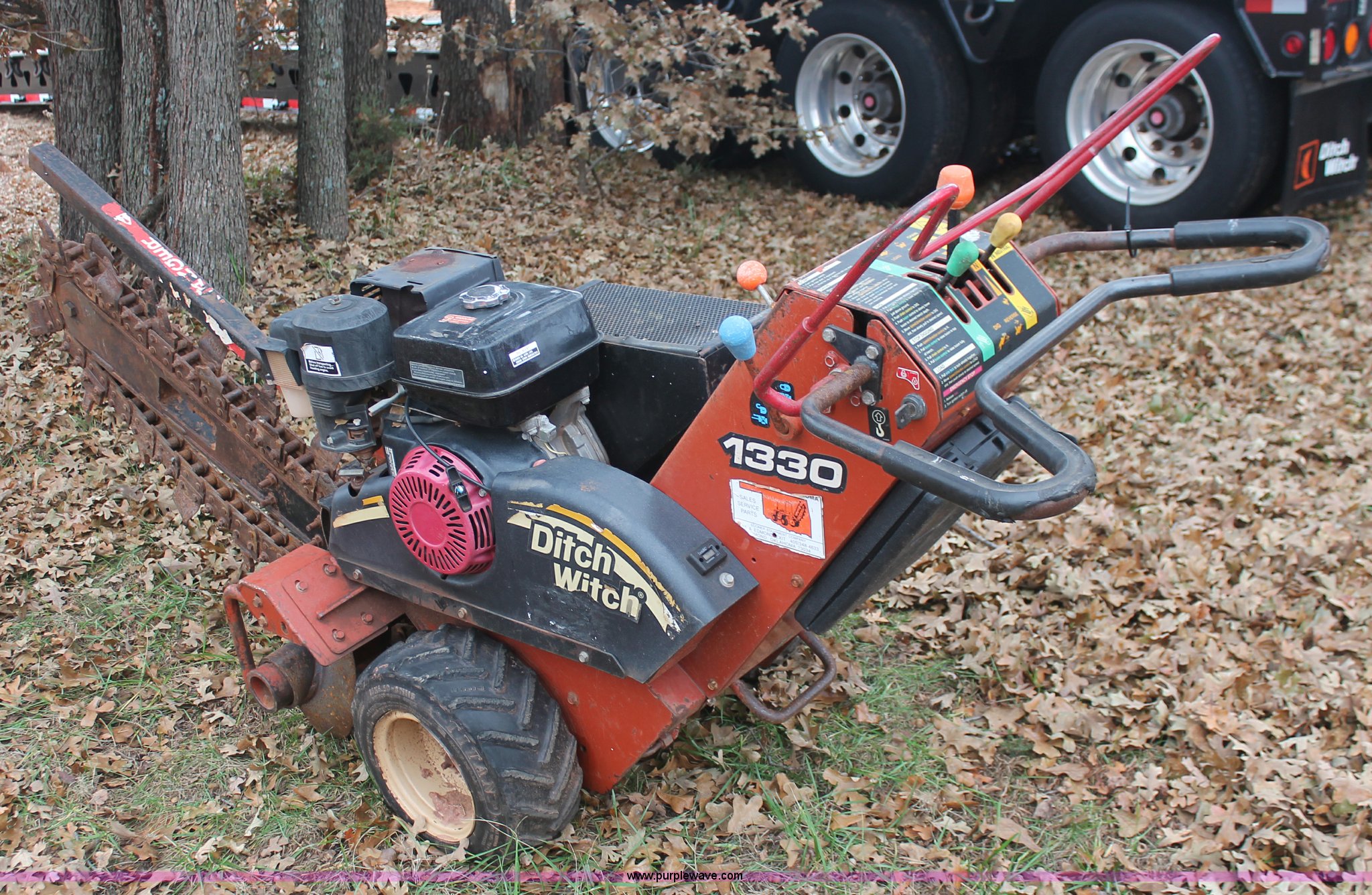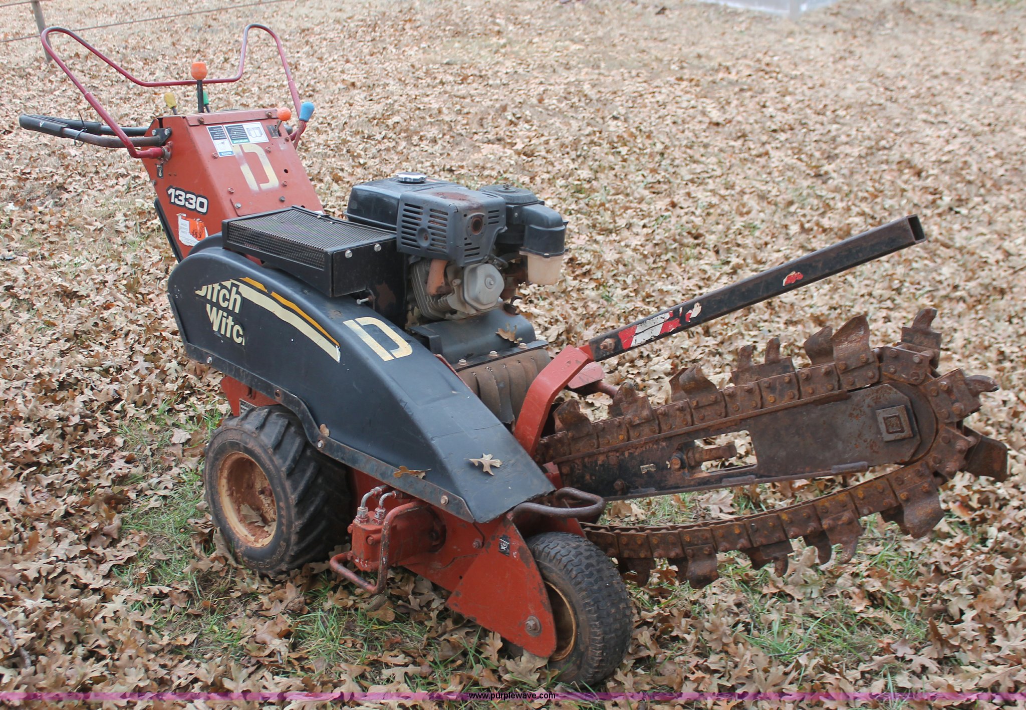 Purple Wave is selling a used Trencher or Rock Saw in Oklahoma. This item is a 2003 Ditch Witch 1330H walk-behind compact trencher with the following: 448 hours on meter, Honda GX390 gas engine, Hydrostatic transmission, 36" maximum trenching depth, 4"W chain, 12" discharge auger, 13 x 5.00-6 front tires, 16 x 6.50-8 NHS rear tires, Serial 1X2279
