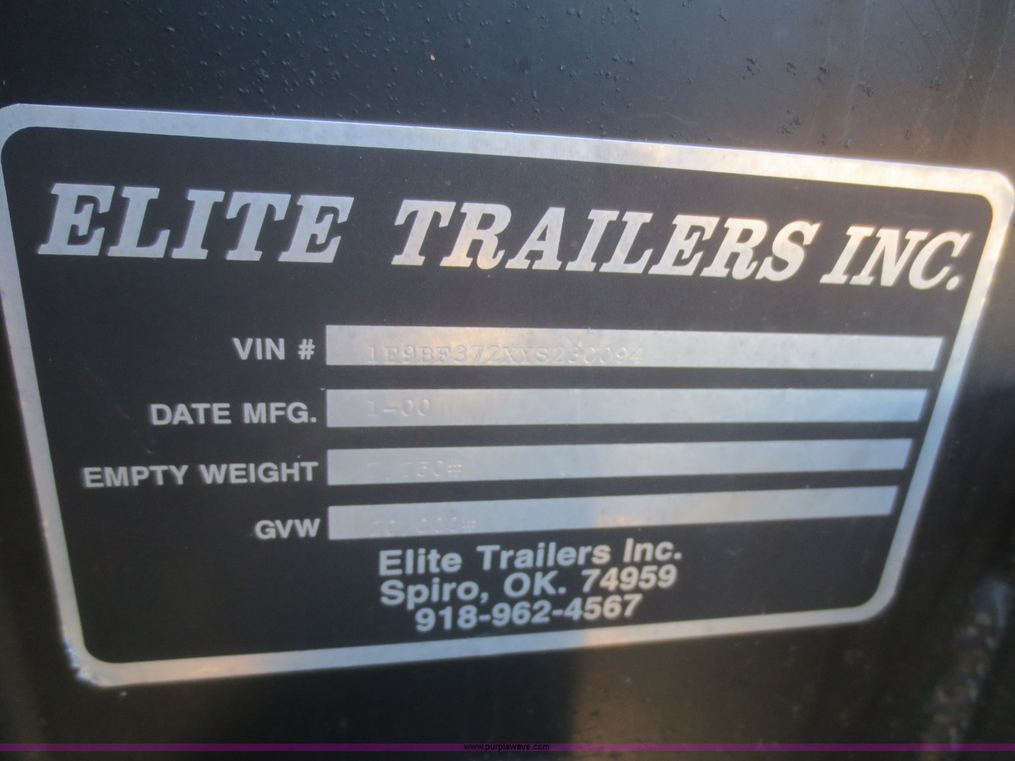 2000 Elite gooseneck trailer. 37'L x 102"W, 32'L flat floor, 5'L dovetail, Triple loading ramp, Rub rails, Wood floor, Spring suspension, LT235/85R16 tires, GVW 20,000 lbs, 7,750 lbs empty weight. 1F9BF372XY5230094. Equipment Unlimited. 29041 S 637 Rd. Grove, OK 74344