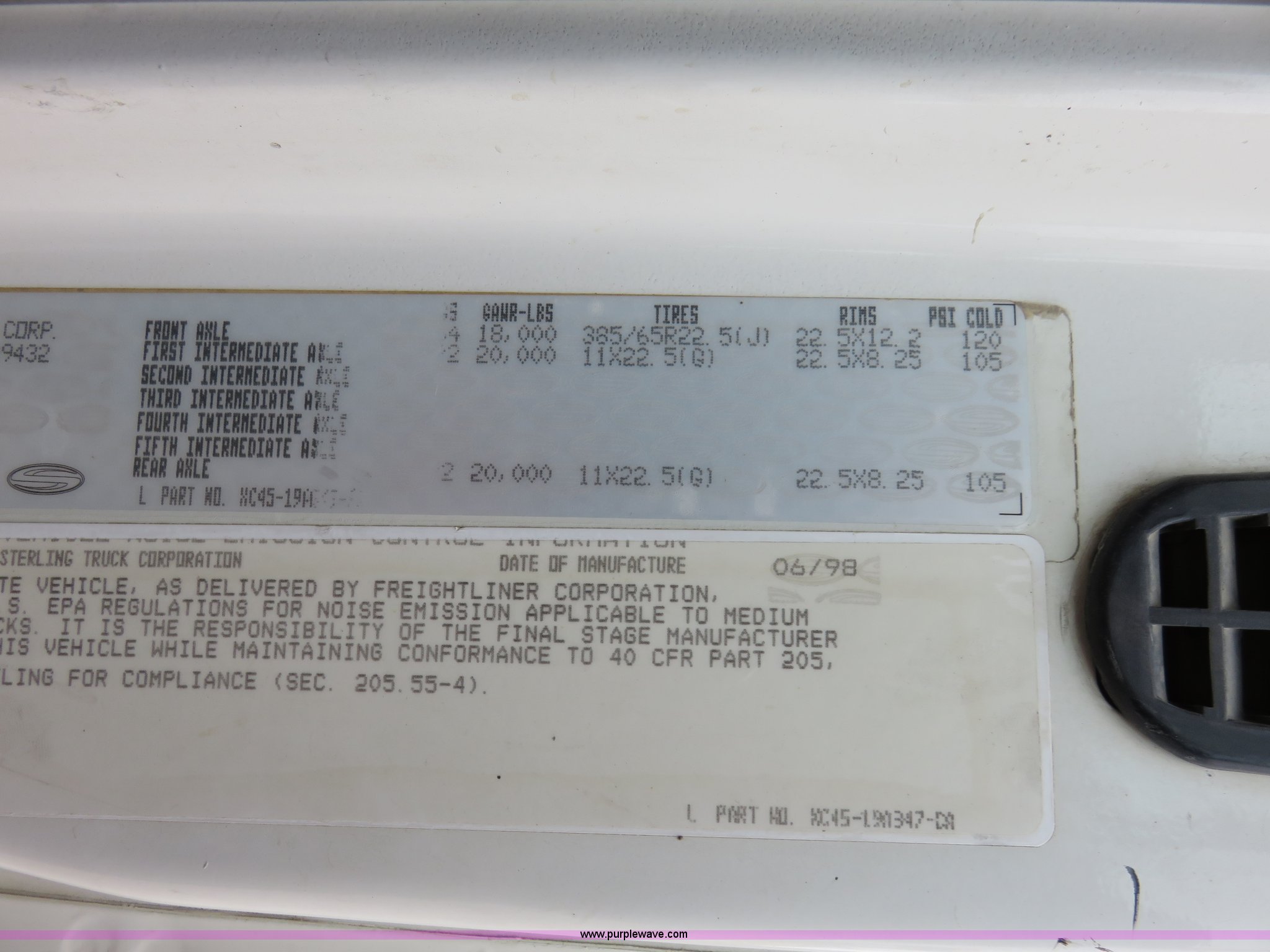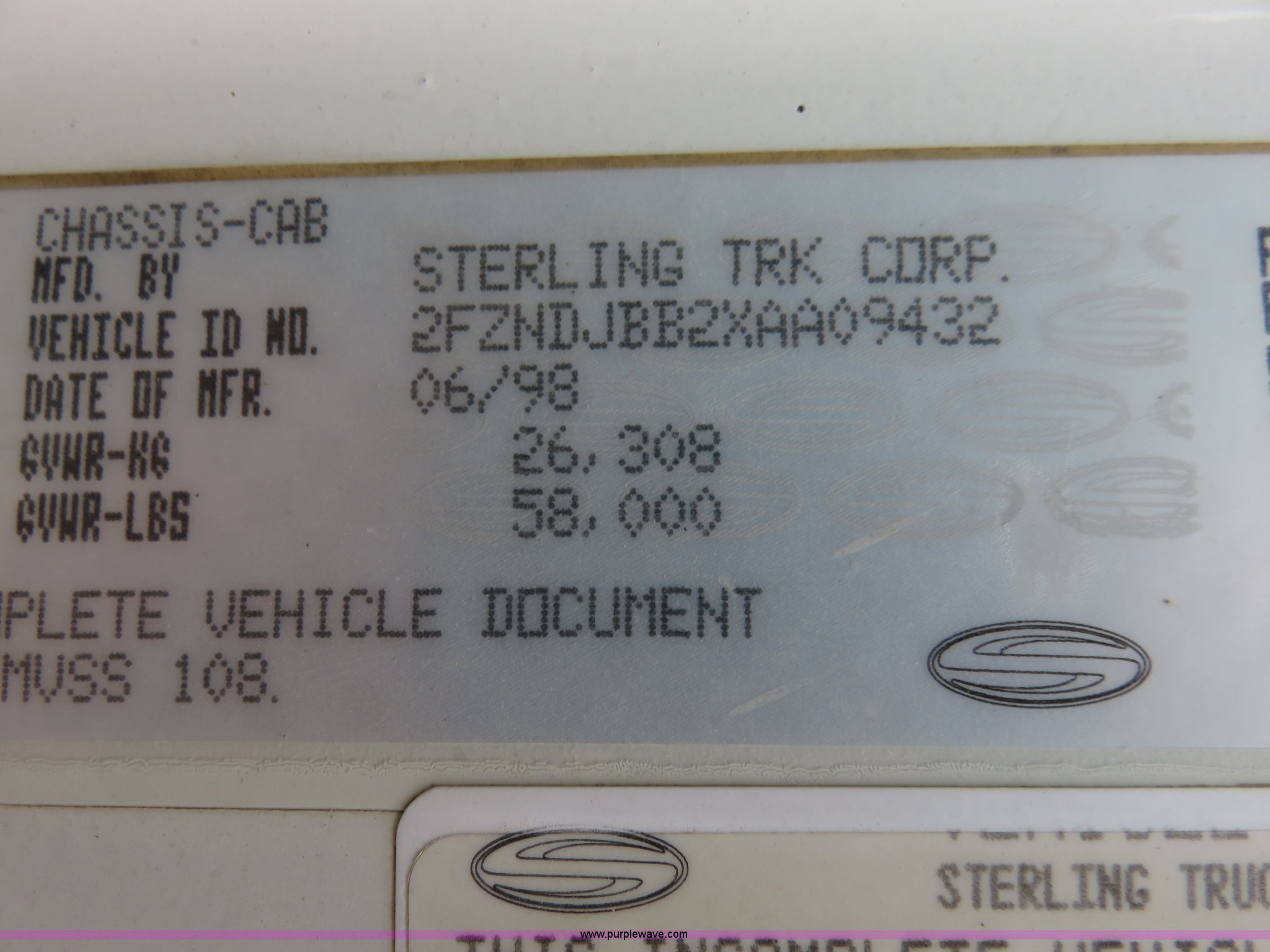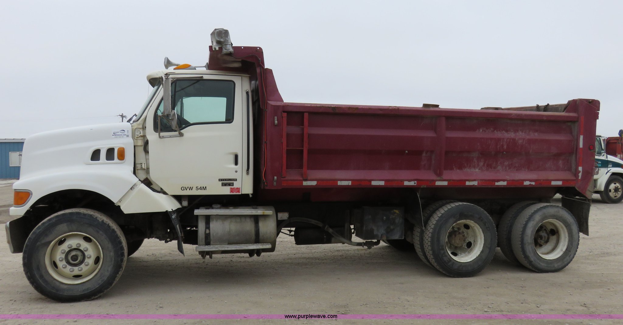 Purple Wave is selling a used Construction Dump Truck in Kansas. This item is a 1999 Sterling LT8511 dump truck with the following: 374,952 miles on odometer, 3,010 hours on meter, Caterpillar 3126 7.2L L6 diesel engine, 330 HP, Eight speed manual transmission, Twin screw, AC and heat, Cruise, AM/FM, Power windows, Air suspension seat, PTO, 16'L dump bed, Air operated end gate, Single ram three stage hoist, Exterior visor, Chrome bumper, Block heater, Single fuel tank, Spring suspension, Air brakes, 221" wheelbase, 385/65R22.5 front tires, 11R22.5 rear tires, GVWR 58,000 lbs, FAWR 18,000 lbs, IAWR 20,000 lbs, RAWR 20,000 lbs