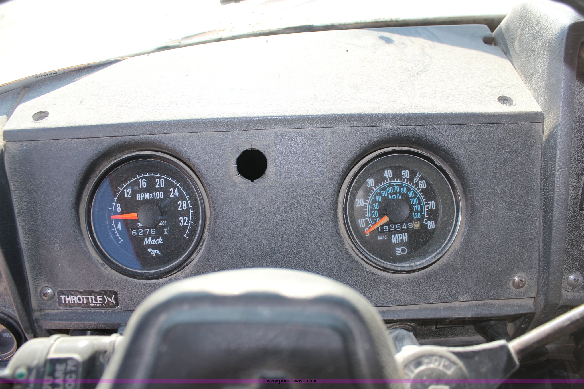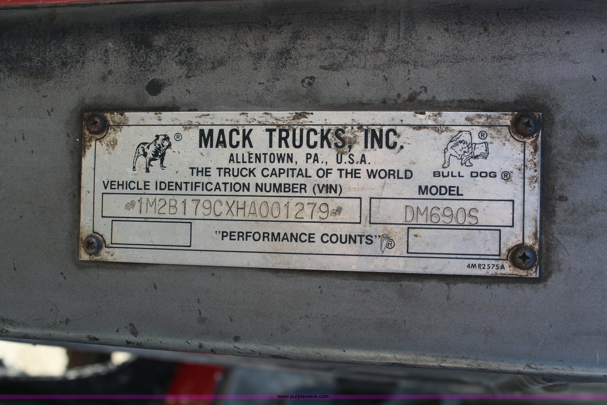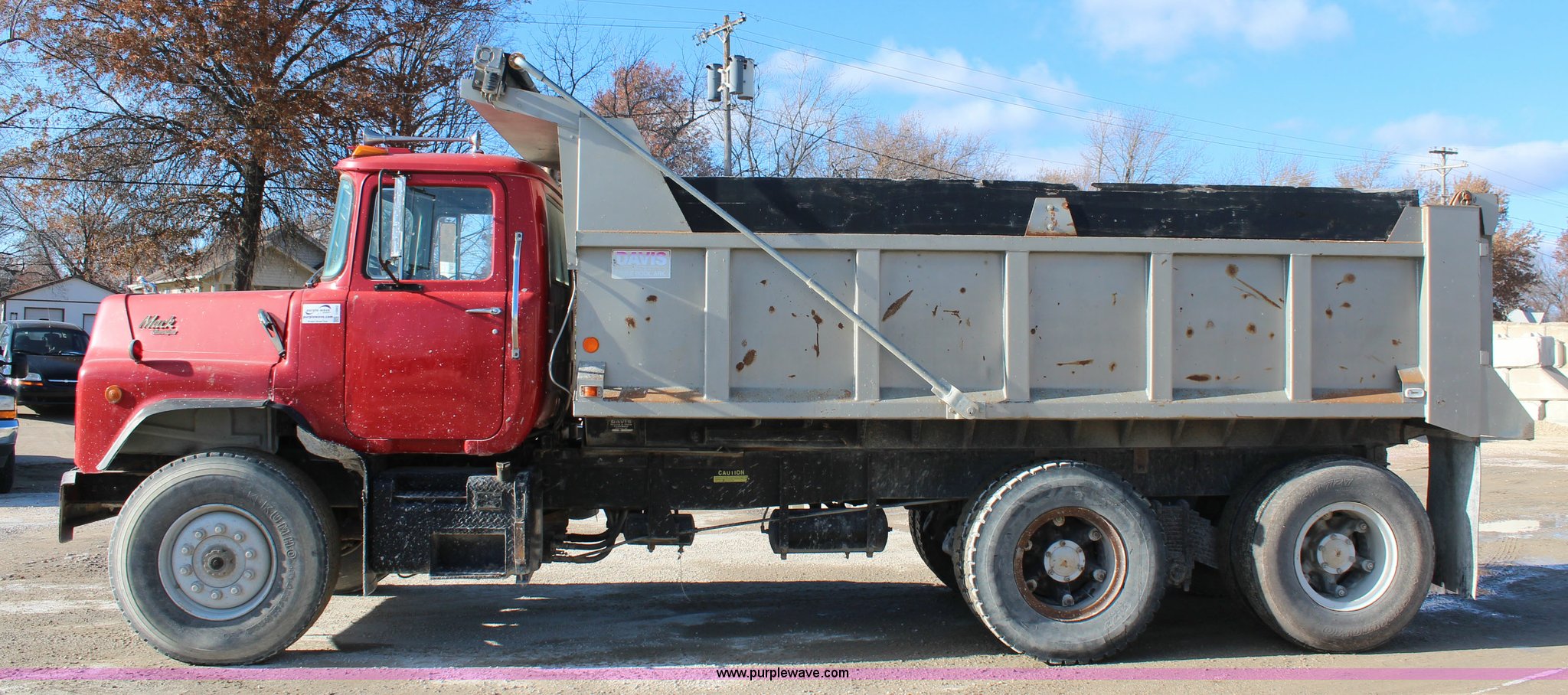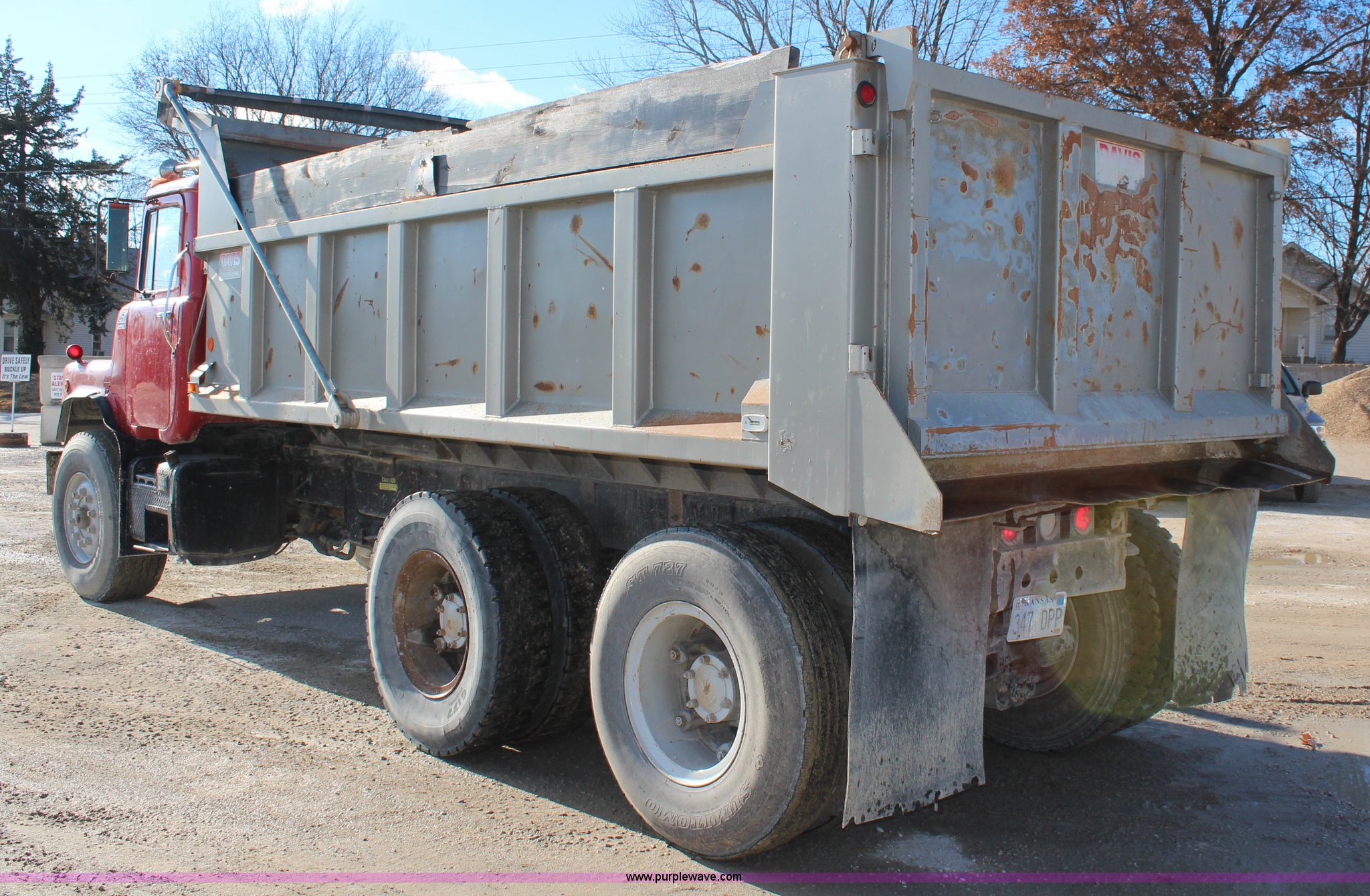 Purple Wave is selling a used Construction Dump Truck in Kansas. This item is a 1987 Mack DM690S dump truck with the following: 193,548 miles on odometer, 6,276 hours on meter, Mack 11.0L L6 diesel engine, 275 HP, Serial 7K0078, Maxitorque five speed manual transmission, Twin screw, Heat, Air suspension seat, PTO, 16'L dump bed, Air operated end gate, Single ram hoist, Electric roll-over tarp, 50 gallon fuel tank, Spring suspension, Air brakes, 11.00R20 tires, One tire flat