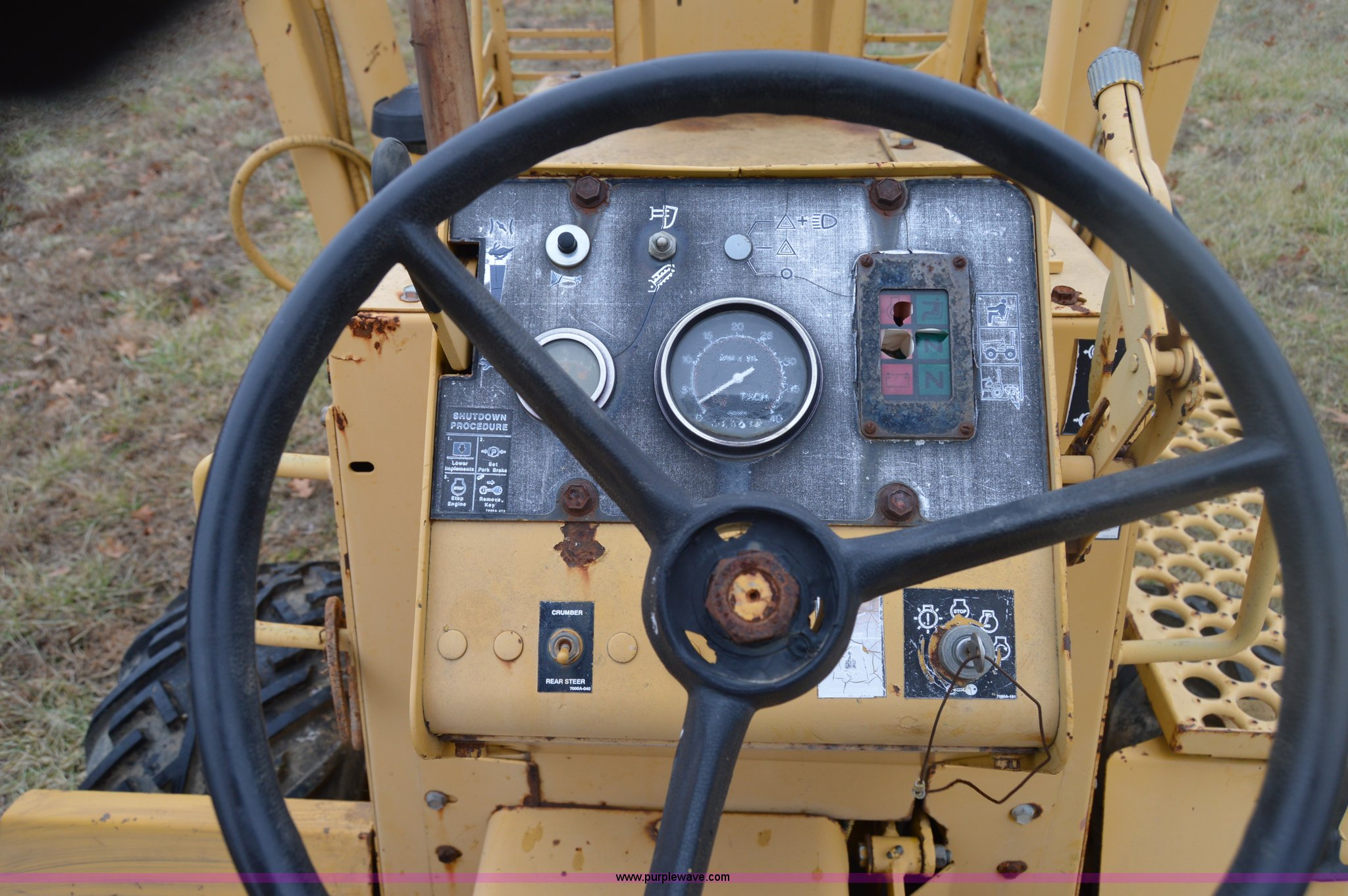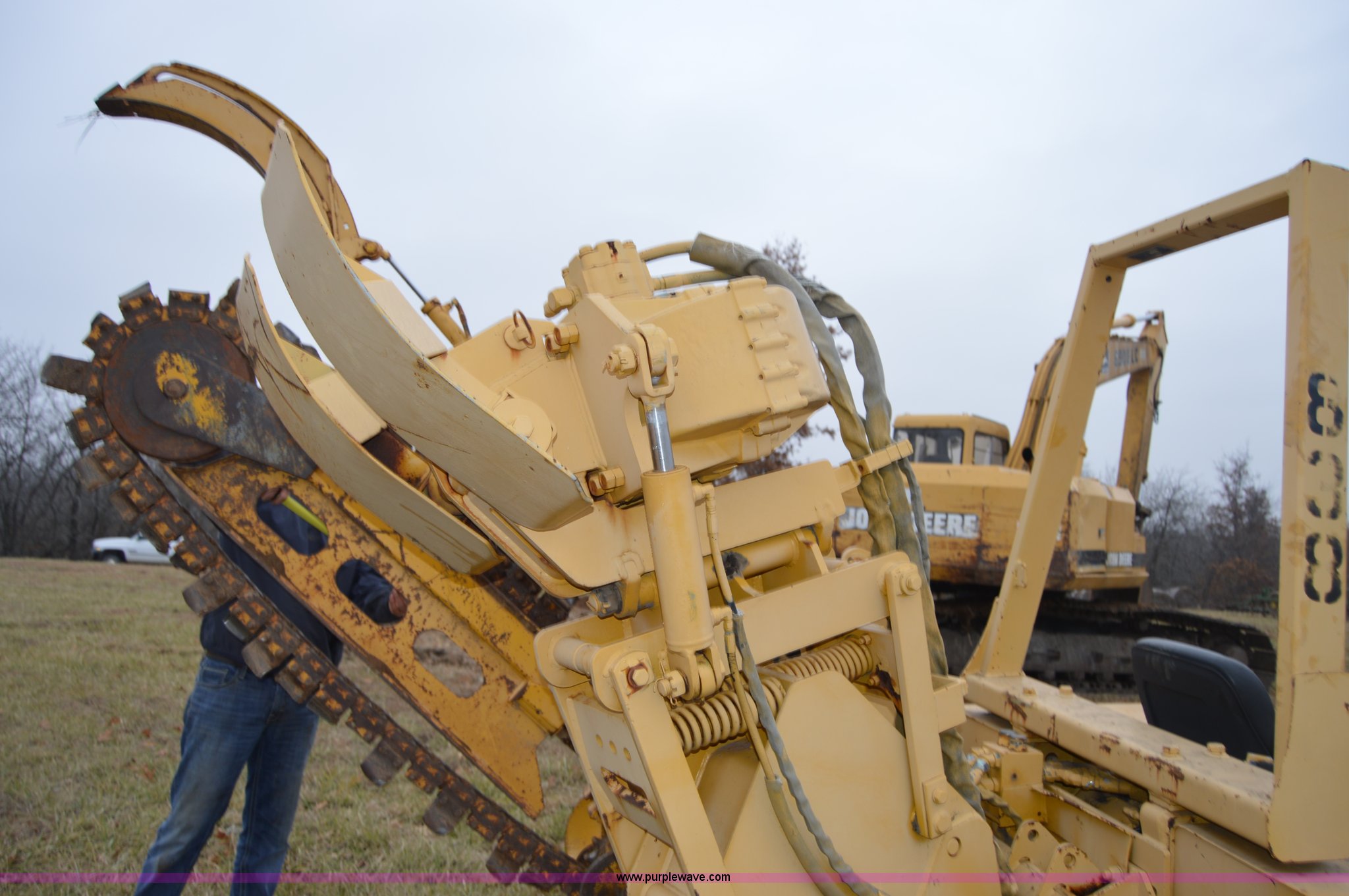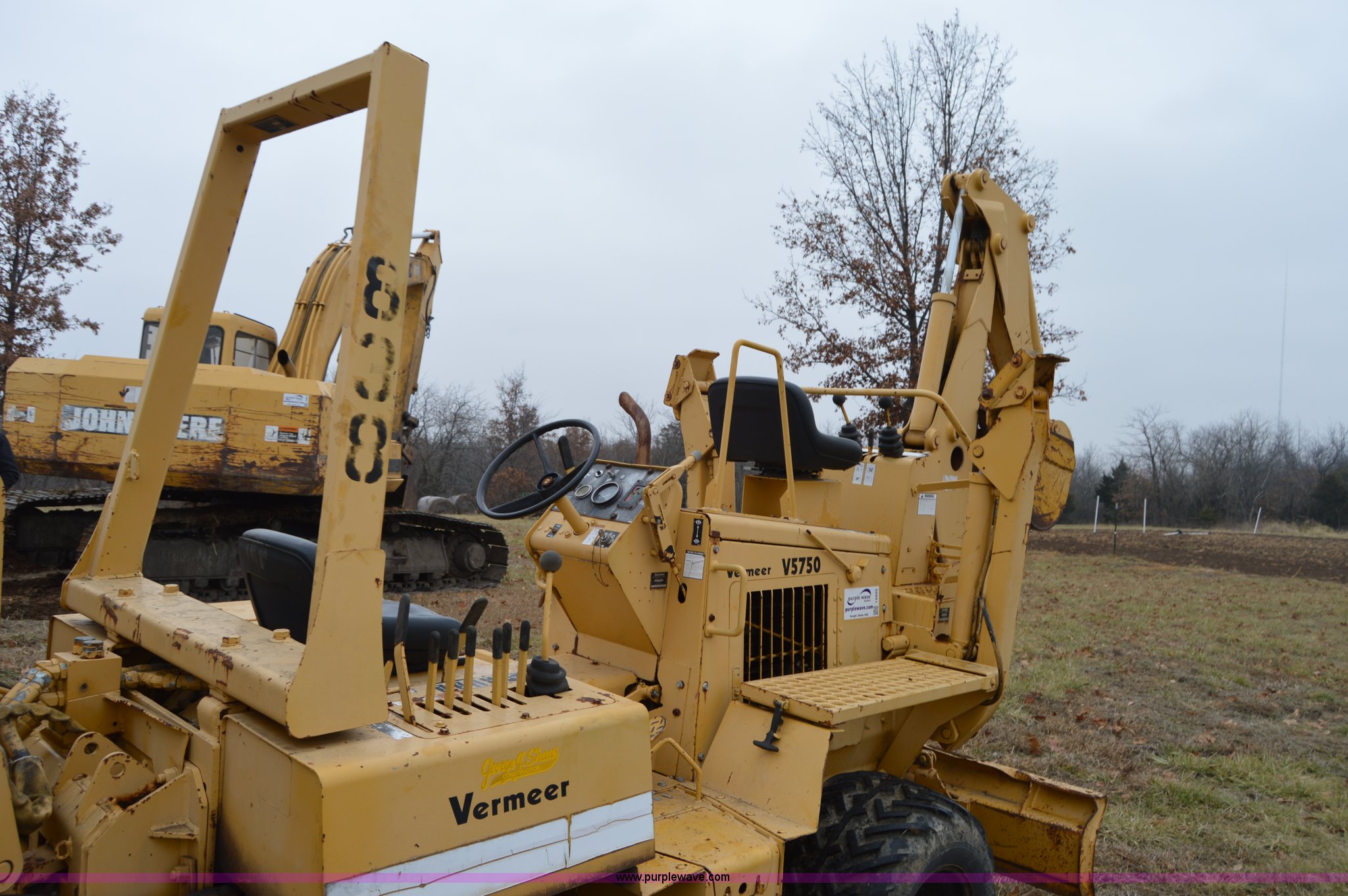 Purple Wave is selling a used Trencher or Rock Saw in Missouri. This item is a 1995 Vermeer V5750 trencher with the following: 1,781 hours on meter, Deutz four cylinder diesel engine, Hydrostatic transmission, Four wheel steering, Crab steer, PT5750 trencher attachment, 60" maximum digging depth, B600 backhoe attachment, 18"W four tooth backhoe bucket, 64"W back fill blade, Vibratory plow, Blade missing, 31 x 15.50-15 tires, Serial 1VRM082Z3S1000101