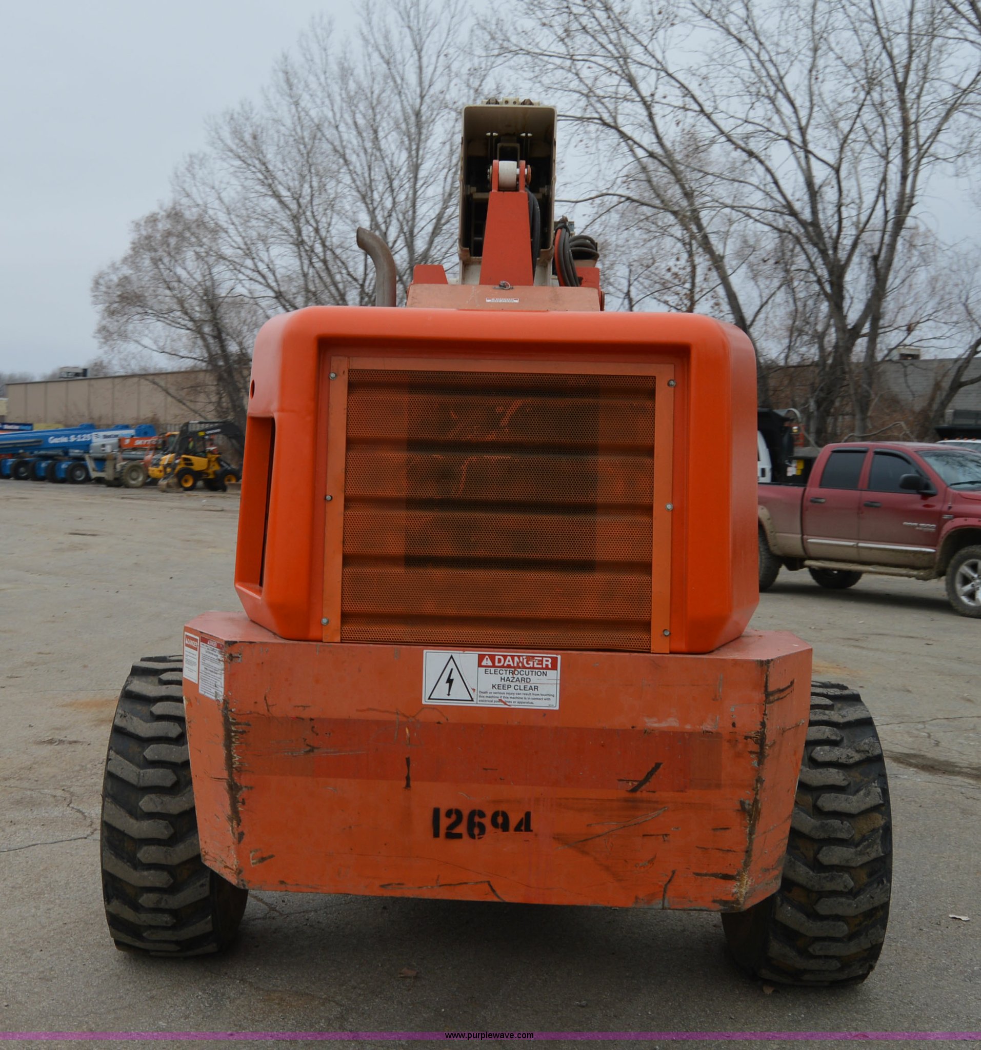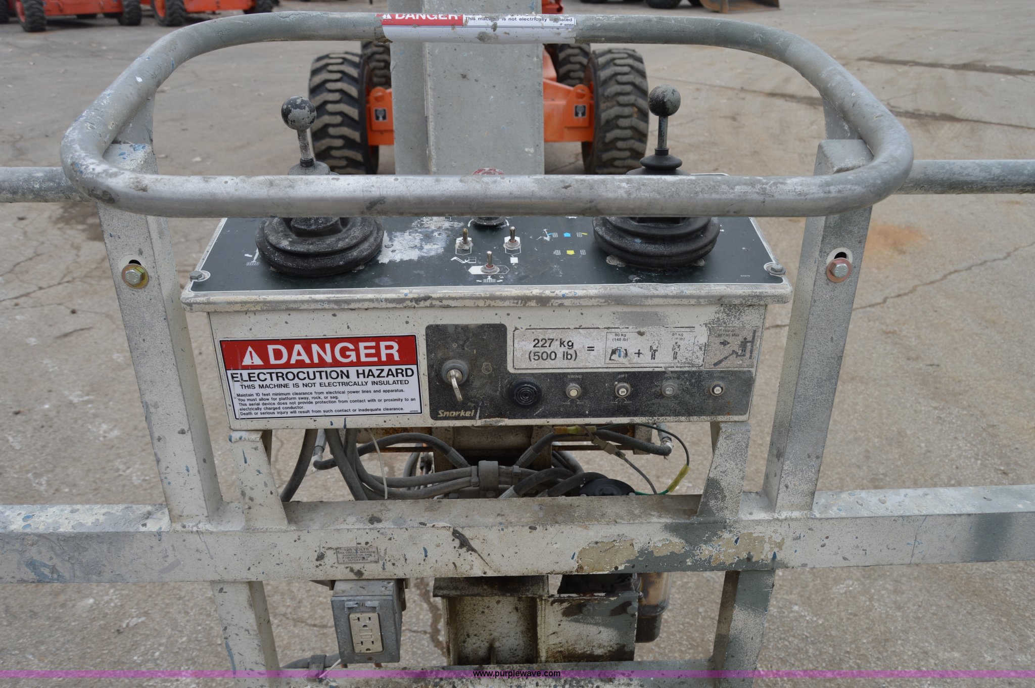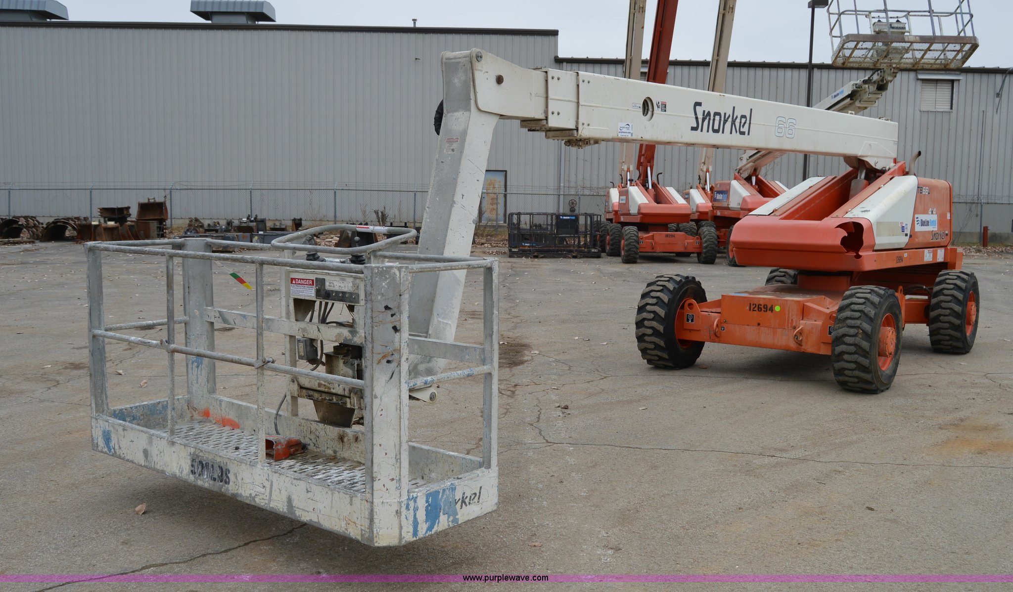 Purple Wave is selling a used Boom Lift in Missouri. This item is a 2007 Snorkel TB66J boom lift with the following: 3,346 hours on meter, Four cylinder diesel engine, Four wheel drive, 500 lbs maximum lift capacity, 65.9' maximum lift height, 56.1' maximum platform reach, 8'L x 32"W platform, Ground and platform controls, Power to the platform, Three mile per hour maximum travel speed, 13" ground clearance, 15-19.5 foam filled tires, 25,000 lbs. base operating weight, Unit # 12694