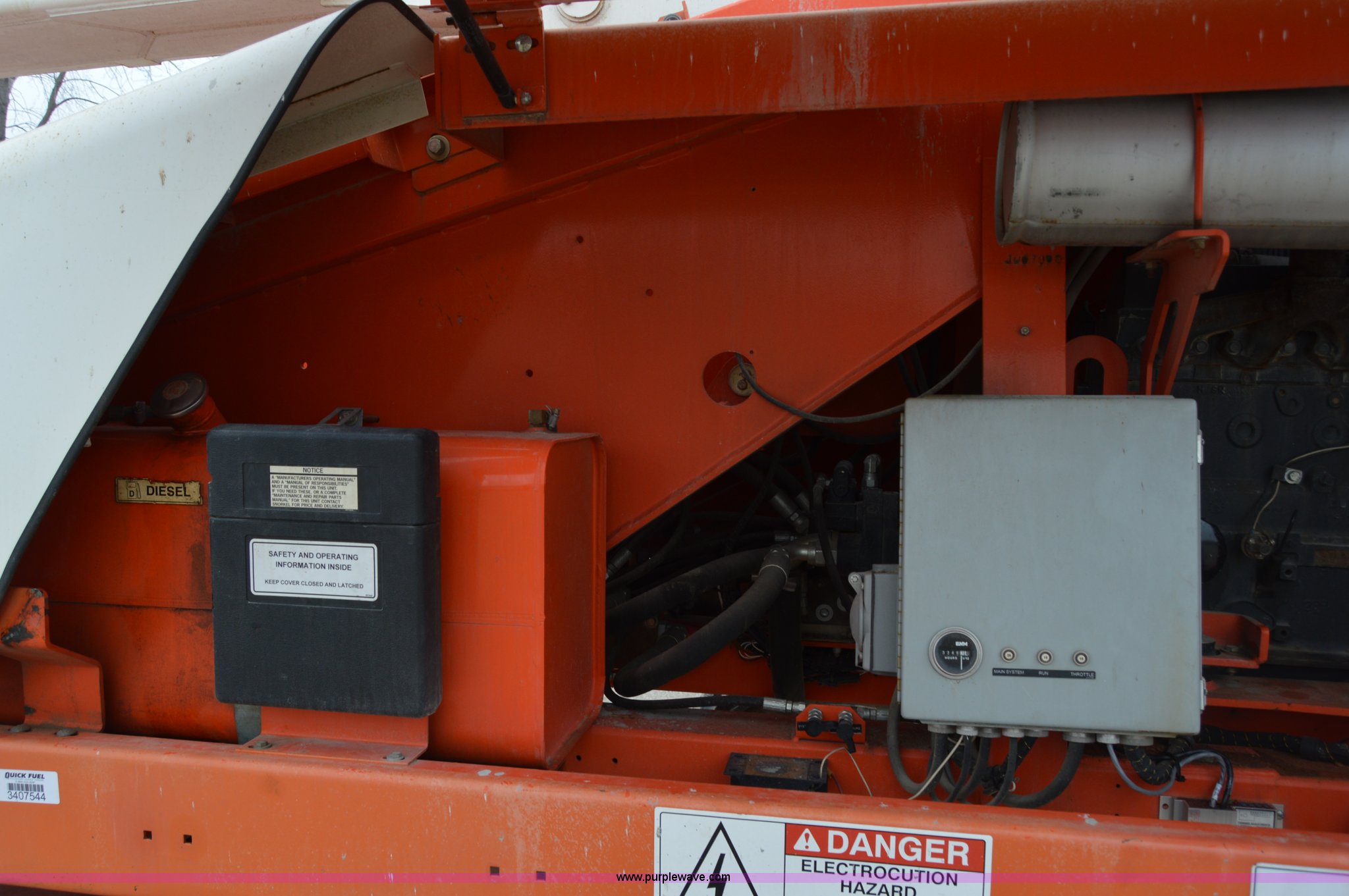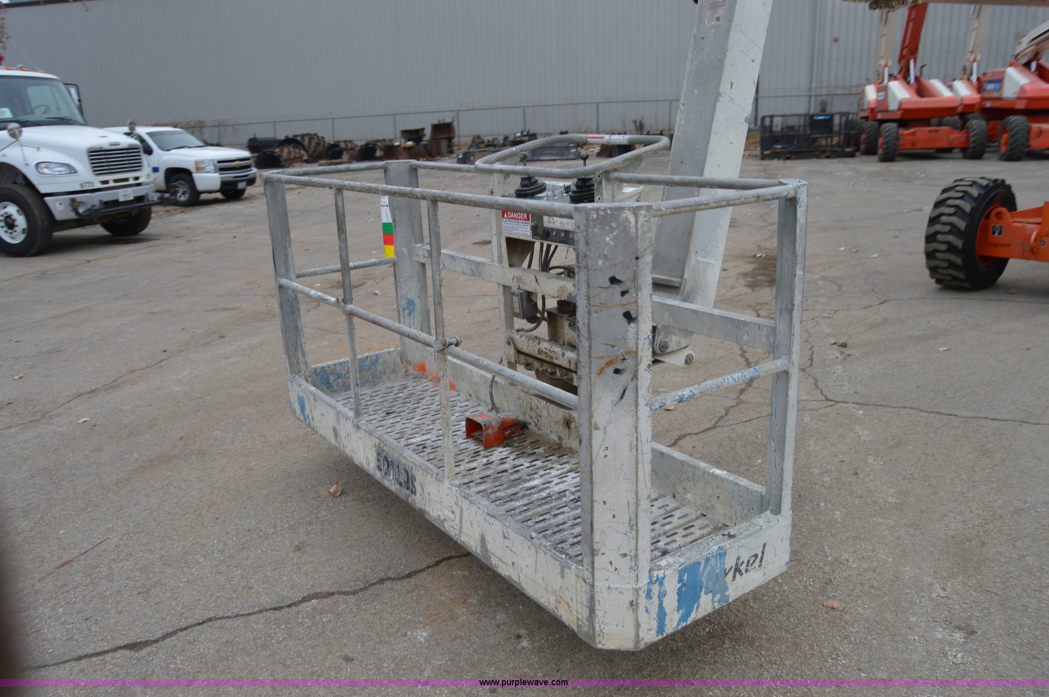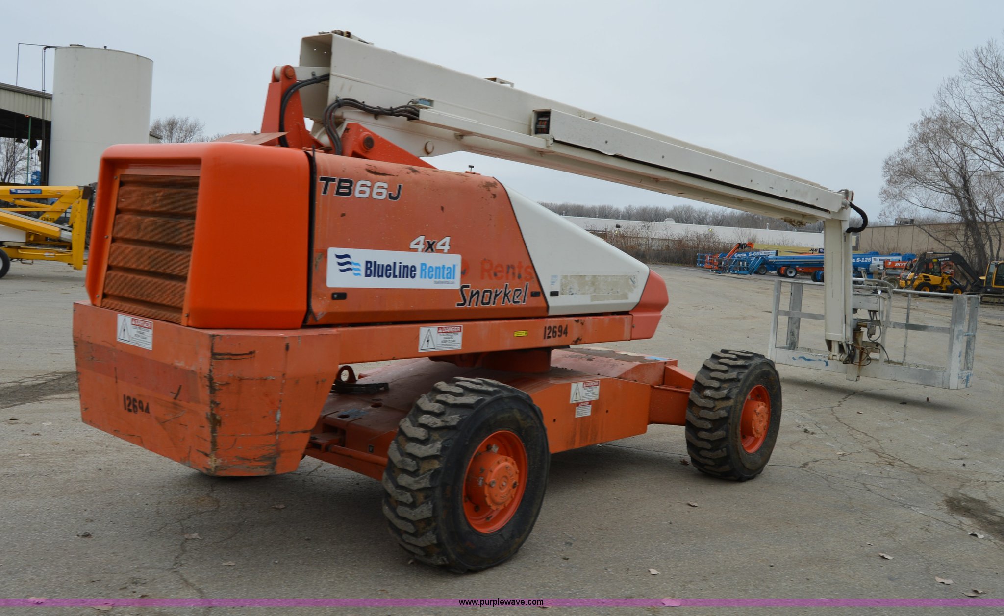2007 Snorkel TB66J boom lift. 3,346 hours on meter, Four cylinder diesel engine, Four wheel drive, 500 lbs maximum lift capacity, 65.9' maximum lift height, 56.1' maximum platform reach, 8'L x 32"W platform, Ground and platform controls, Power to the platform, Three mile per hour maximum travel speed, 13" ground clearance, 15-19.5 foam filled tires, 25,000 lbs. base operating weight, Unit # 12694. Blueline Rental. 4120 East Front Street. Kansas City, MO 64120