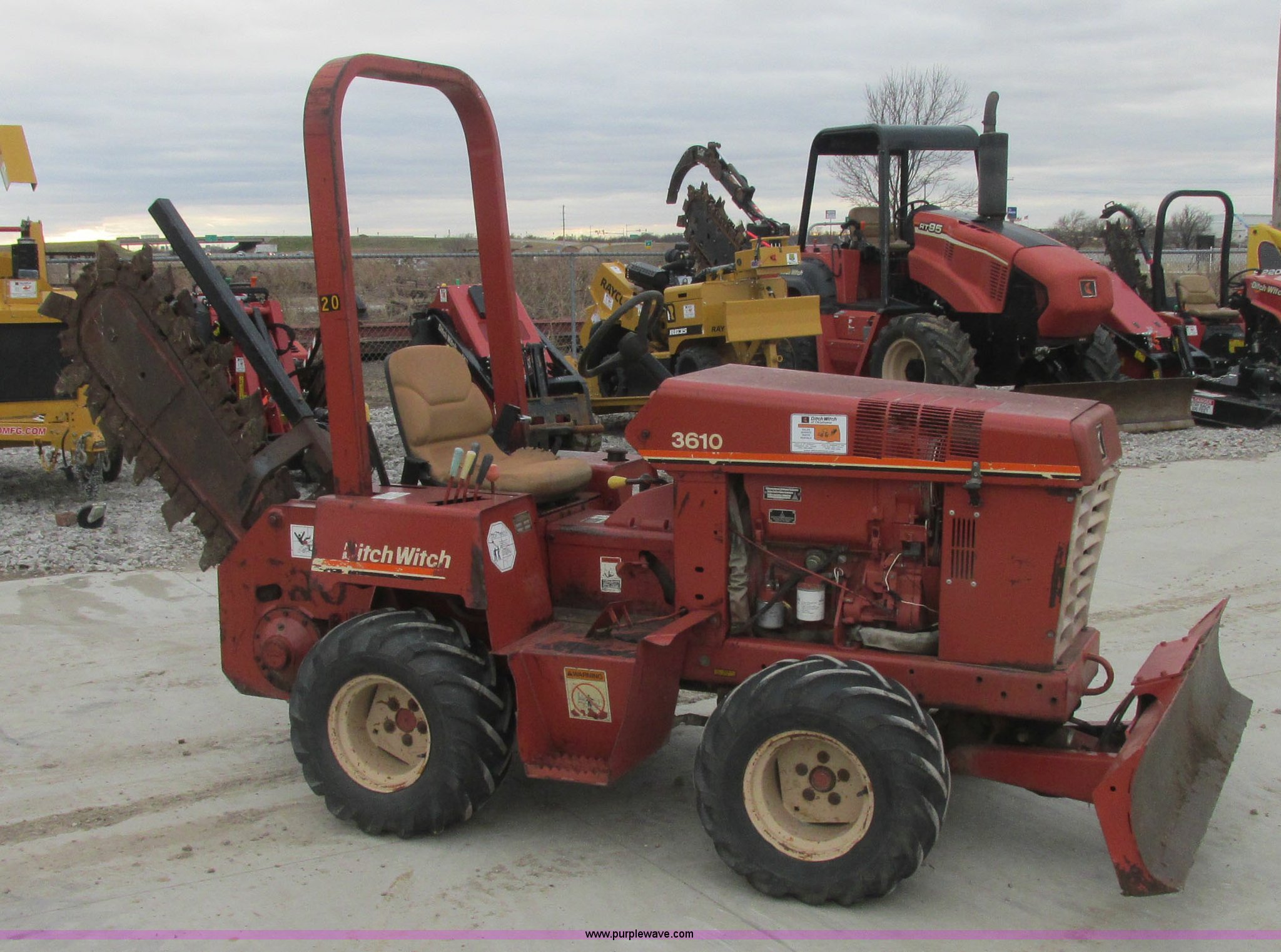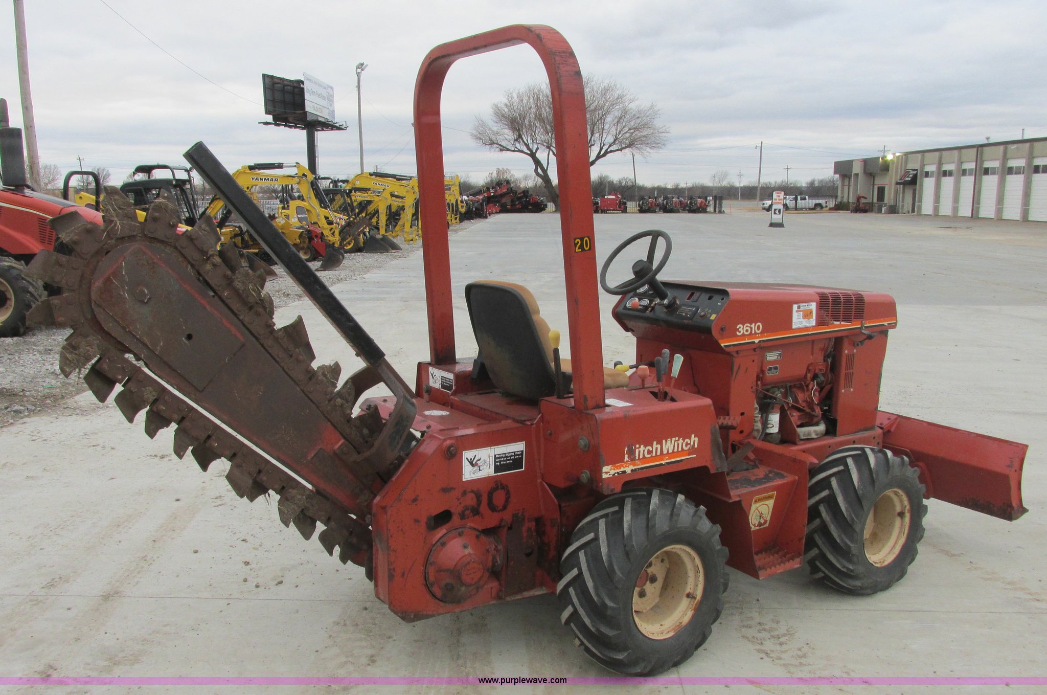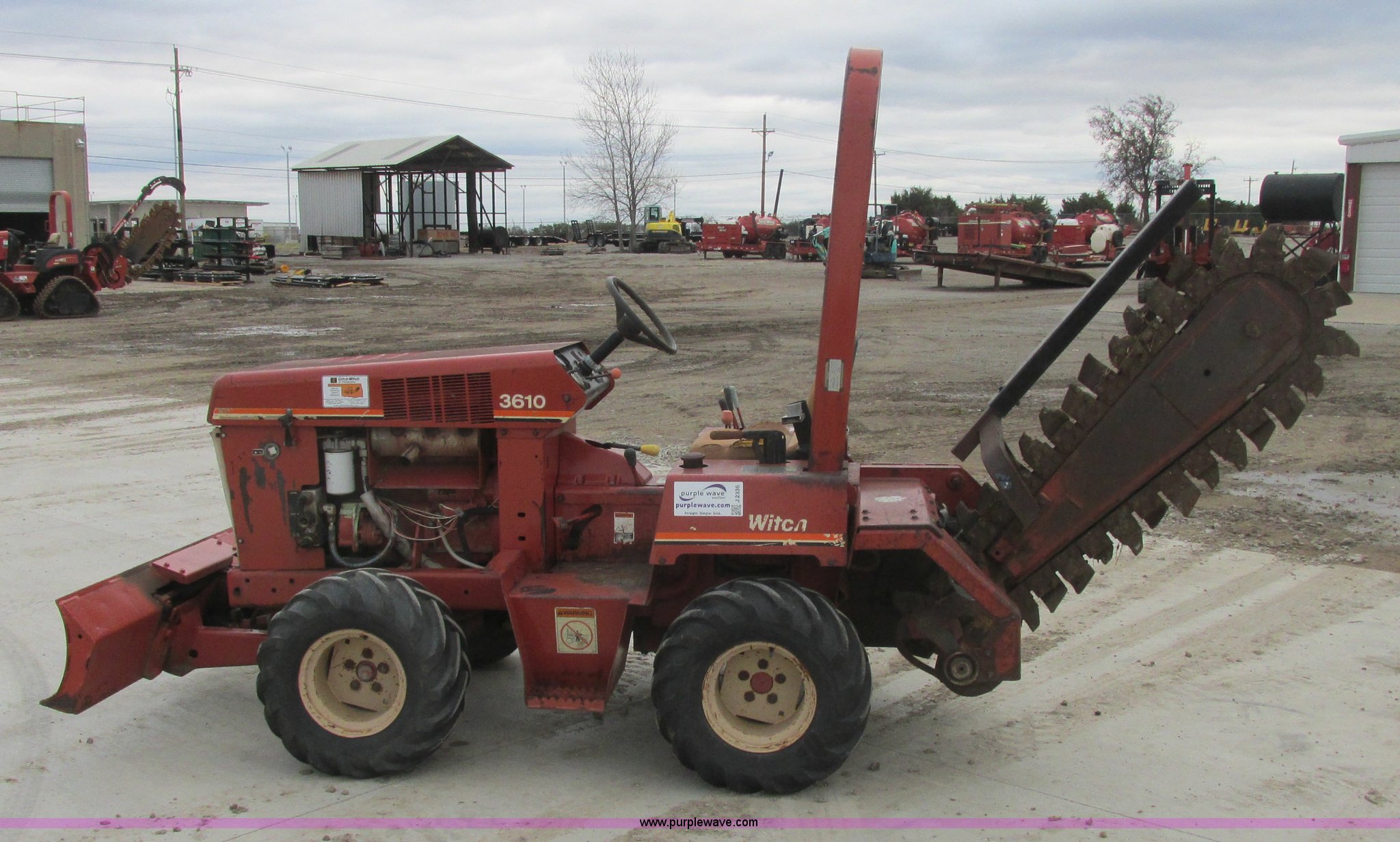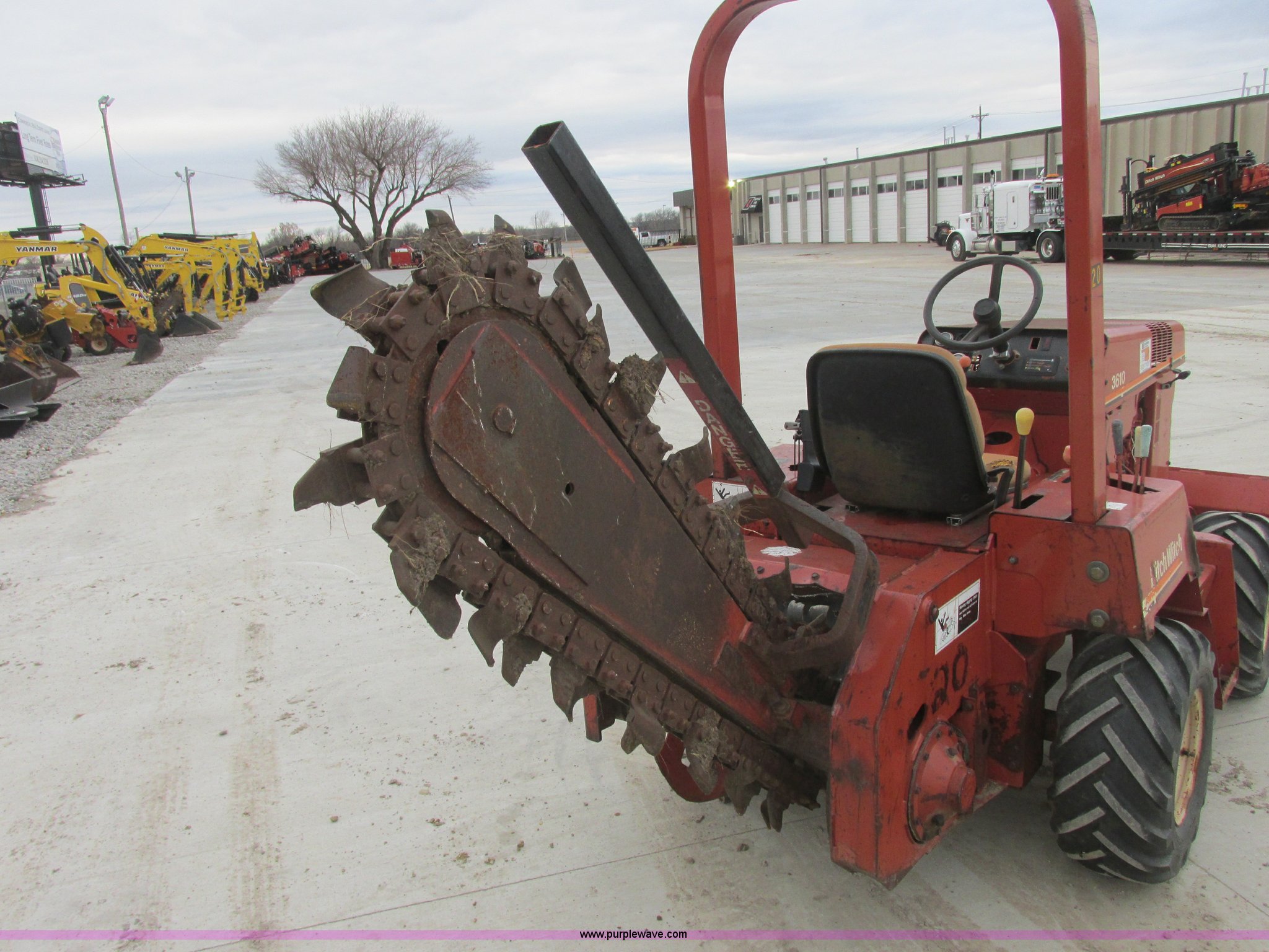 Purple Wave is selling a used Trencher or Rock Saw in Oklahoma. This item is a 1994 Ditch Witch 3610DD trencher with the following: 1,527 hours on meter, Deutz 125 C.I.D. three cylinder diesel engine, 43.5 HP, Type F3L1017, Serial 8360827, 3F-1R gears, Four wheel drive, Hydraulic ground drive, ROPS, Power steering, 64" six-way back fill blade, 13.9" high blade, 11.6" lift about ground on blade, 4' boom with restraint bar, Shark tooth bolt-on combination chain, 26x12.00-12 tires, 3,940 lbs. base operating weight, Serial 3L0139
