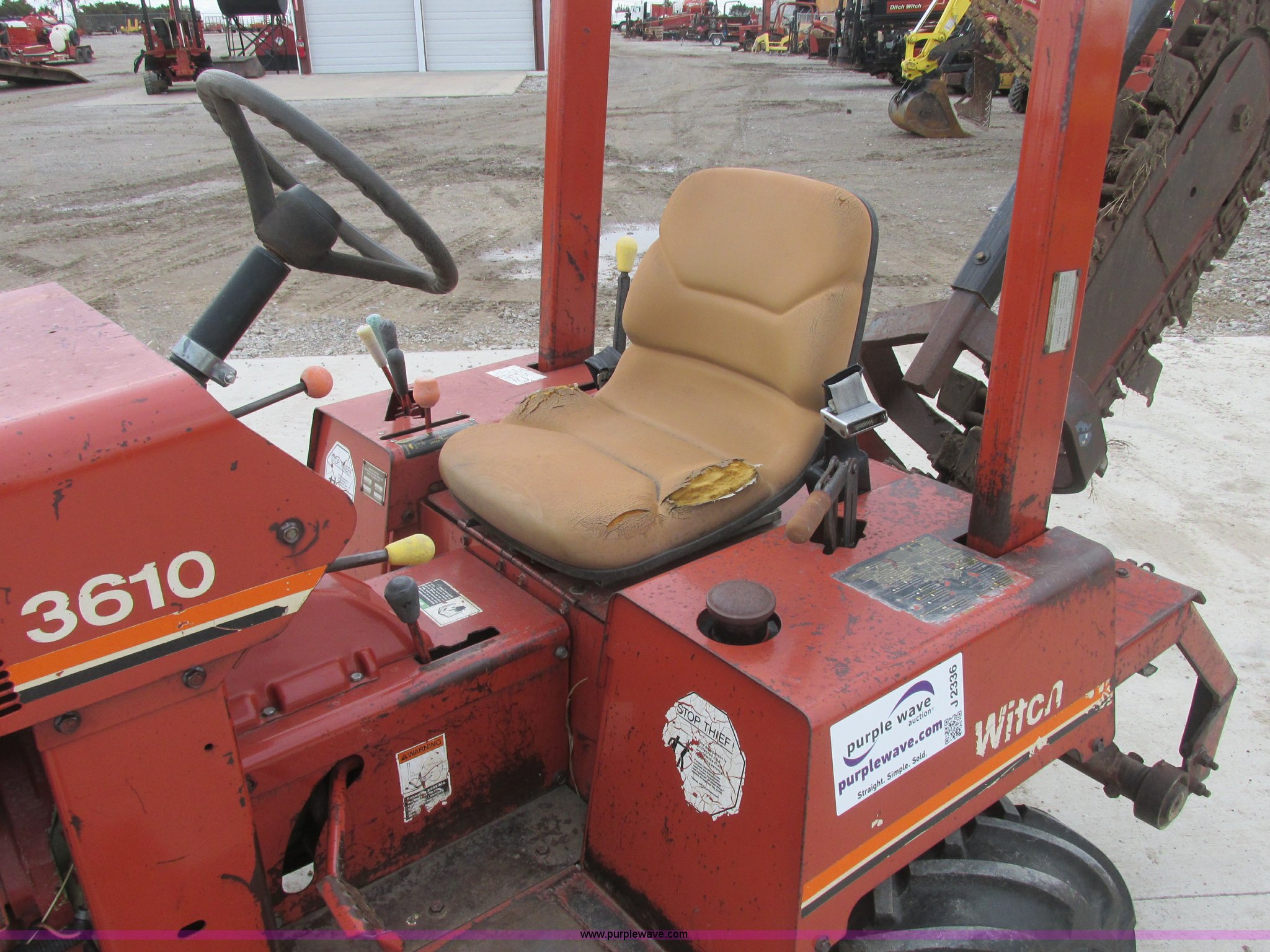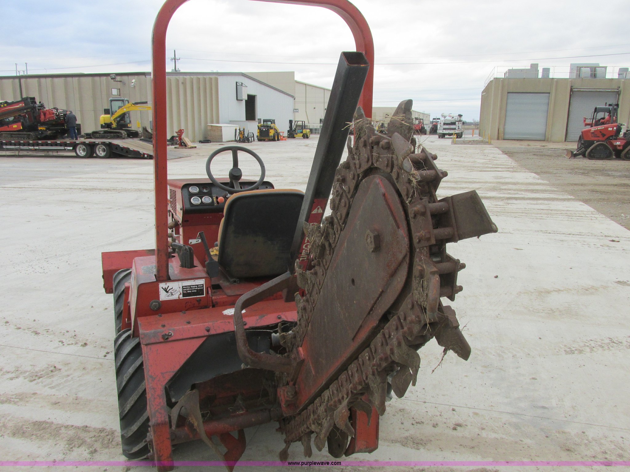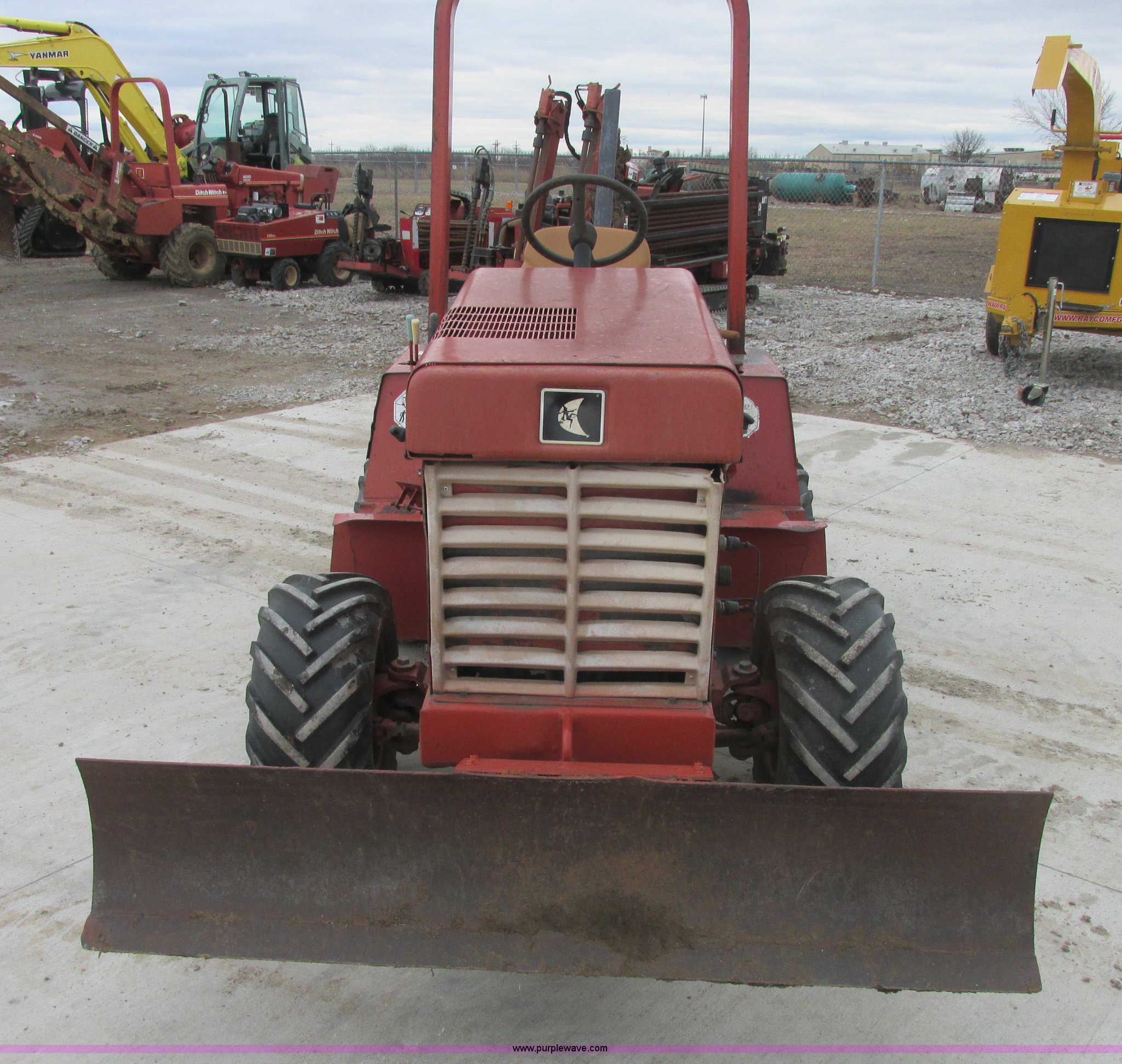 Purple Wave is selling a used Trencher or Rock Saw in Oklahoma. This item is a 1994 Ditch Witch 3610DD trencher with the following: 1,527 hours on meter, Deutz 125 C.I.D. three cylinder diesel engine, 43.5 HP, Type F3L1017, Serial 8360827, 3F-1R gears, Four wheel drive, Hydraulic ground drive, ROPS, Power steering, 64" six-way back fill blade, 13.9" high blade, 11.6" lift about ground on blade, 4' boom with restraint bar, Shark tooth bolt-on combination chain, 26x12.00-12 tires, 3,940 lbs. base operating weight, Serial 3L0139