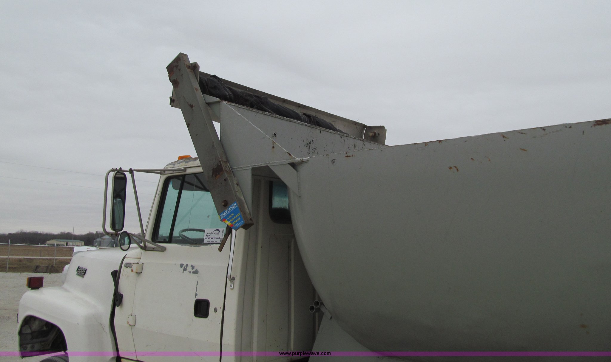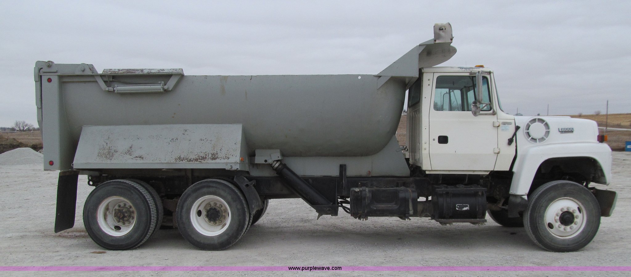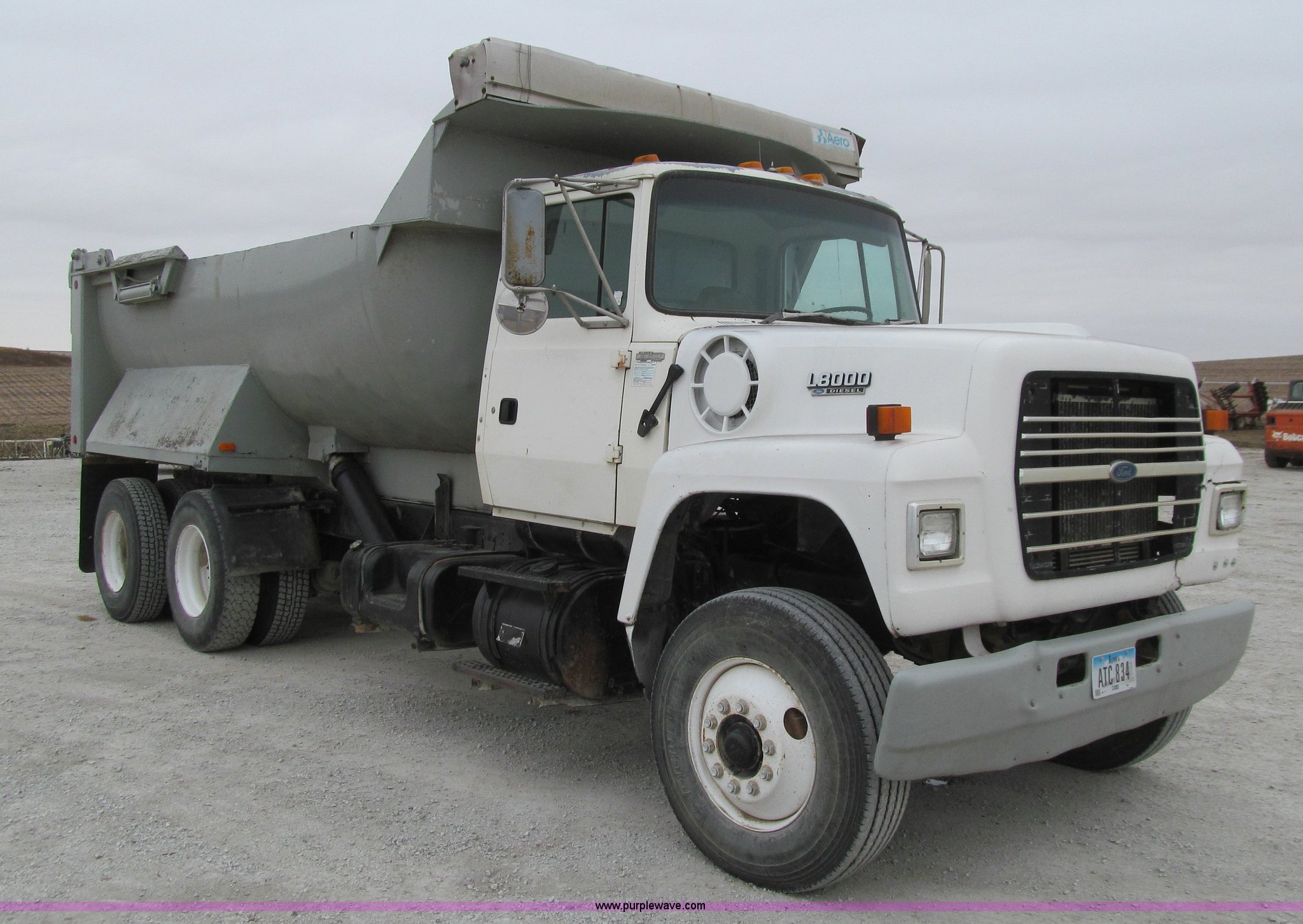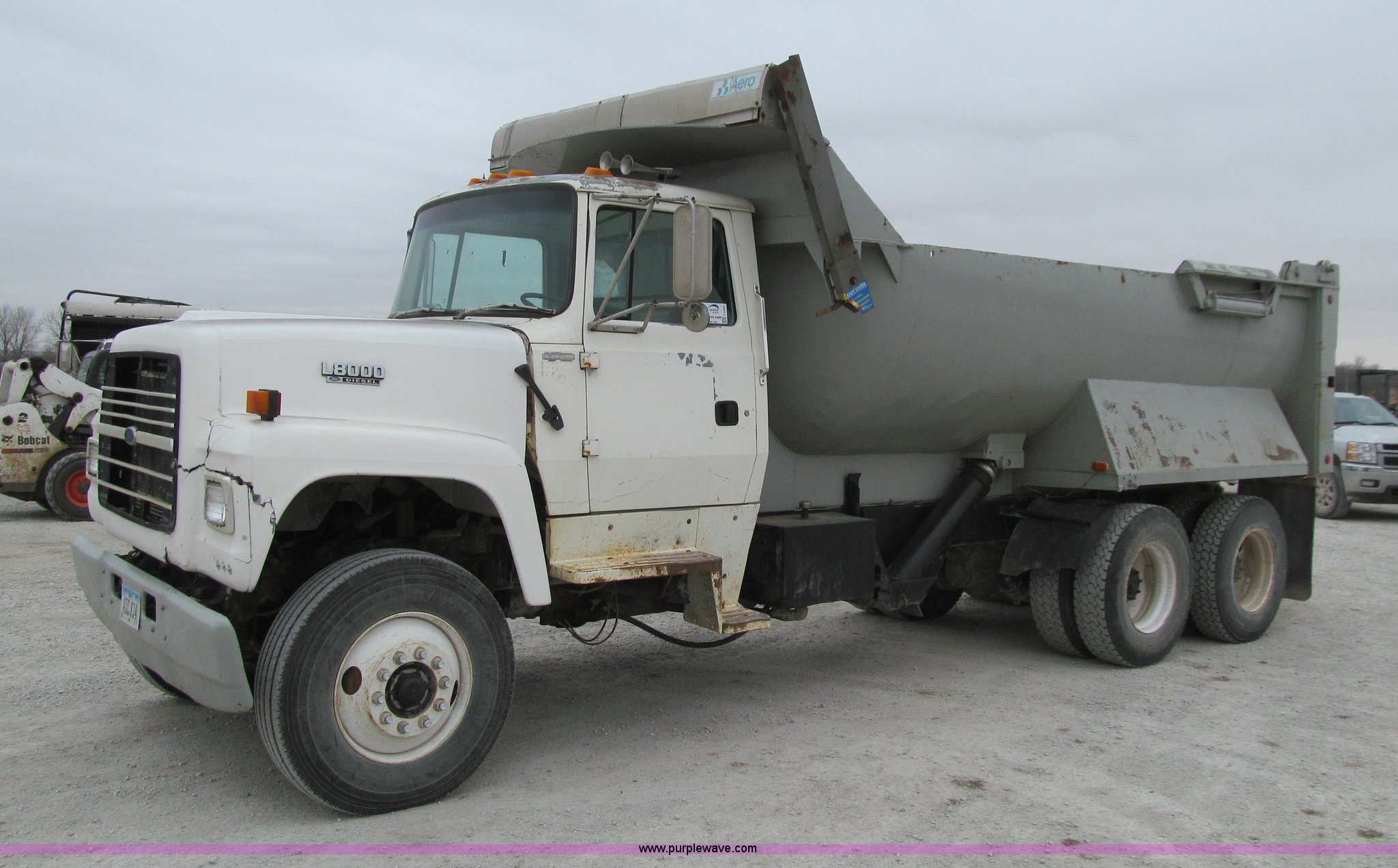 Purple Wave is selling a used Construction Dump Truck in Iowa. This item is a 1991 Ford LT8000 dump truck with the following: 488,285 miles on odometer, Ford 7.8L six cylinder turbo diesel engine, 240 HP, Eaton Fuller Road Ranger eight speed manual transmission, Heat, Air suspension seat, Barrel dump bed, 17.5'L, Dual ram four stage hoist, Air operated end gate, Roll-over tarp, Rear double frame rails, Dual 100 gallon fuel tanks, Hendrikson beam/spring suspension, Air brakes, 232" wheelbase, 11R22.5 tires, GVWR 62,000 lbs, Tarp worn, Engine oil leak, Hood damaged