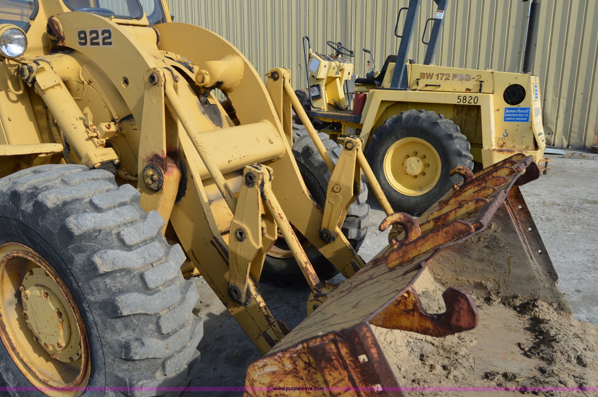Purple Wave is selling a used Wheel Loader in Missouri. This item is a Caterpillar 922 wheel loader with the following: 1,286 hours on meter, Caterpillar four cylinder diesel engine, Two speed transmission, 4F-4R gears, Enclosed cab, Heat, Two stick loader controls, Work lights, 89"W bucket, Smooth cutting edge, 155-25 tires, Serial 59A3877, Unit# 4354