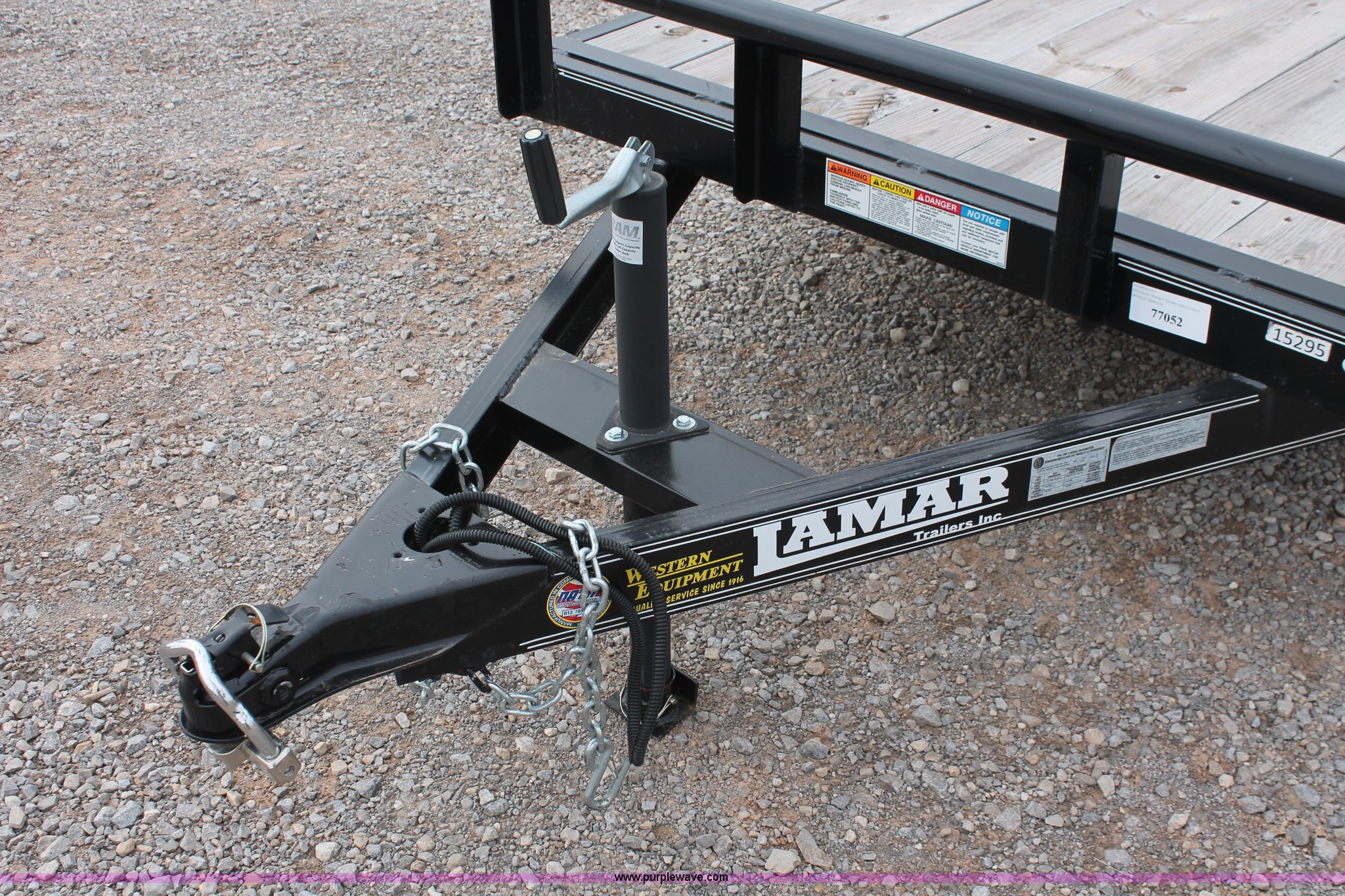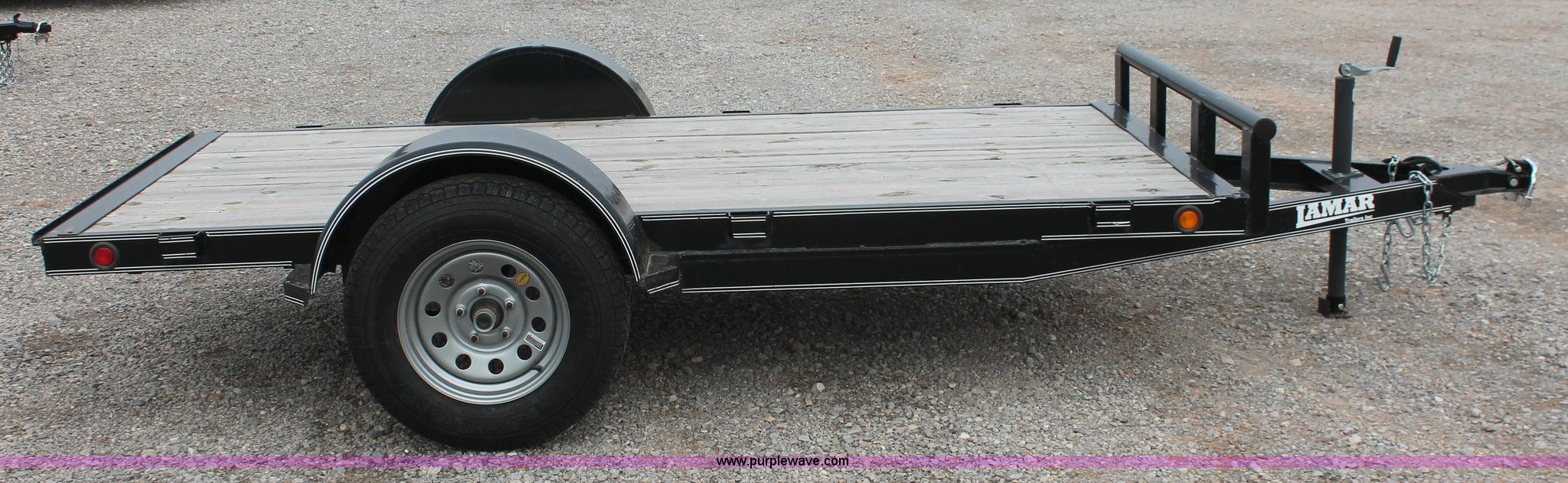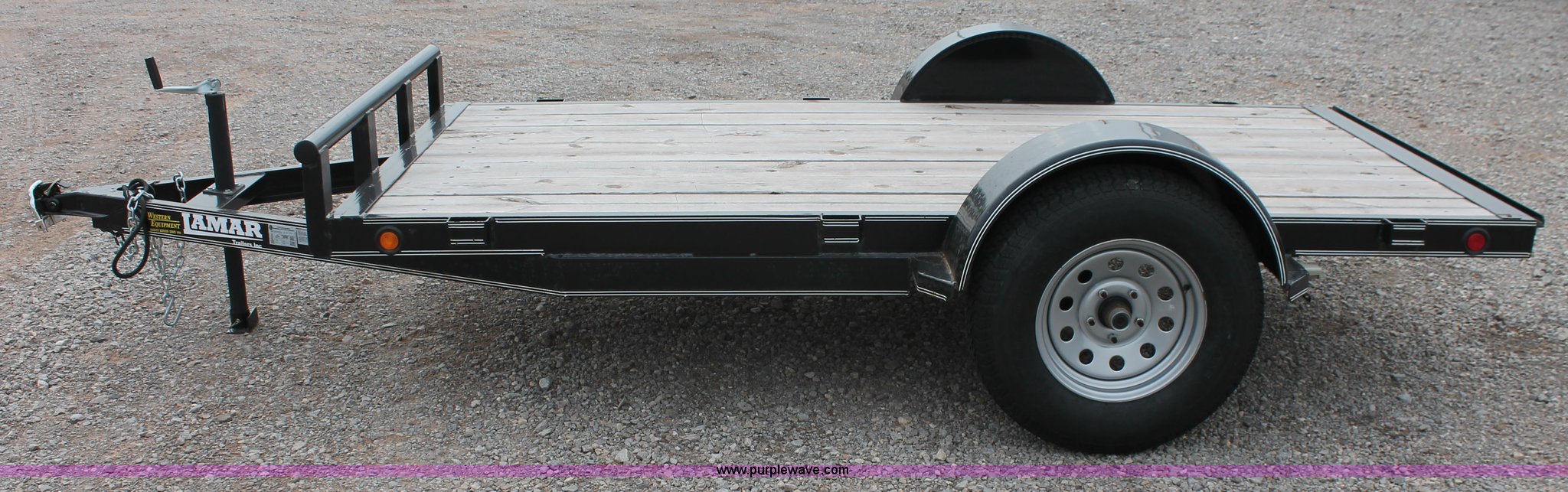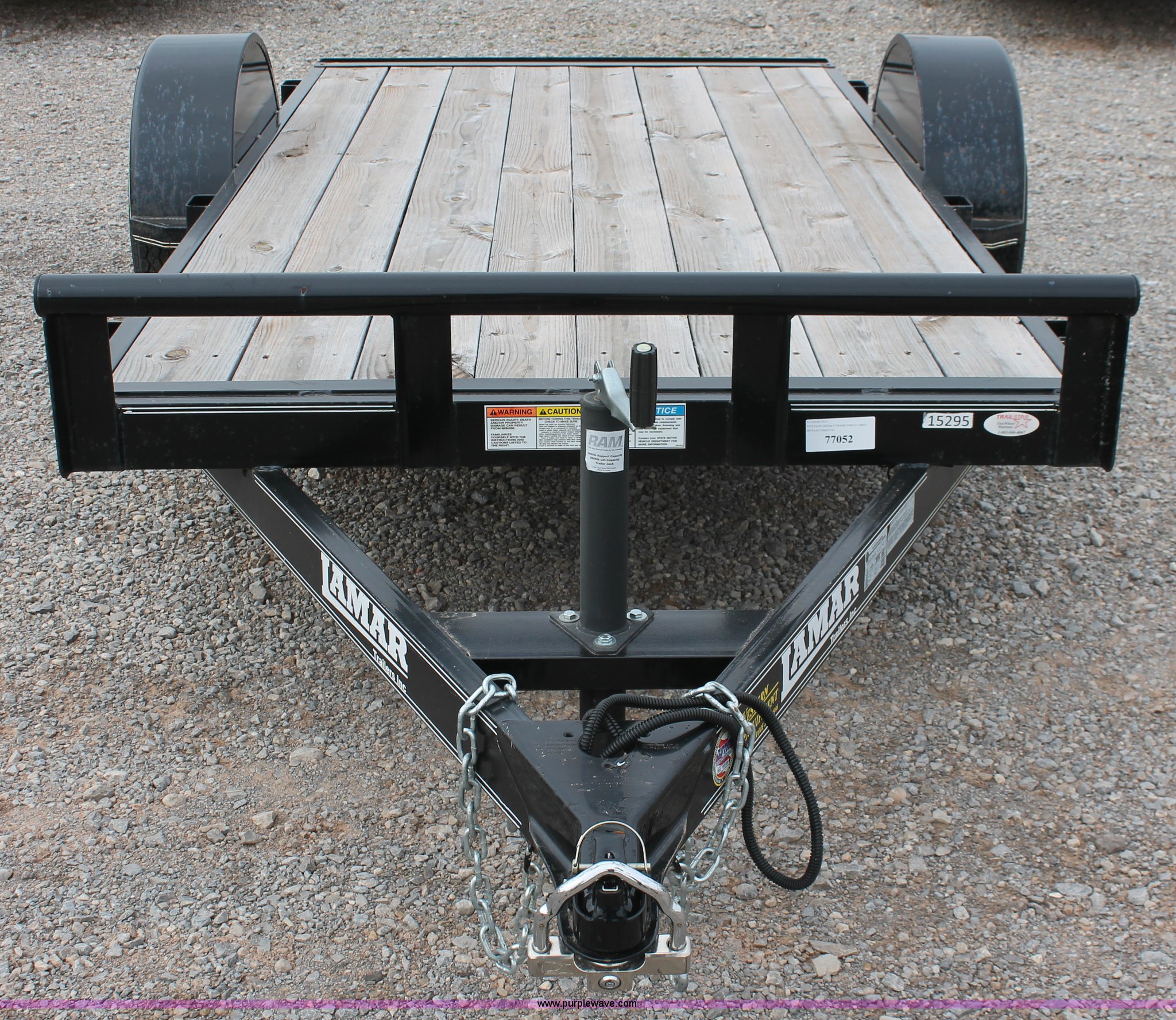 Purple Wave is selling a used Car or Utility Trailer in Oklahoma. This item is a 2013 Lamar flatbed utility trailer with the following: 14'L overall, 10'L x 5'W deck, 4'L neck, Steel frame with wood deck, Stake side pockets, Four prong trailer wiring, 2" ball hitch, ST205/75D15 tires, GVWR 2,990 lbs, Unused, Stock# 77052