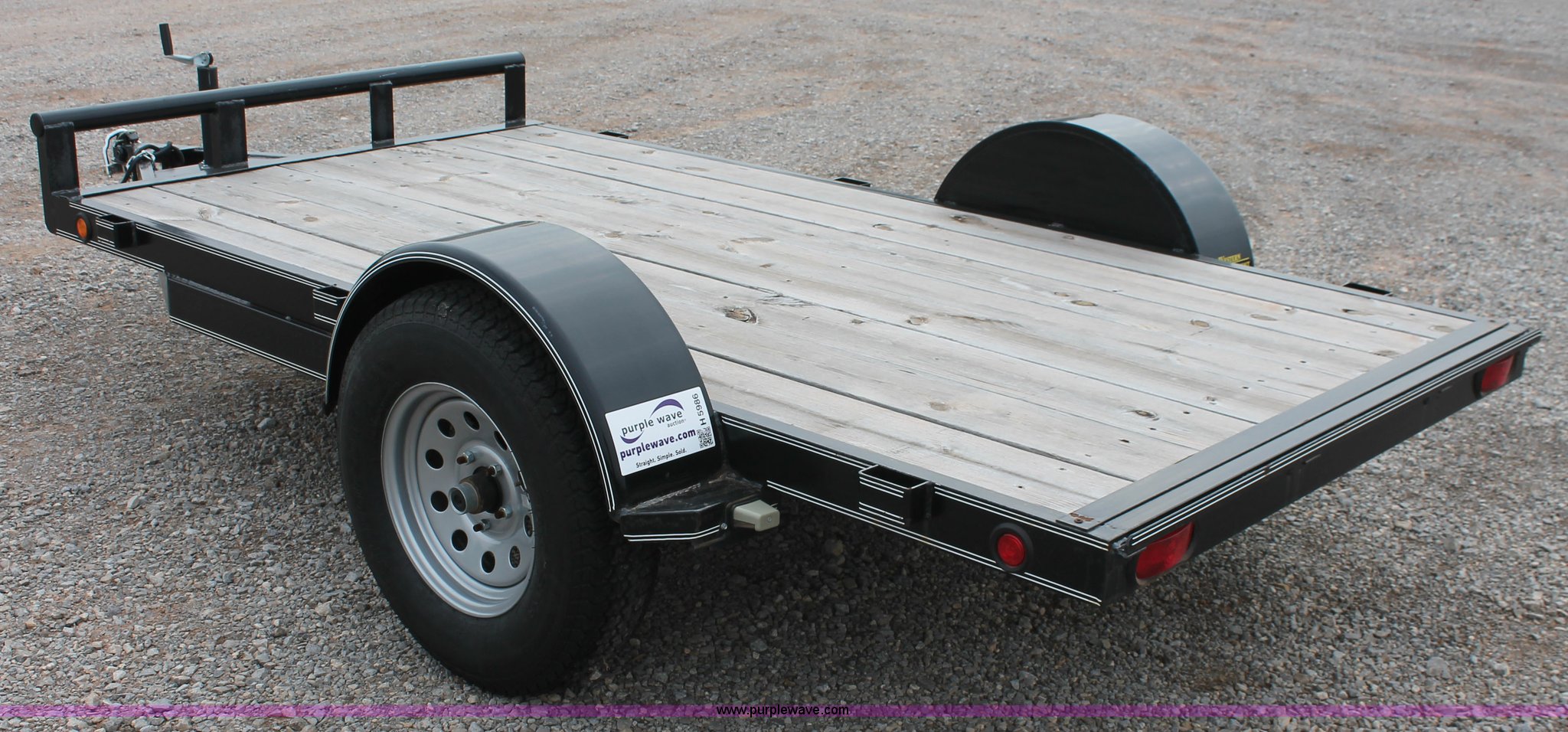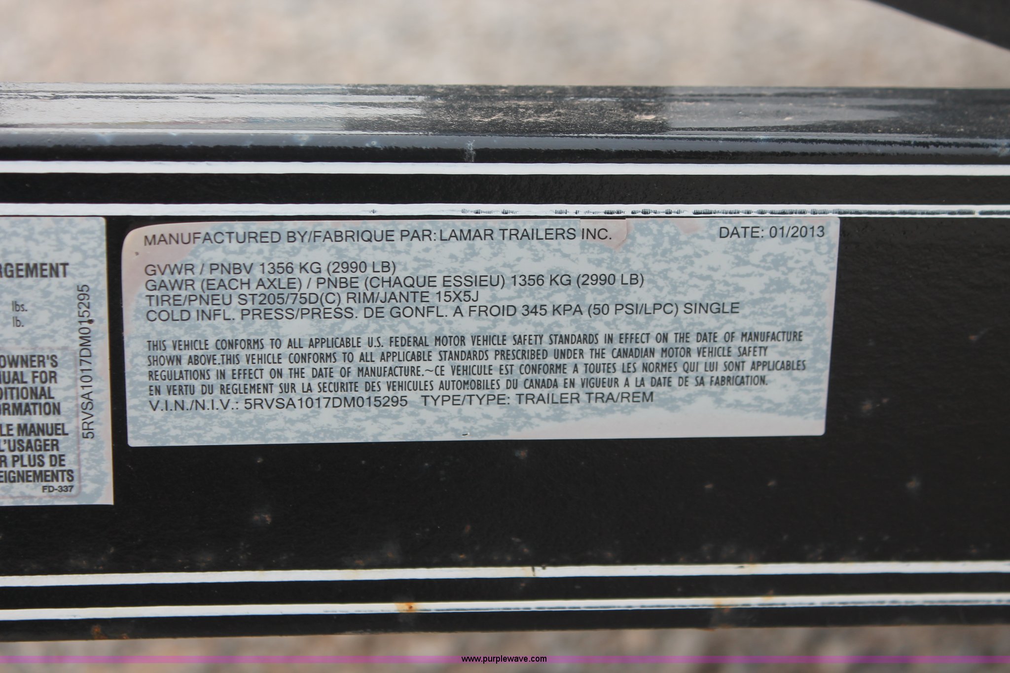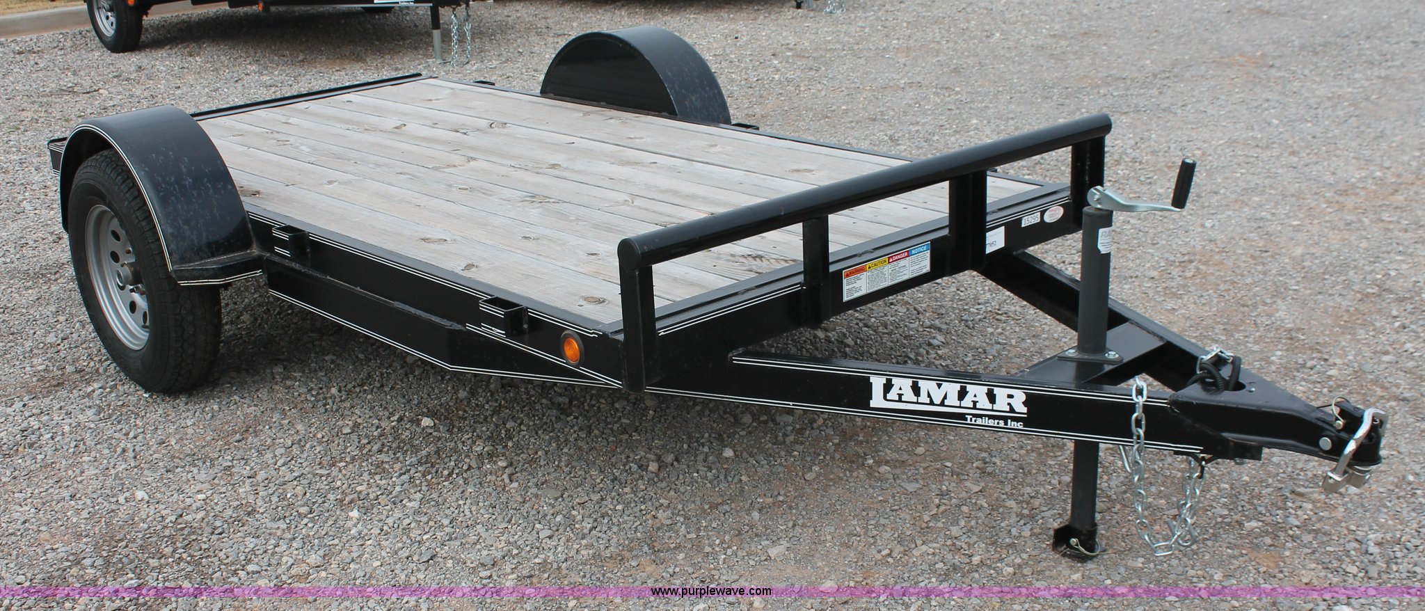 Purple Wave is selling a used Car or Utility Trailer in Oklahoma. This item is a 2013 Lamar flatbed utility trailer with the following: 14'L overall, 10'L x 5'W deck, 4'L neck, Steel frame with wood deck, Stake side pockets, Four prong trailer wiring, 2" ball hitch, ST205/75D15 tires, GVWR 2,990 lbs, Unused, Stock# 77052