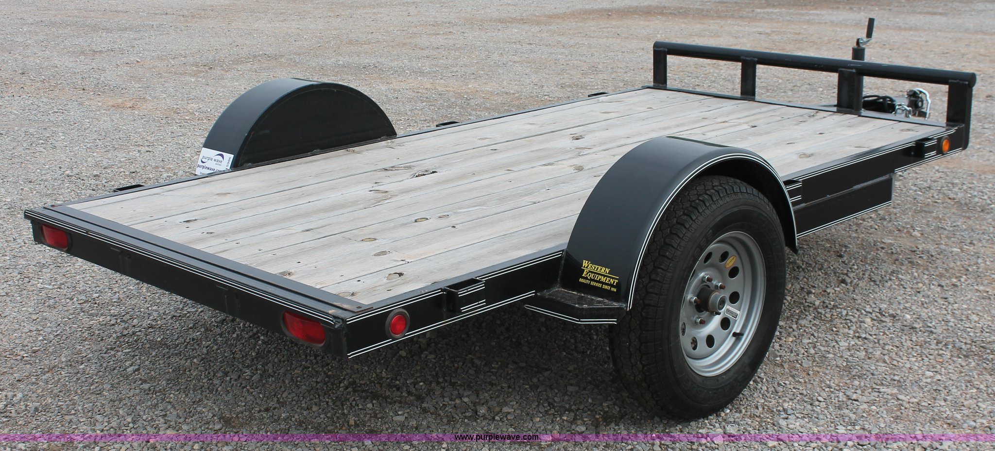 2013 Lamar flatbed utility trailer. 14'L overall, 10'L x 5'W deck, 4'L neck, Steel frame with wood deck, Stake side pockets, Four prong trailer wiring, 2" ball hitch, ST205/75D15 tires, GVWR 2,990 lbs, Unused, Stock# 77052. Seller is an Oklahoma licensed motor vehicle dealer. Title will be assigned and distributed by the dealer. Please contact the seller for distribution questions. 5RVSA1017DM015295. Western Equipment, LLC. 10036 US Hwy 183. Clinton, OK 73601