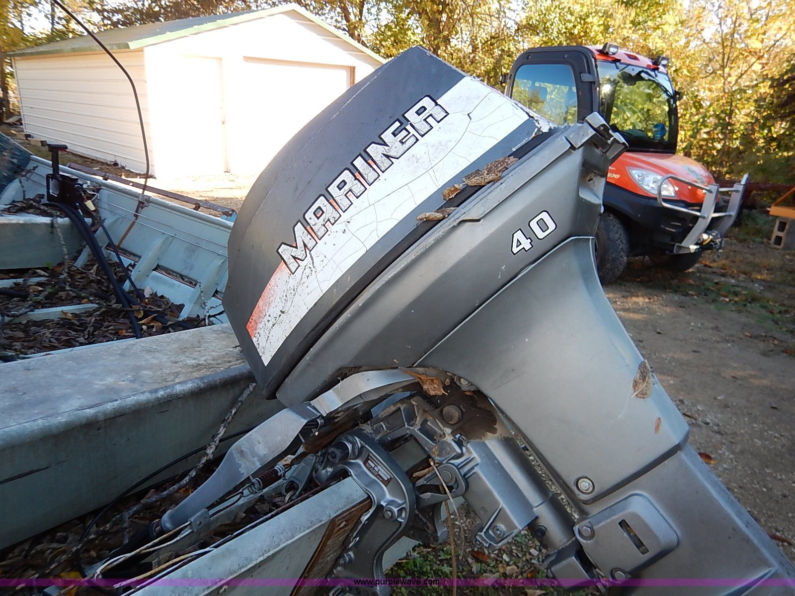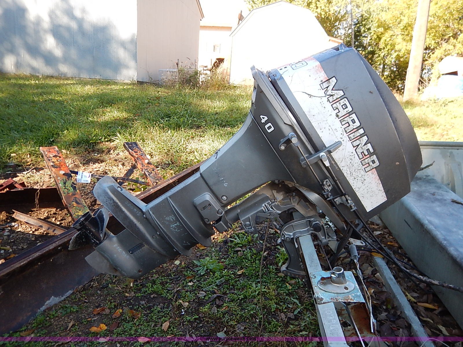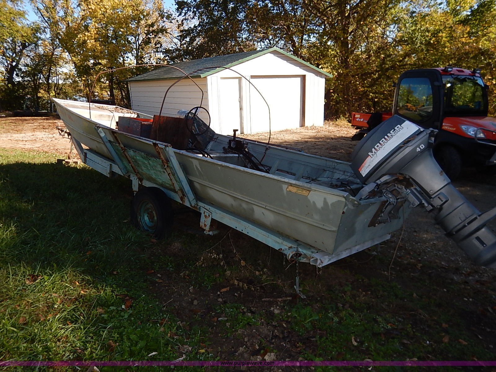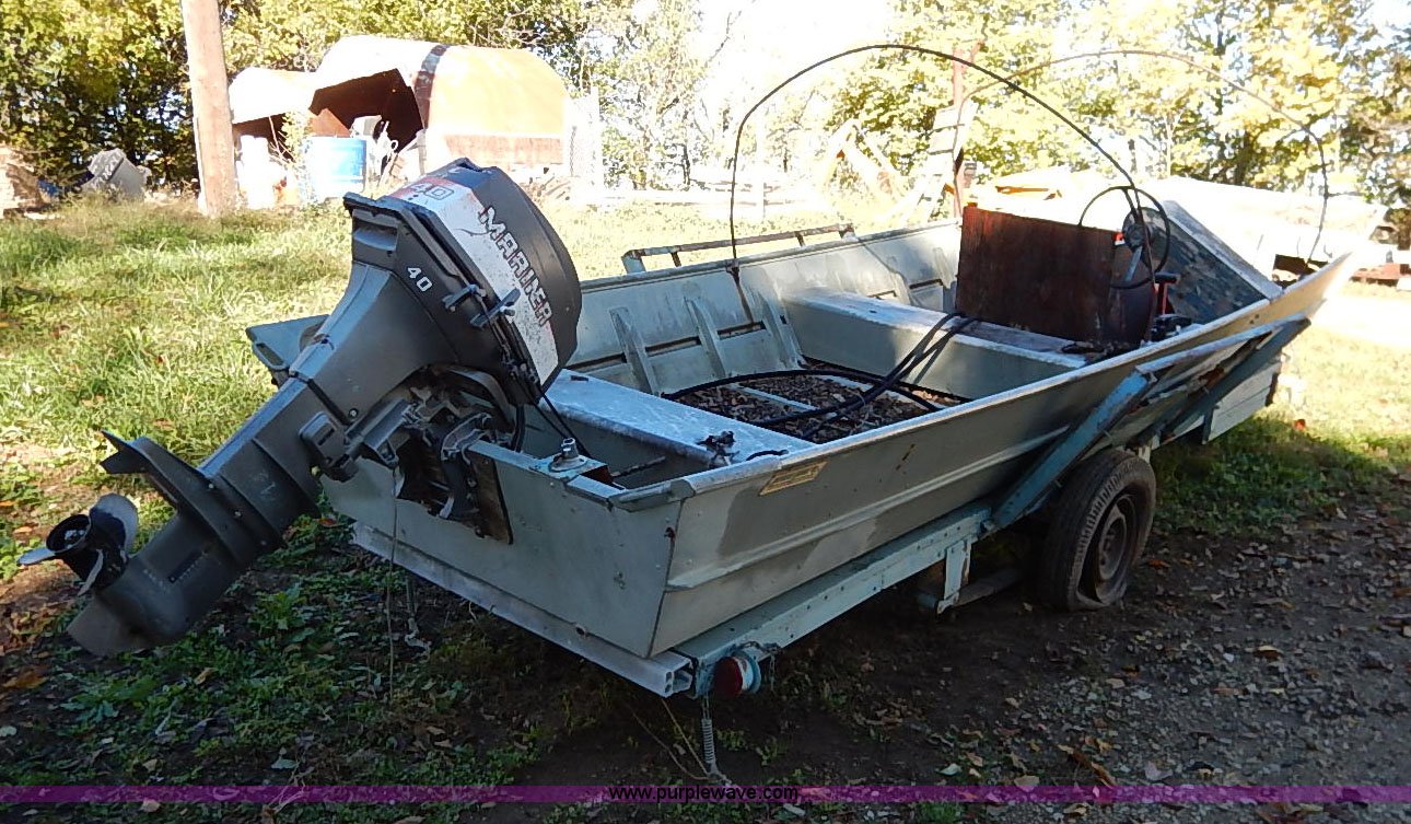 Purple Wave is selling a used Boat in Kansas. This item is a Lowe Line aluminum flat bottom boat with the following: Mariner 40 outboard motor, Light hookup, Hull I.D. LWNL6873M76B-20BJ, 20'L shop built trailer, 1 7/8" ball hitch, Safety chains, Jack, 195/75R14 tires, Tires are flat, Propeller damaged, Taillights damaged, Unknown running condition