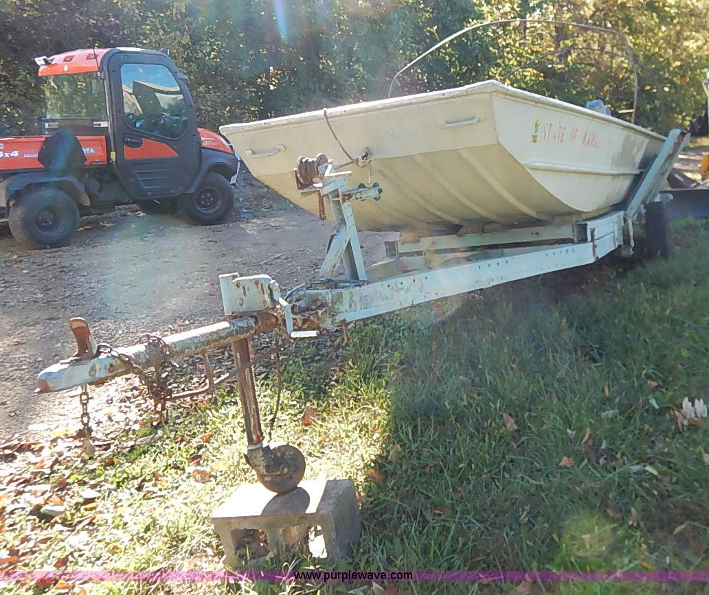 Lowe Line aluminum flat bottom boat. Mariner 40 outboard motor, Light hookup, Hull I.D. LWNL6873M76B-20BJ, 20'L shop built trailer, 1 7/8" ball hitch, Safety chains, Jack, 195/75R14 tires Tires are flat, Propeller damaged, Taillights damaged, Unknown running condition. Pomona State Park. Vassar, KS 66543
