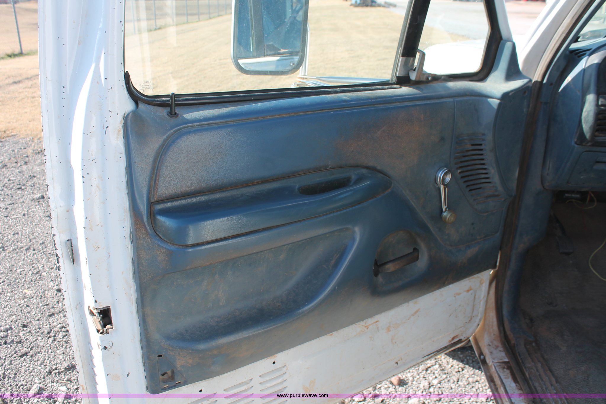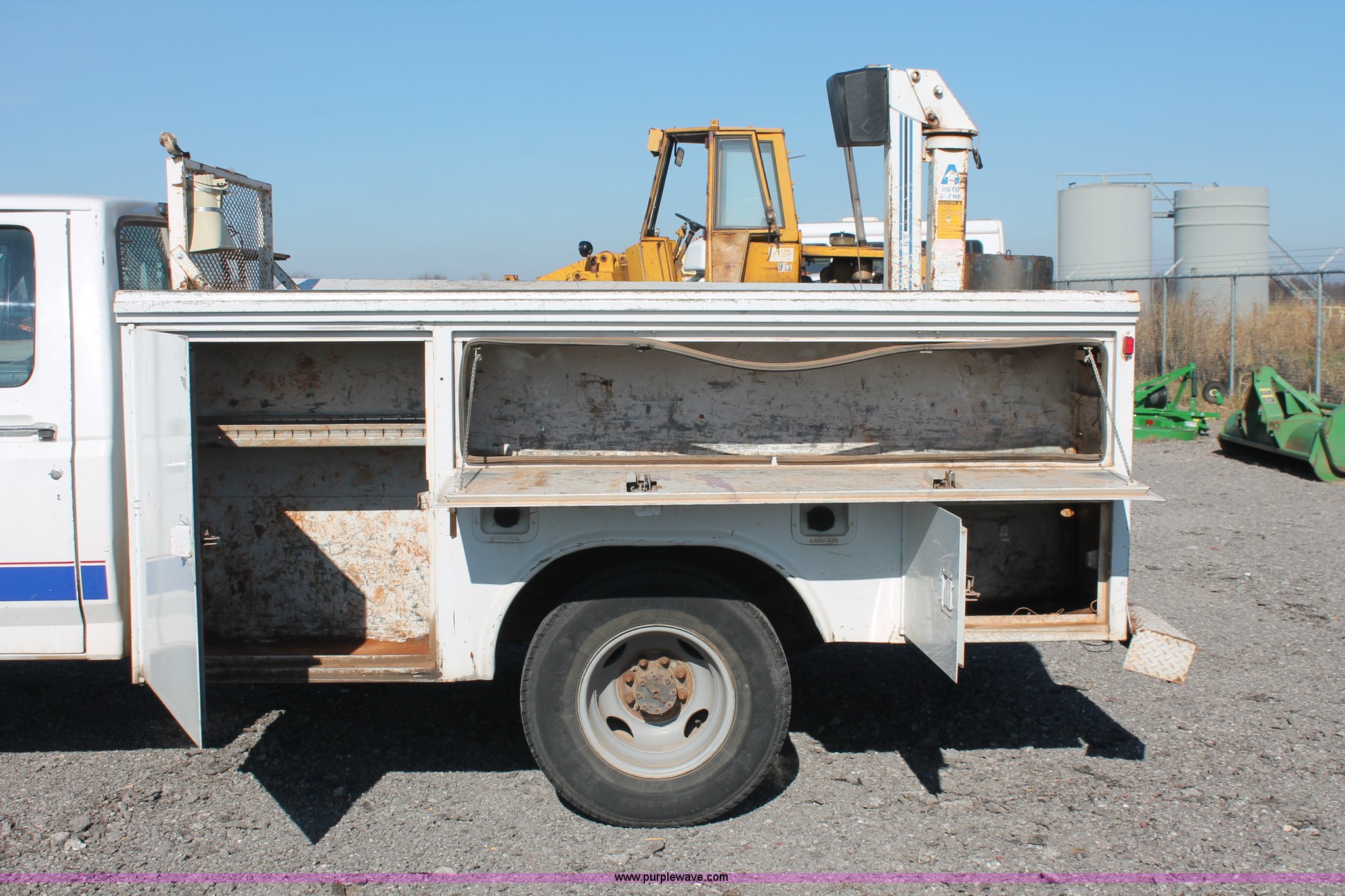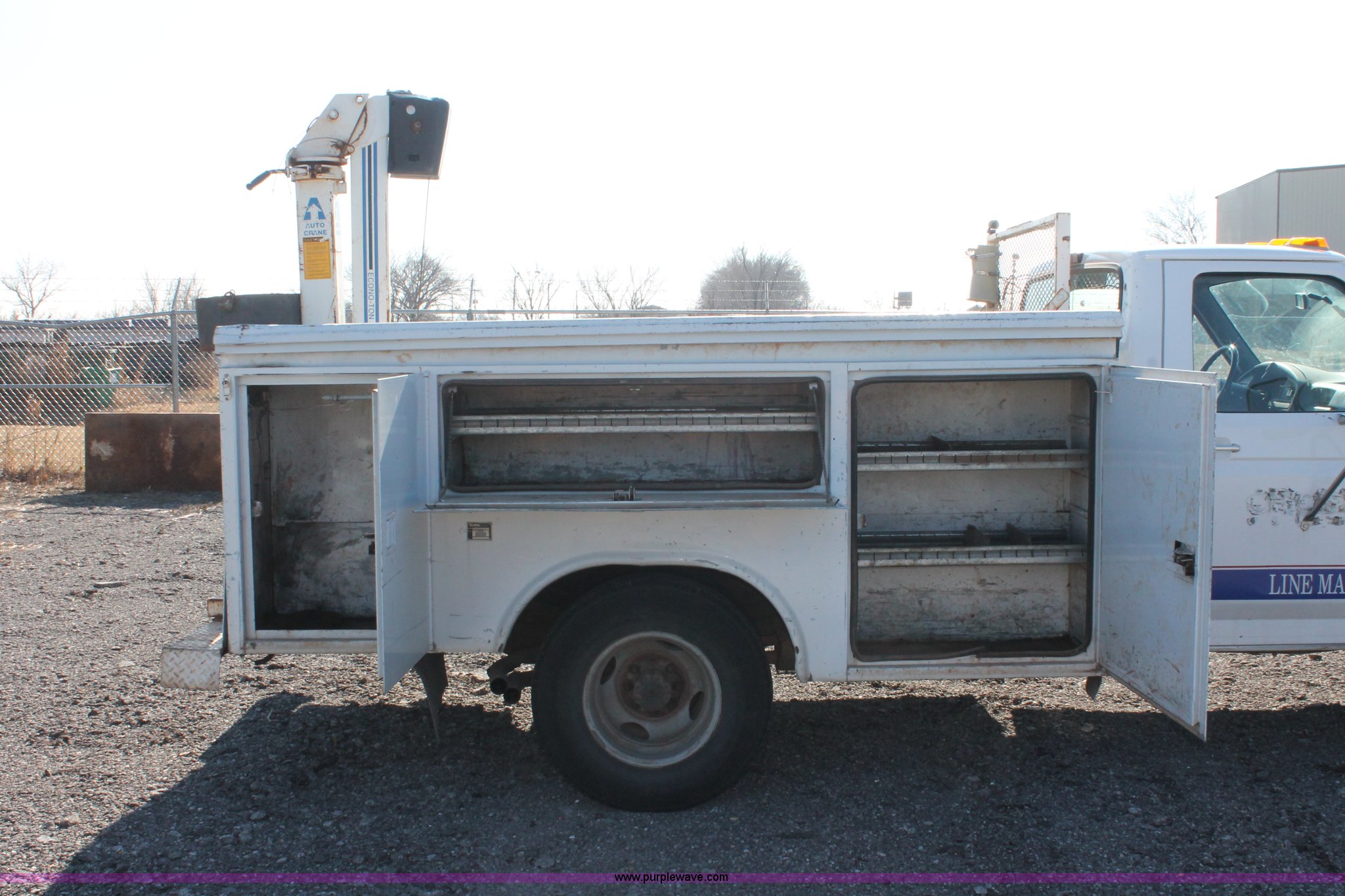 Purple Wave is selling a used Service Truck in Oklahoma. This item is a 1997 Ford F350 XL utility truck with the following: 135,296 miles on odometer, 7.5L V8 OHV 16V gas engine, Automatic transmission, AC and heat, AM/FM, Manual windows and locks, Vinyl interior, Dual fuel tanks, Reading 9'L utility bed, (6) storage compartments, Internal shelving, Auto Crane Econo-Ton II crane, 2,000 lbs capacity, Wired control box, 2" and 2 5/16" ball hitches, Firestone Transforce LT215/85R16 tires