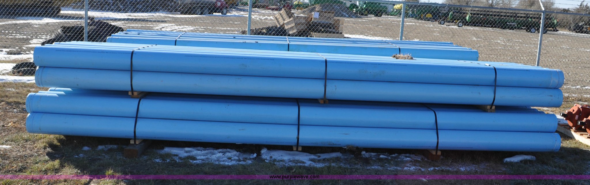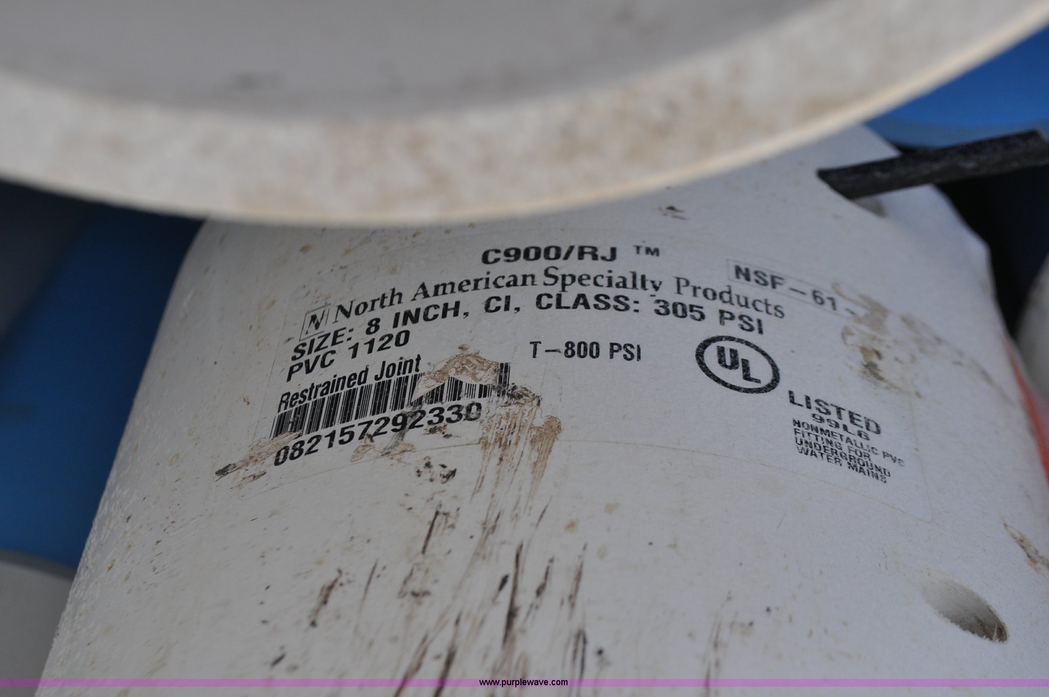 Purple Wave is selling a used Pipe in South Dakota. This item is a North American Specialty pipe water main pipe with the following: (48) joints, 8" CI DR18 PC235 T-600 PVC pipe, C900/RJ restrained JT. water main pipe, 20' joint with two Certain Teed C900/RJ restrained joint couplers, (47) joints have approximately 4" cut off the end, (12) joints have double vent holes drilled towards end of pipe