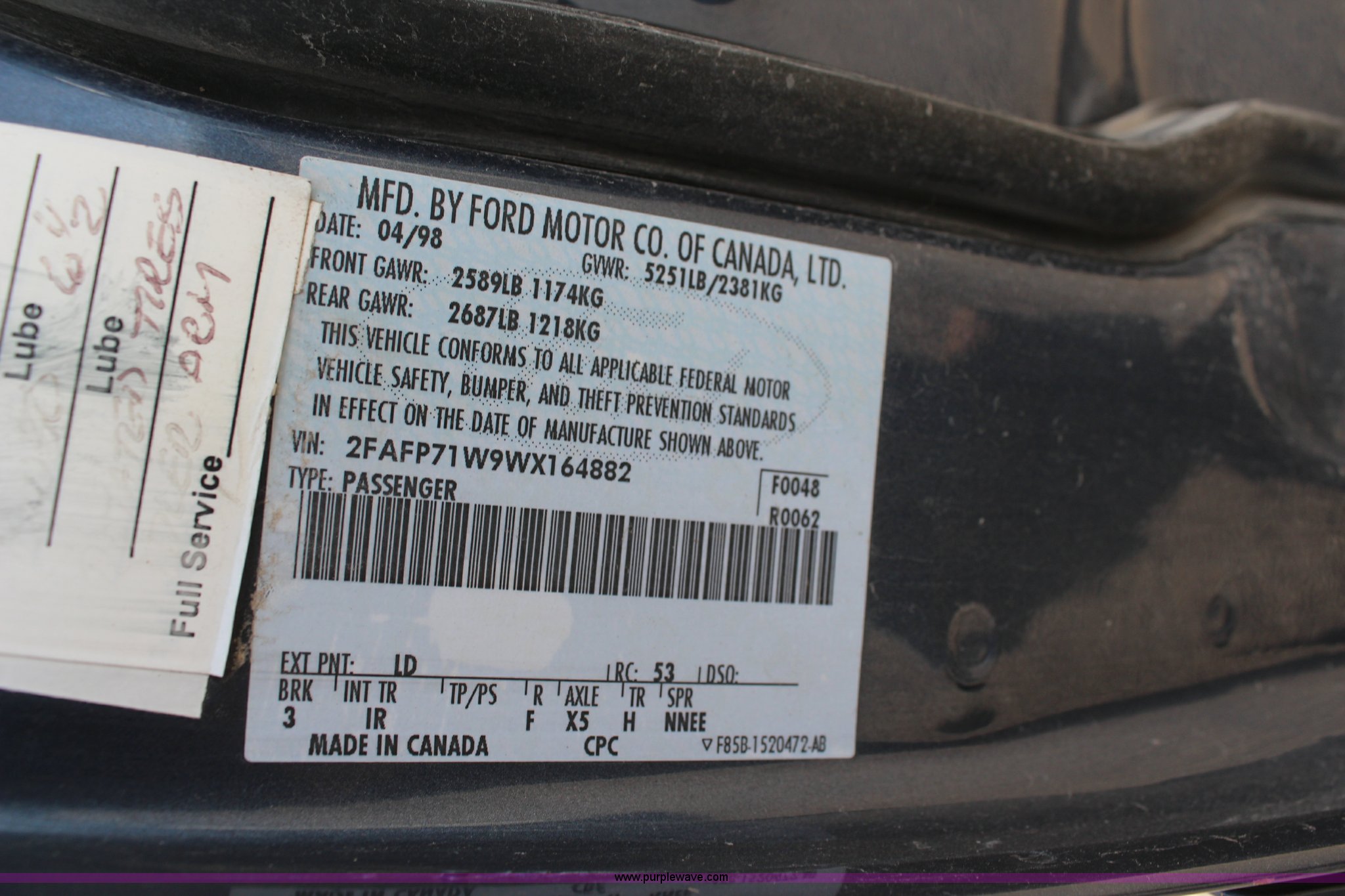 1998 Ford Crown Victoria Police Interceptor. 116,677 miles on odometer, 4.6L V8 SOHC 16V gas engine, Automatic transmission, AC and heat AC does not cool, Tilt, Cruise, Power windows, locks, and mirrors Power windows inoperable, Cloth interior, Spotlight, 225/60R16 tires, Contents not included. Seller is a government entity who will be assigning and distributing the title. Please contact the seller for distribution questions. 2FAFP71W9WX164882. Bonner Springs, KS 66012