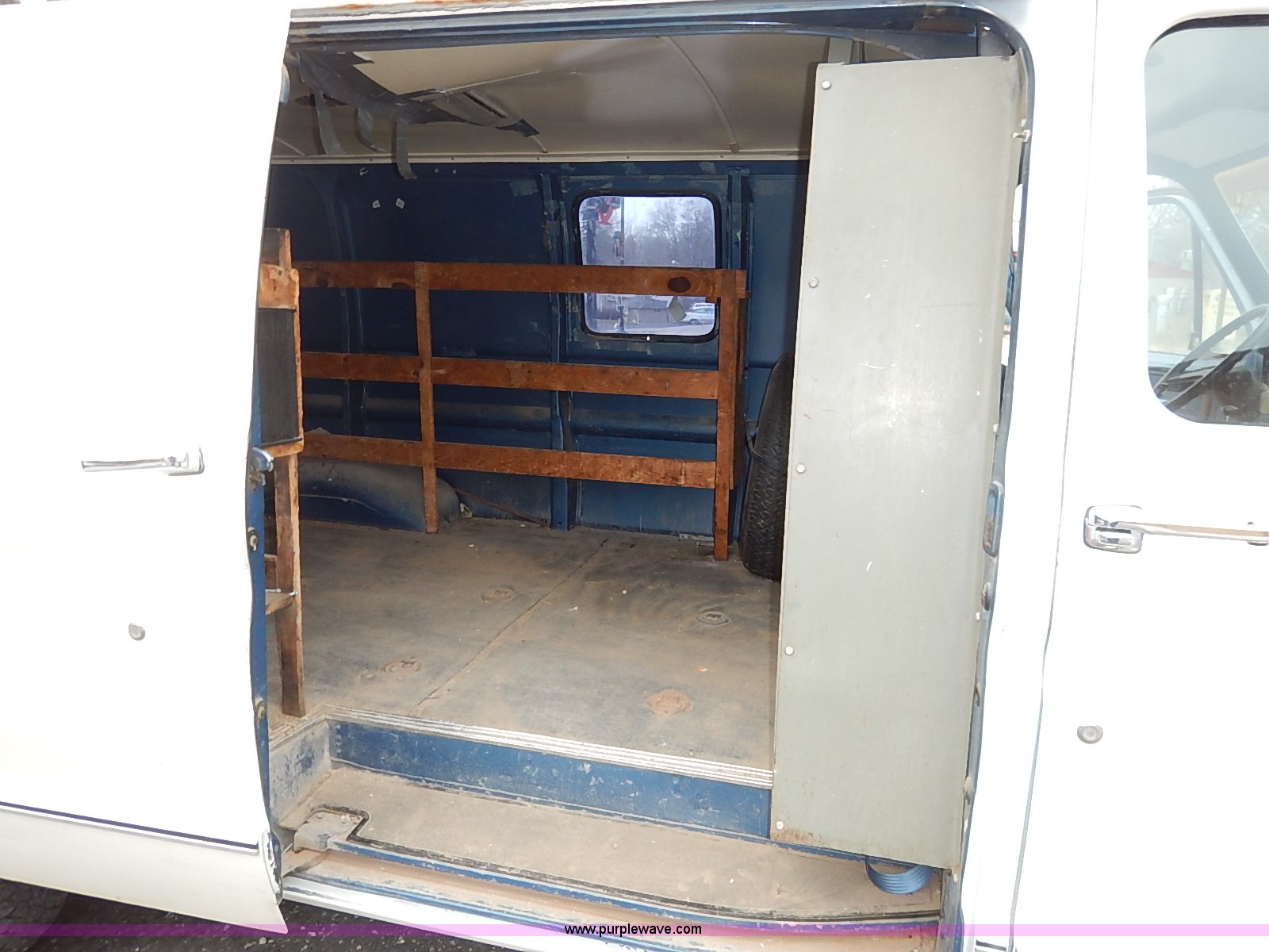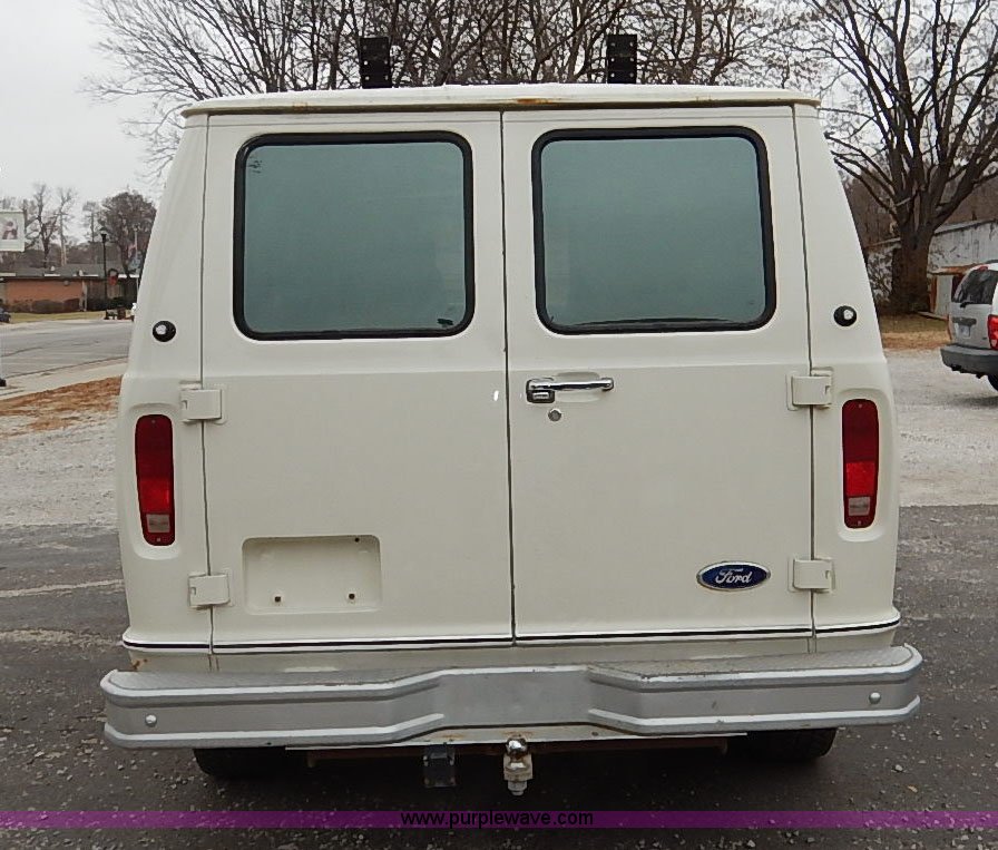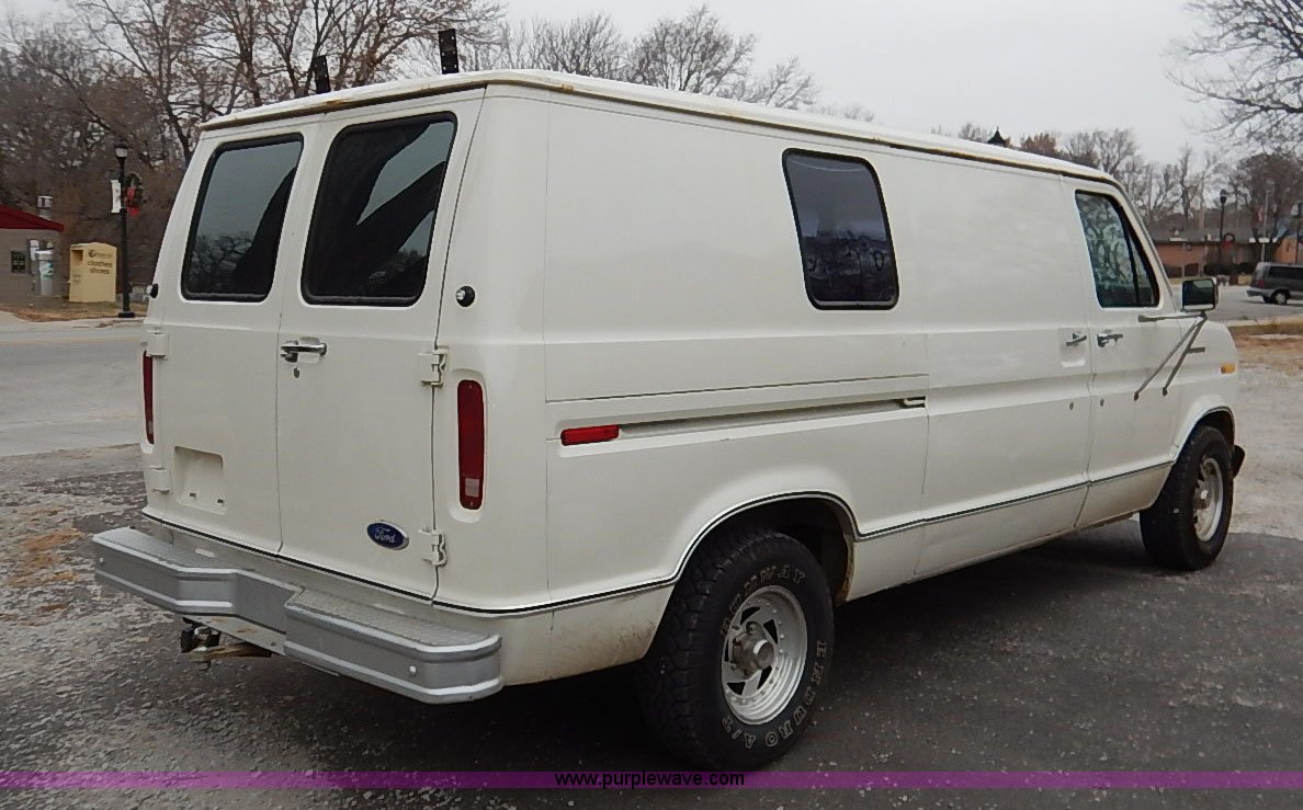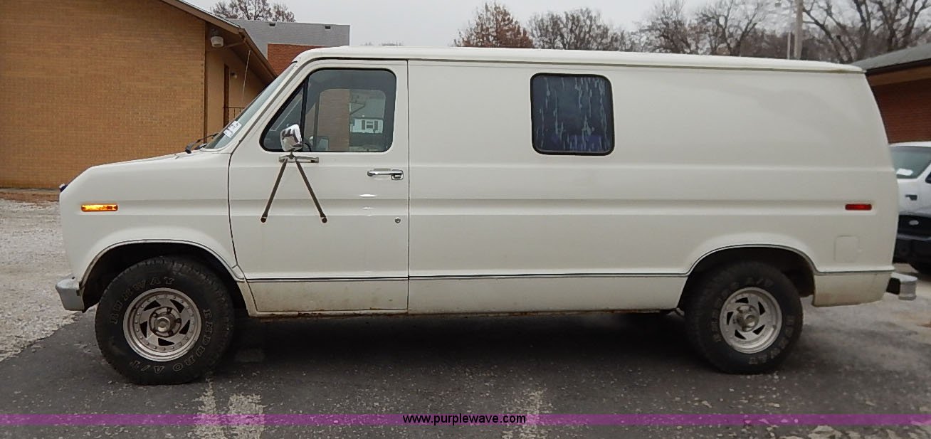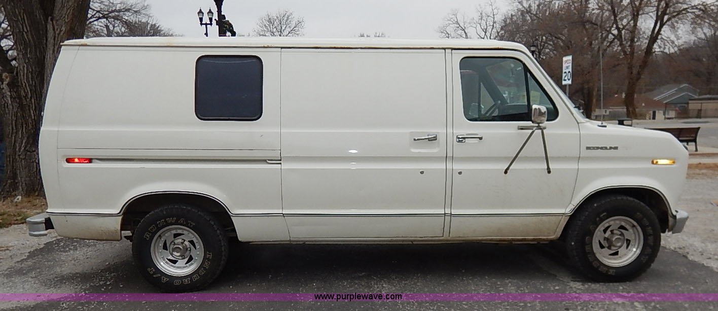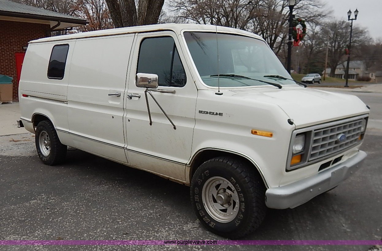 Purple Wave is selling a used 1/2 Ton Pickup or Van in Kansas. This item is a 1988 Ford Econoline E150 cargo van with the following: 42,969 miles on odometer, 5.0L V8 OHV 12V gas engine, Automatic transmission, AC and heat, AC inoperable, AM/FM, Power windows and locks, Cloth interior, Strobe lights, Shelving included, Driver and passenger seats only, Ball hitch, Trailer wiring, 275R15 tires, Recently replaced tires, Rust, Dents, Scratches, Holes in roof