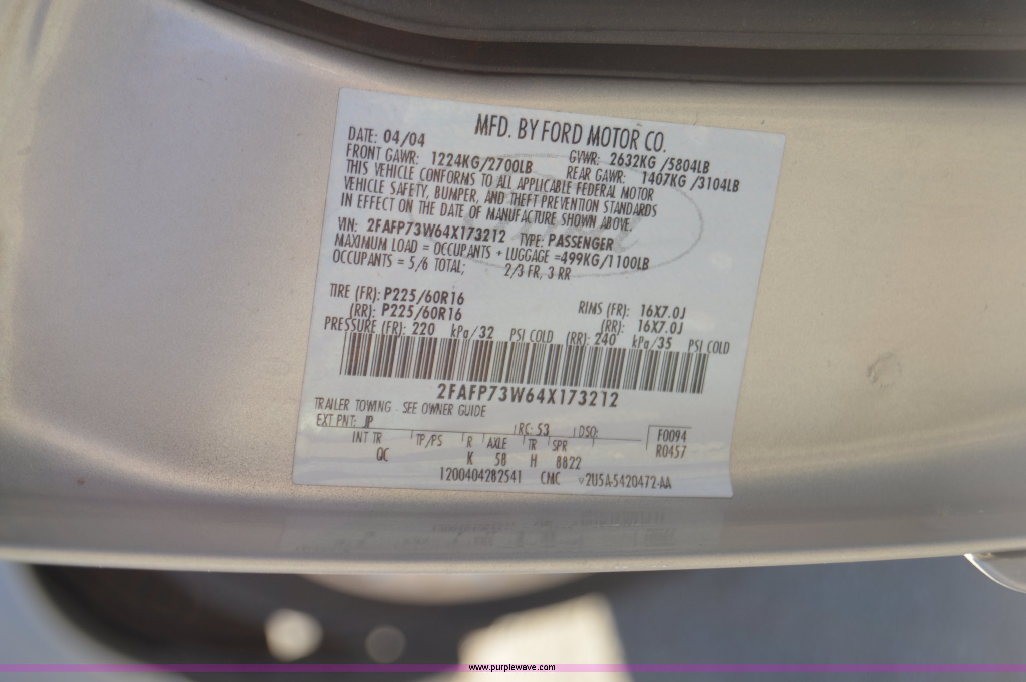 Purple Wave is selling a used Passenger Vehicle in Missouri. This item is a 2004 Ford Crown Victoria with the following: 63,889 actual miles, 4.6L V8 SOHC 16V gas engine, Automatic transmission, AC and heat, Tilt, Cruise, AM/FM/cassette, Power windows, locks, mirrors, and seats, Cloth interior, 225/60R16 tires