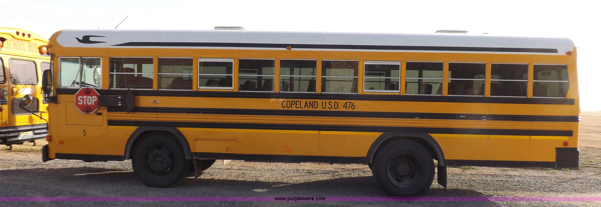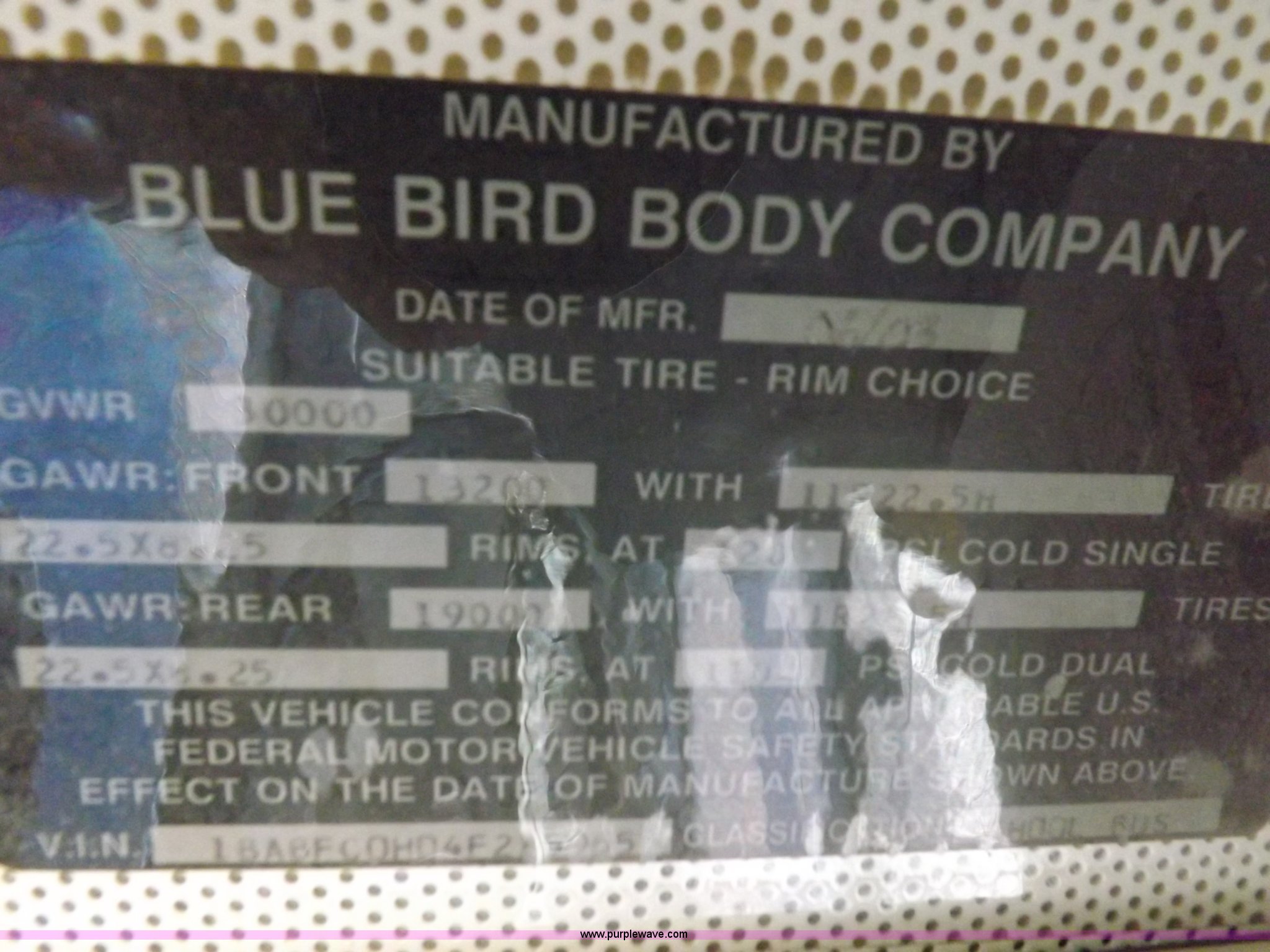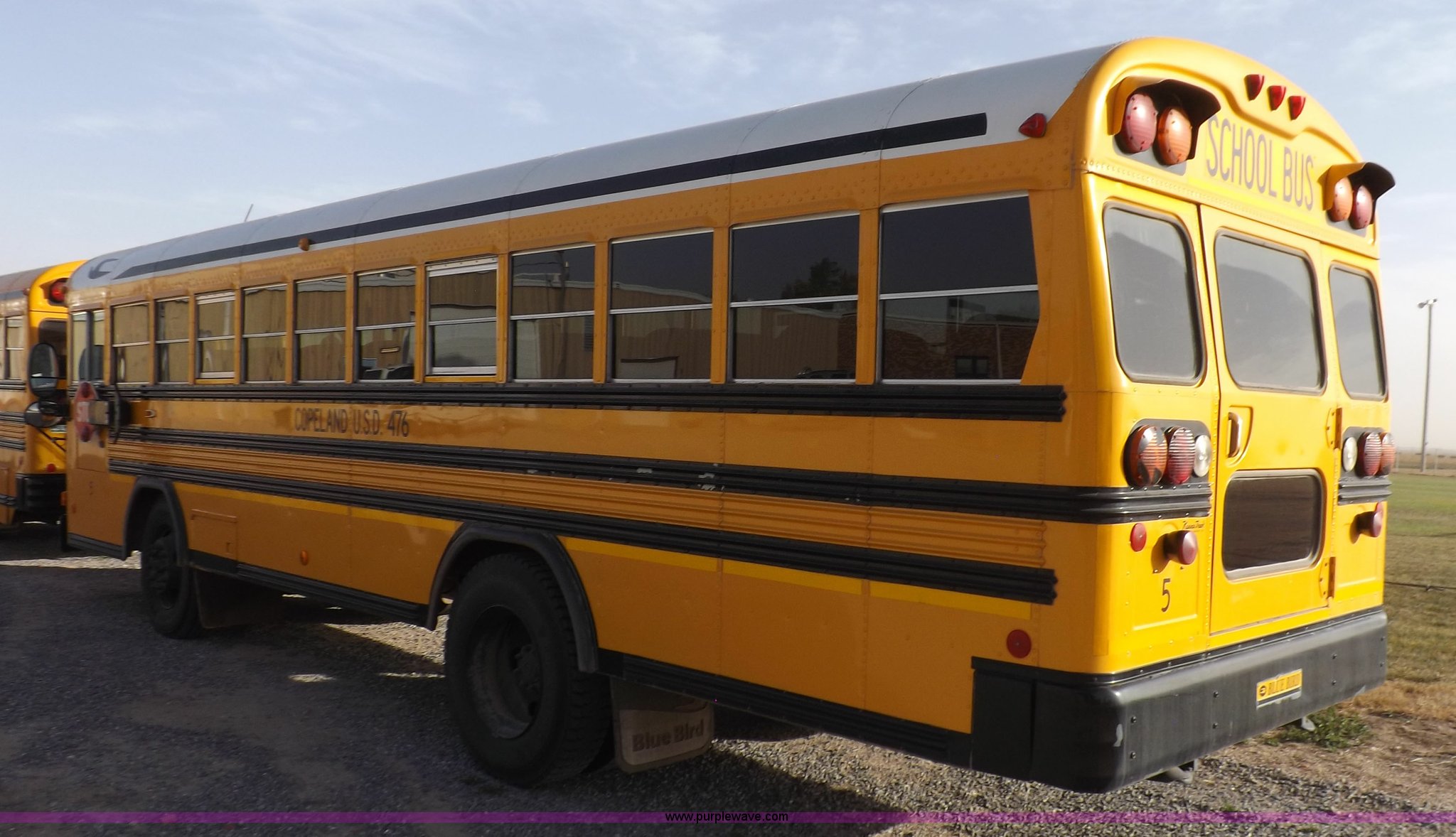 Purple Wave is selling a used Bus in Kansas. This item is a 2004 Blue Bird school bus with the following: Approx. 180,000 miles, Caterpillar 3126 7.2L L6 turbo diesel engine, Automatic transmission, Heat, Tilt, Cruise, AM/FM/cassette, Air suspension seat, Heated mirrors, 49 passenger capacity, Blue Bird bus package, Body No. L058976, Body Service No. LA3FE10101970, Block heater, 60 gallon fuel tank, (7) emergency egress, (2) roof, (4) side, Rear, Spring suspension, Hydraulic brakes, 169" wheelbase, 11R22.5 tires, GVWR 30,000 lbs, FAWR 13,200 lbs, RAWR 19,000 lbs