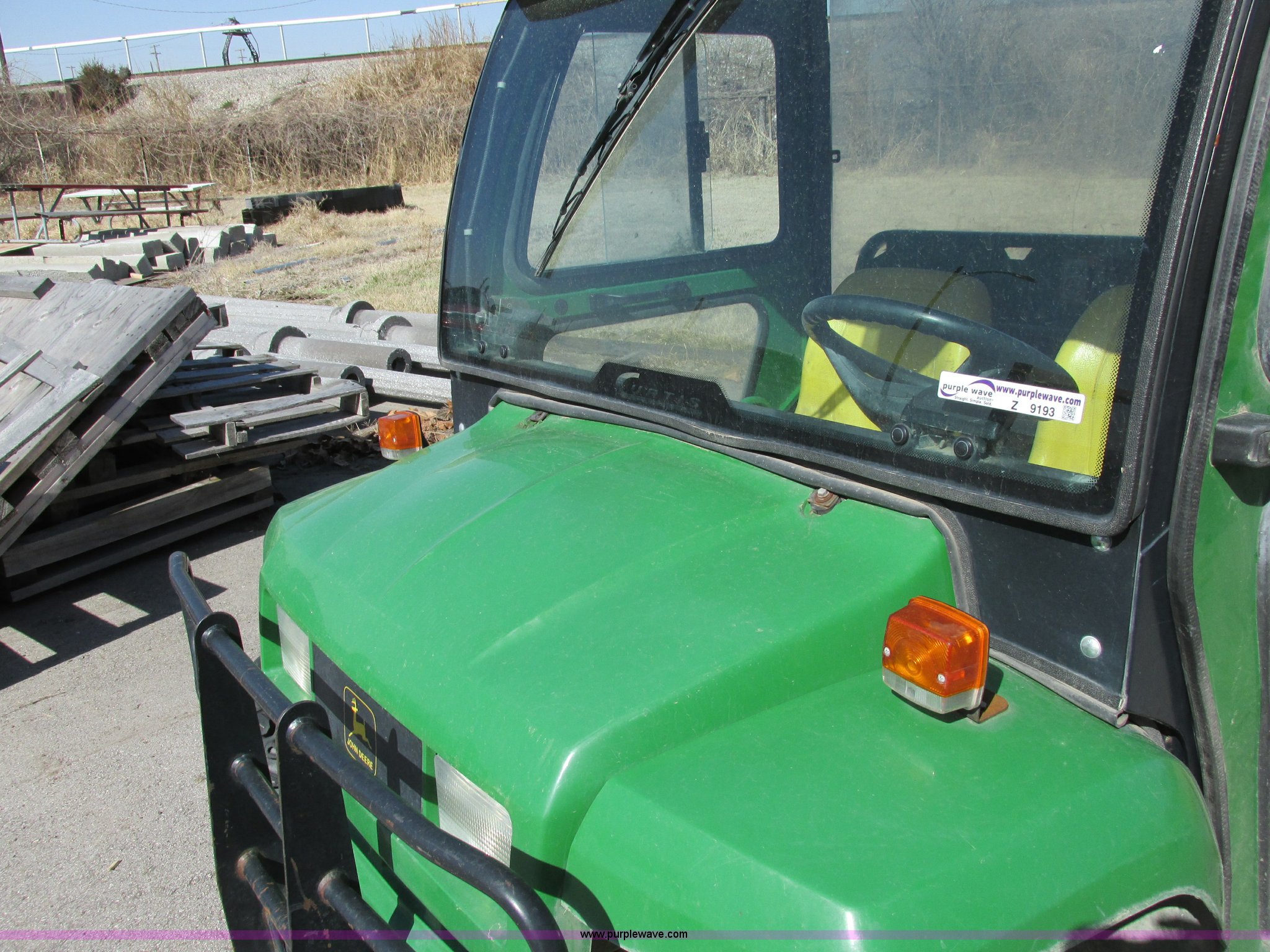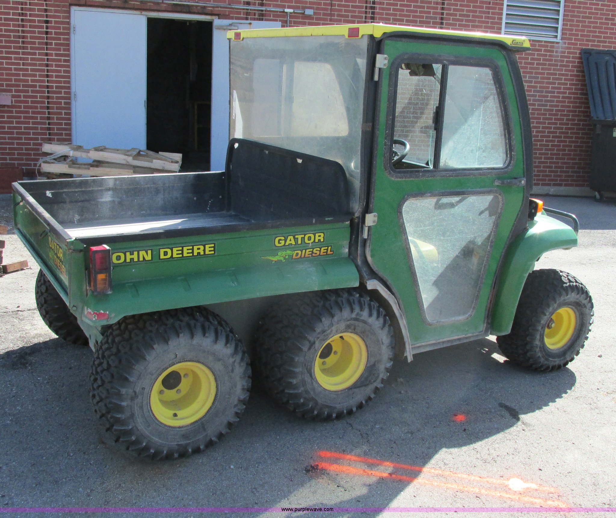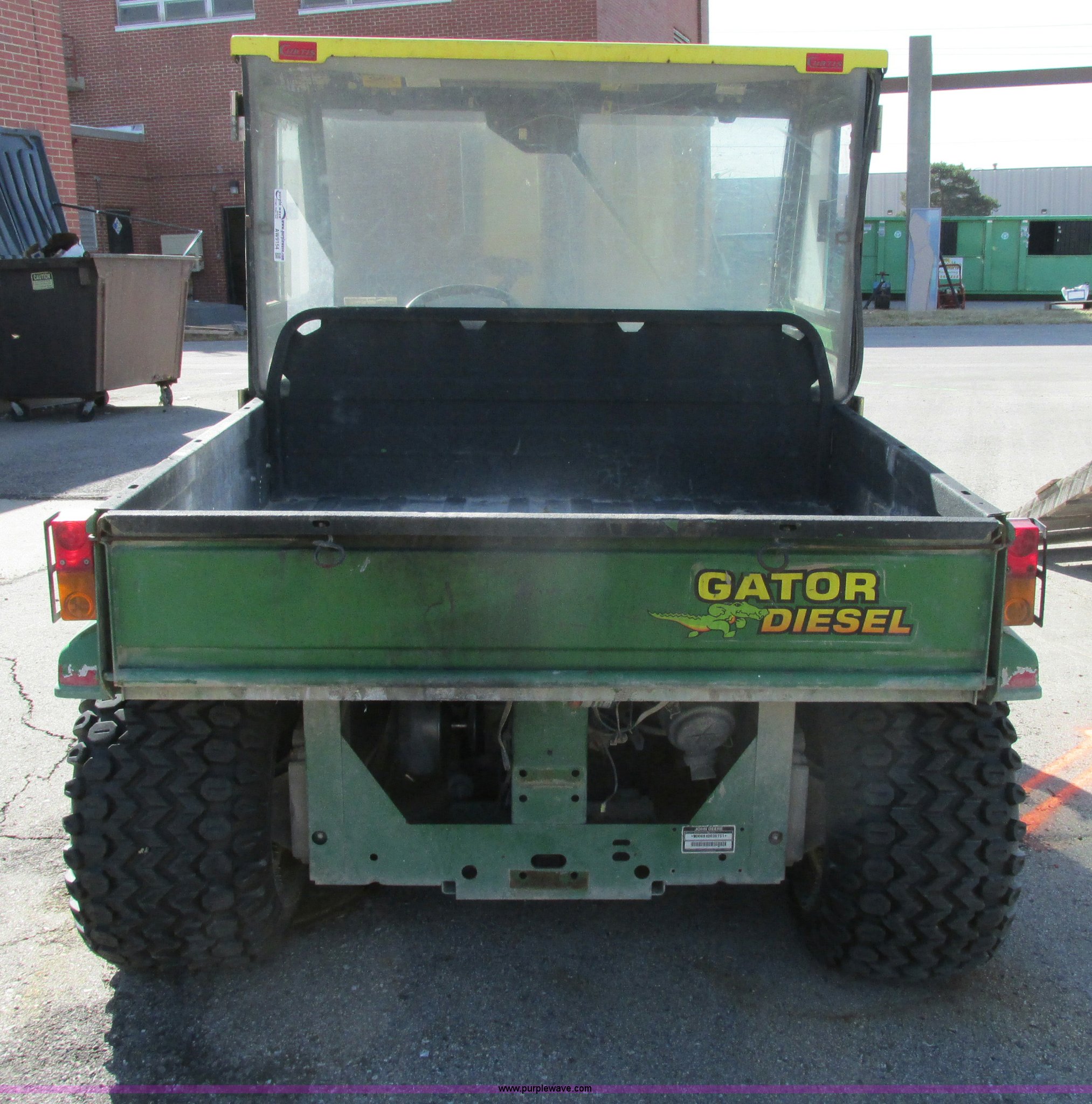 Purple Wave is selling a used Utility Vehicle in Missouri. This item is a 2003 John Deere Gator utility vehicle with the following: Yanmar 3007D003 three cylinder diesel engine, Serial CH3007D065404, Differential lock, Cab enclosure, Removable doors, Heat, Windshield wiper, Block heater, Electric dump bed, Spray-in bed liner, Push bumper with guard, Backup alarm, Brake lights, Blinkers, 22.5x10x8 front tires, 25x13-9 rear tires, Unattached drive belt included, Battery removed, Cosmetic damage, Unknown running condition