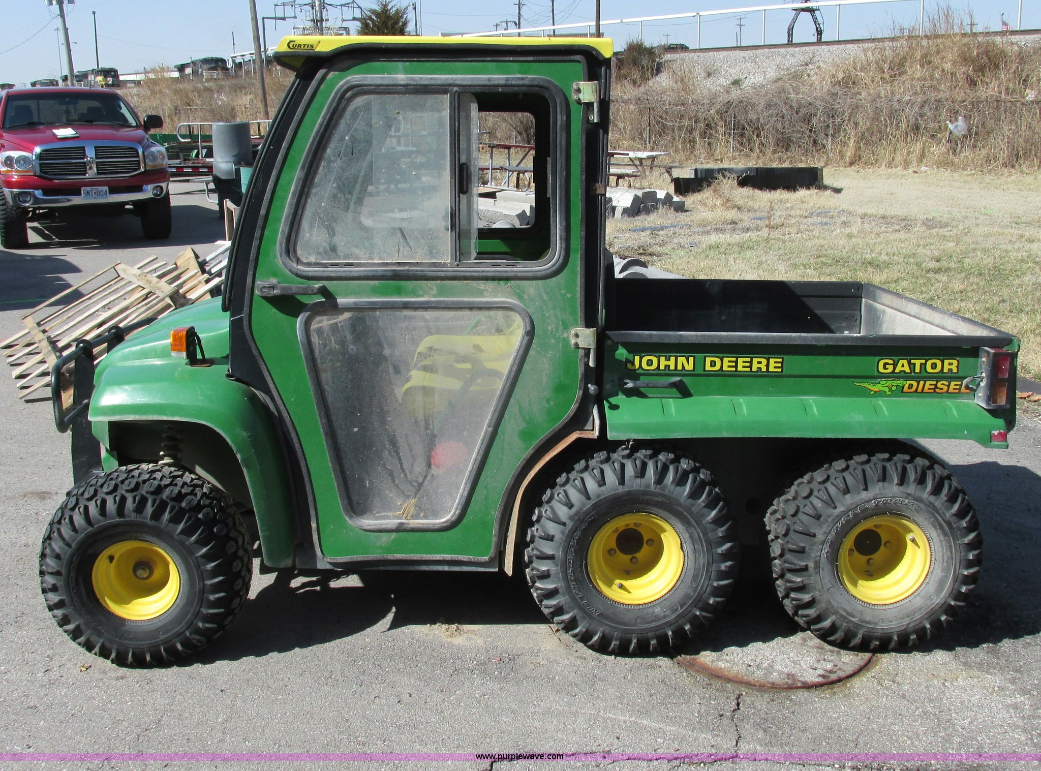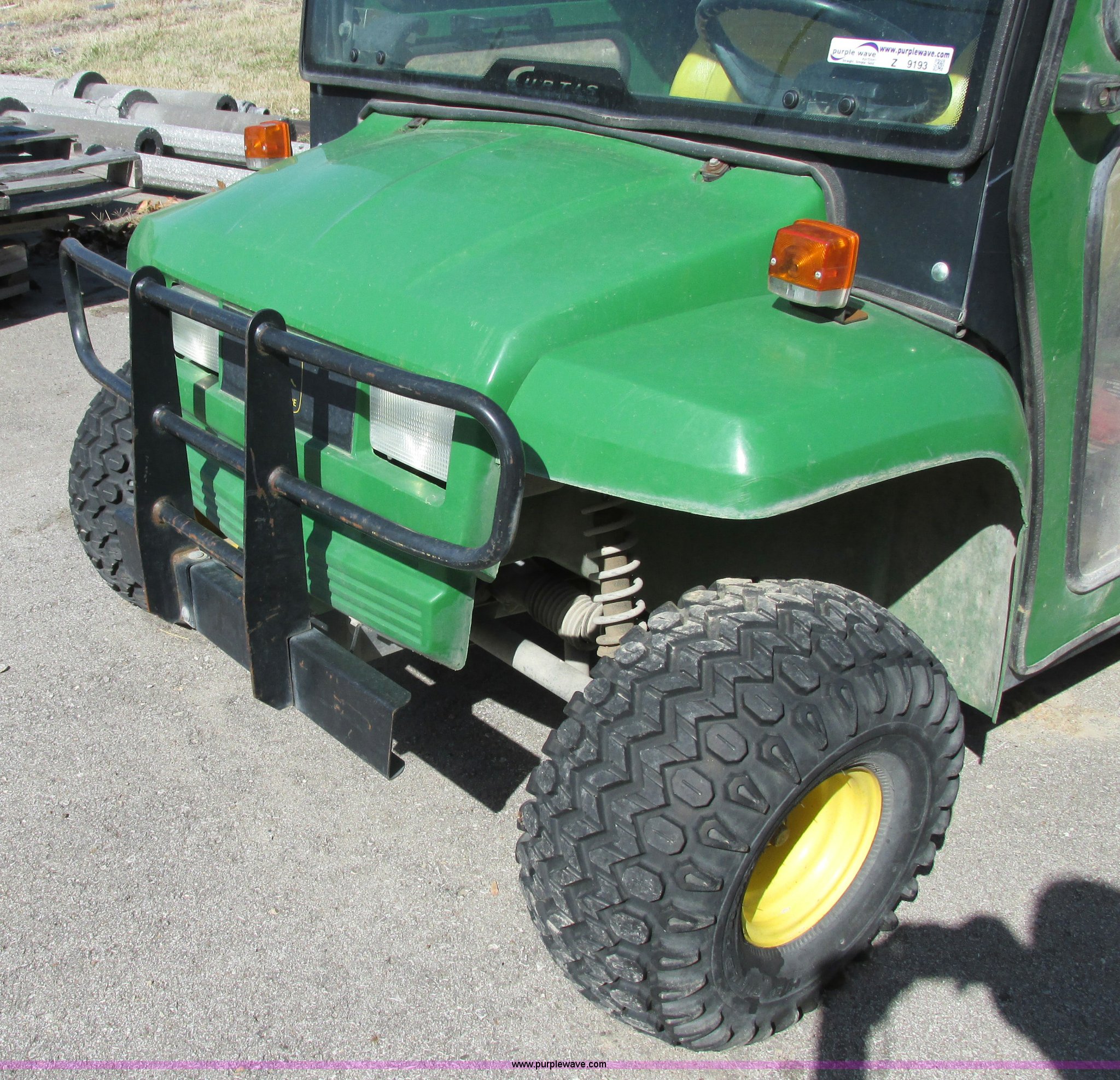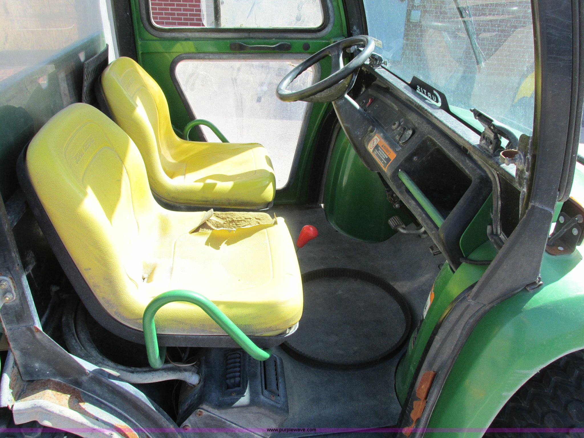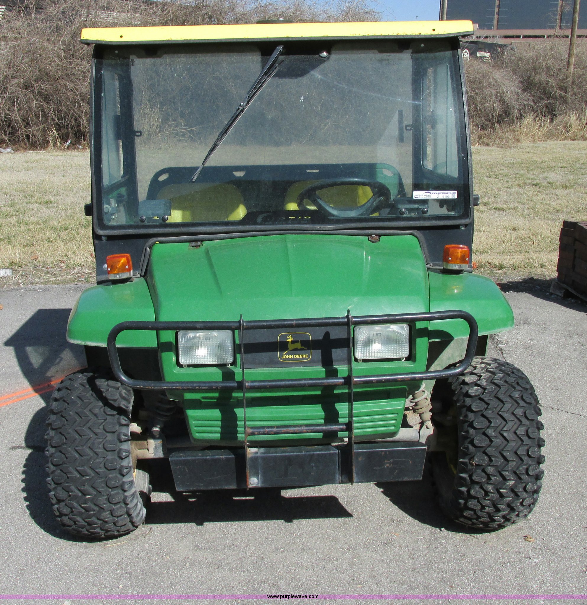 Purple Wave is selling a used Utility Vehicle in Missouri. This item is a 2003 John Deere Gator utility vehicle with the following: Yanmar 3007D003 three cylinder diesel engine, Serial CH3007D065404, Differential lock, Cab enclosure, Removable doors, Heat, Windshield wiper, Block heater, Electric dump bed, Spray-in bed liner, Push bumper with guard, Backup alarm, Brake lights, Blinkers, 22.5x10x8 front tires, 25x13-9 rear tires, Unattached drive belt included, Battery removed, Cosmetic damage, Unknown running condition