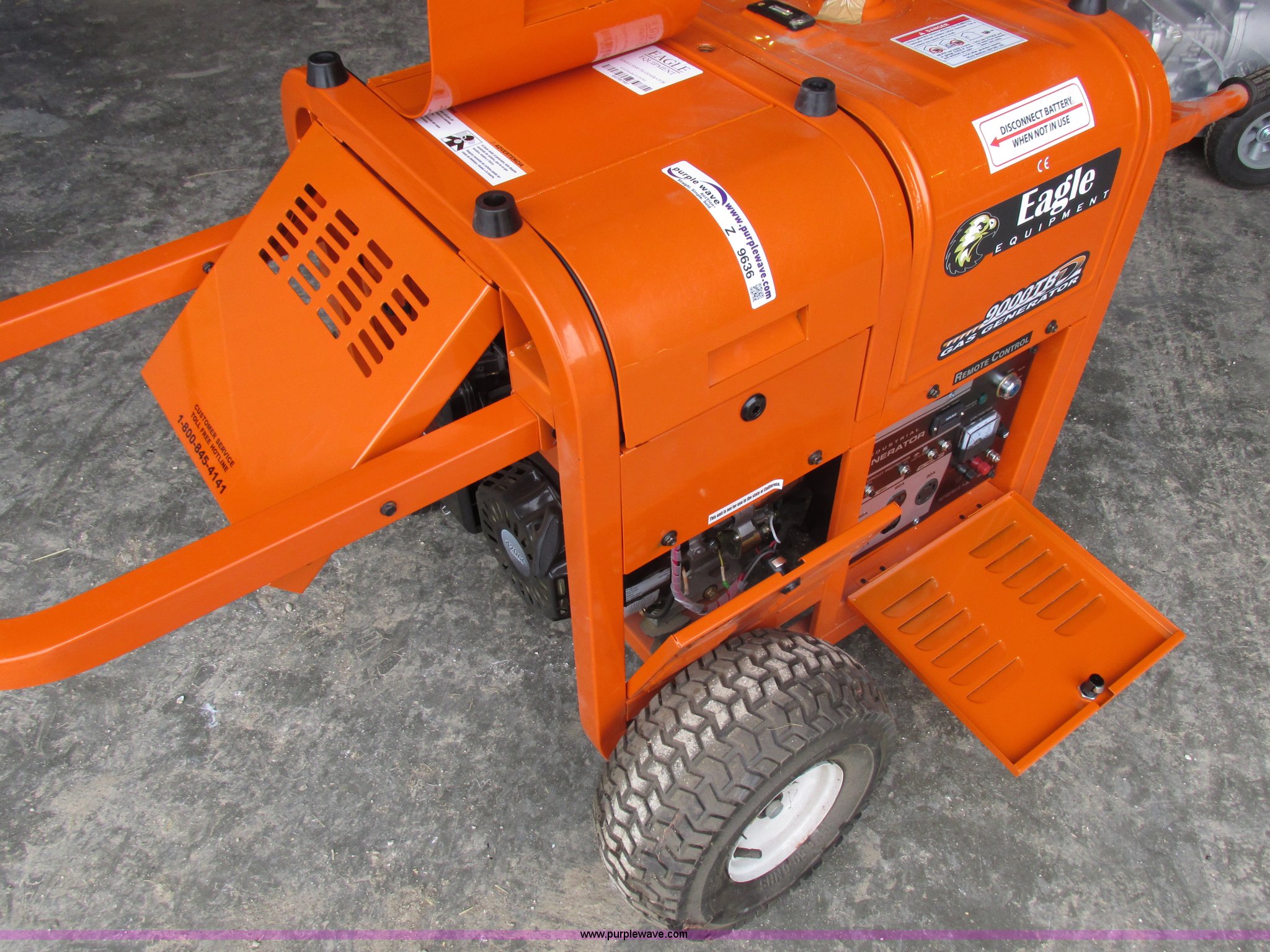 Eagle 9000TB generator. Remote, Wheel kit, Serial EGTB7587. Newland Implement LLC. 16193 U.S. Highway 63. Kirksville, MO 63501