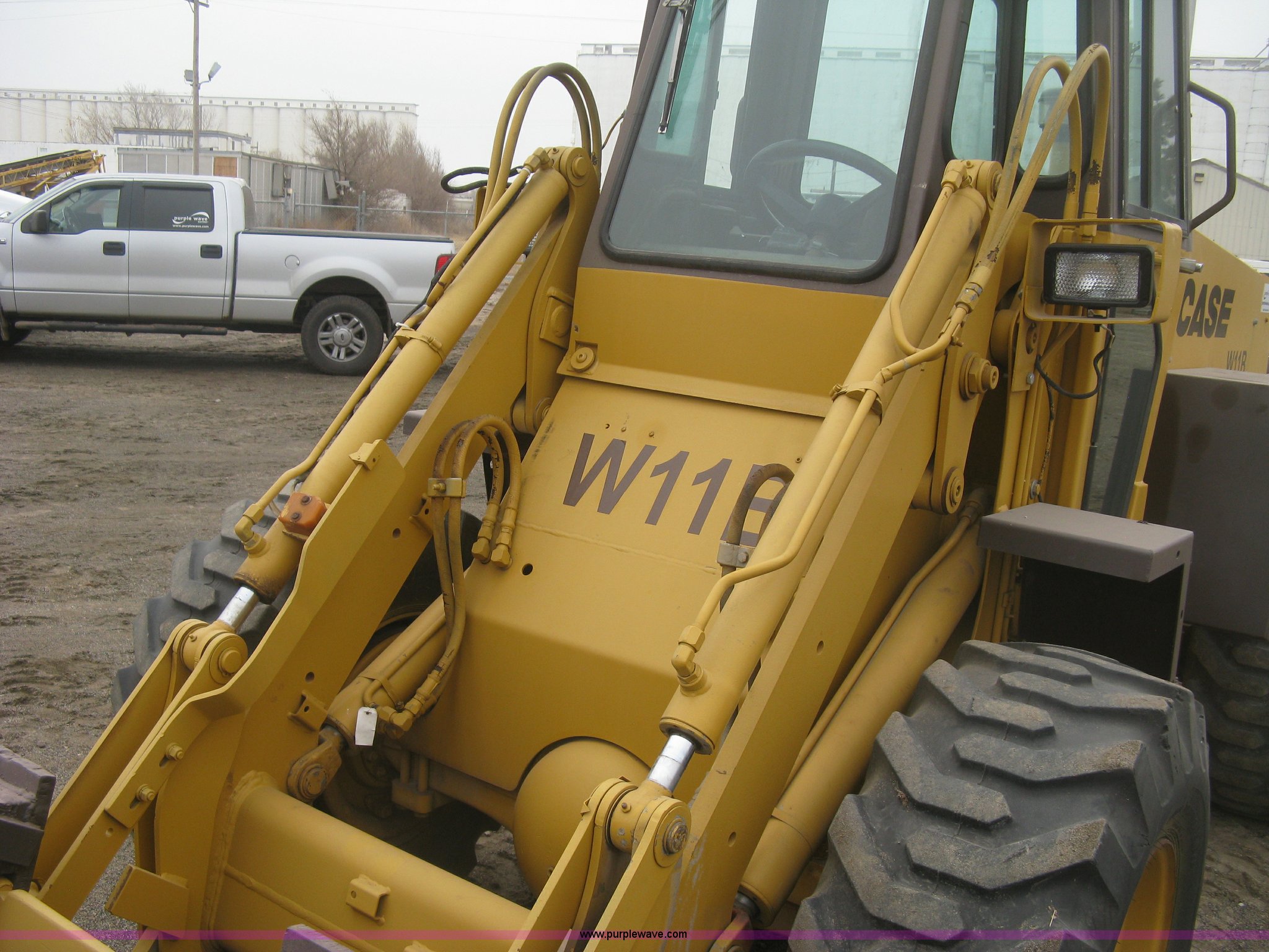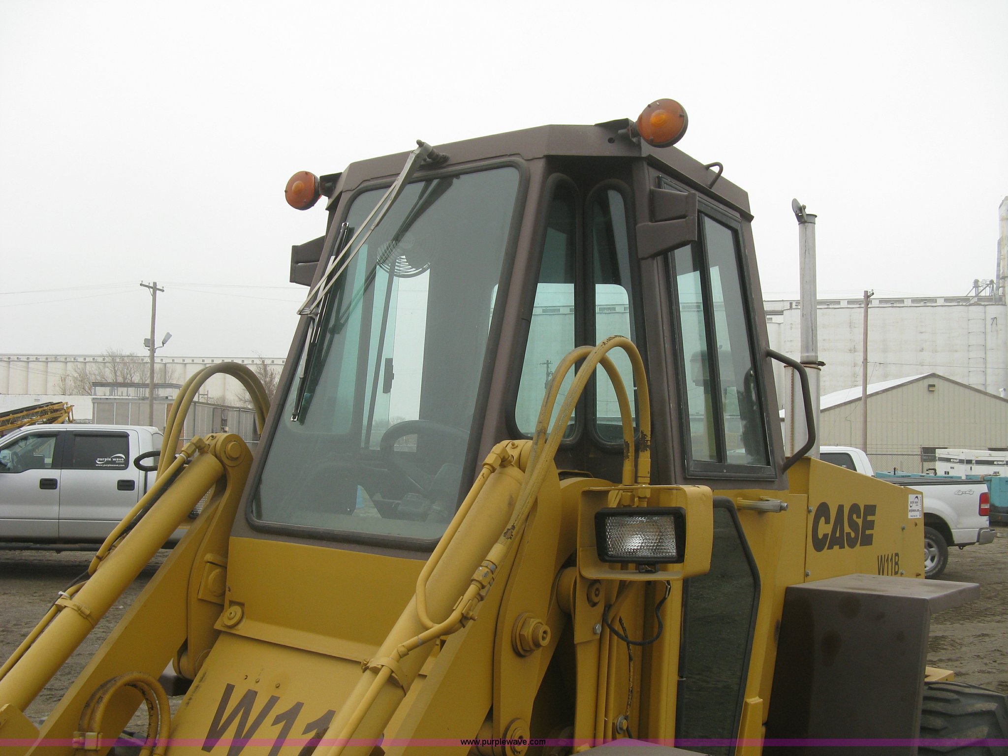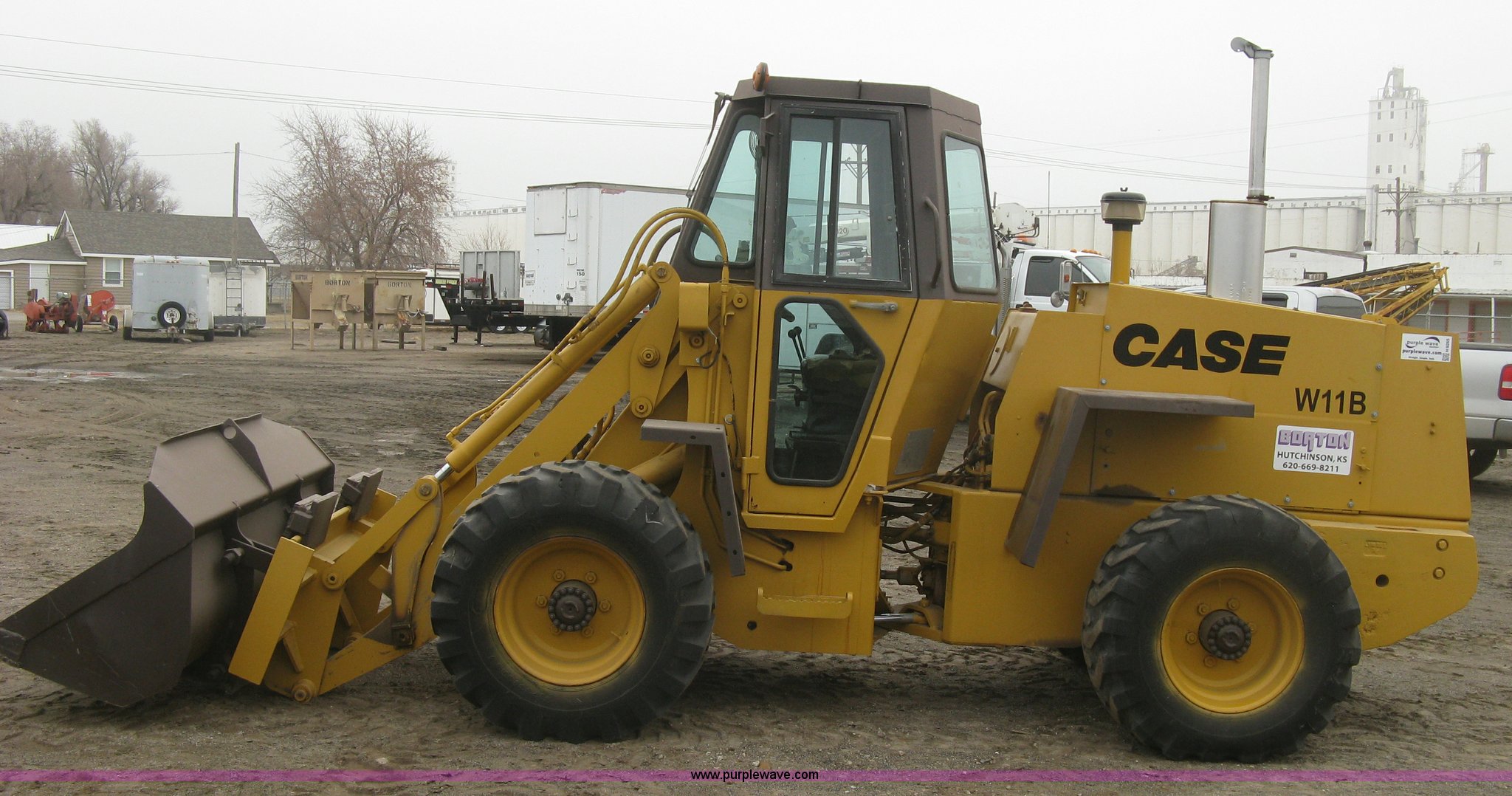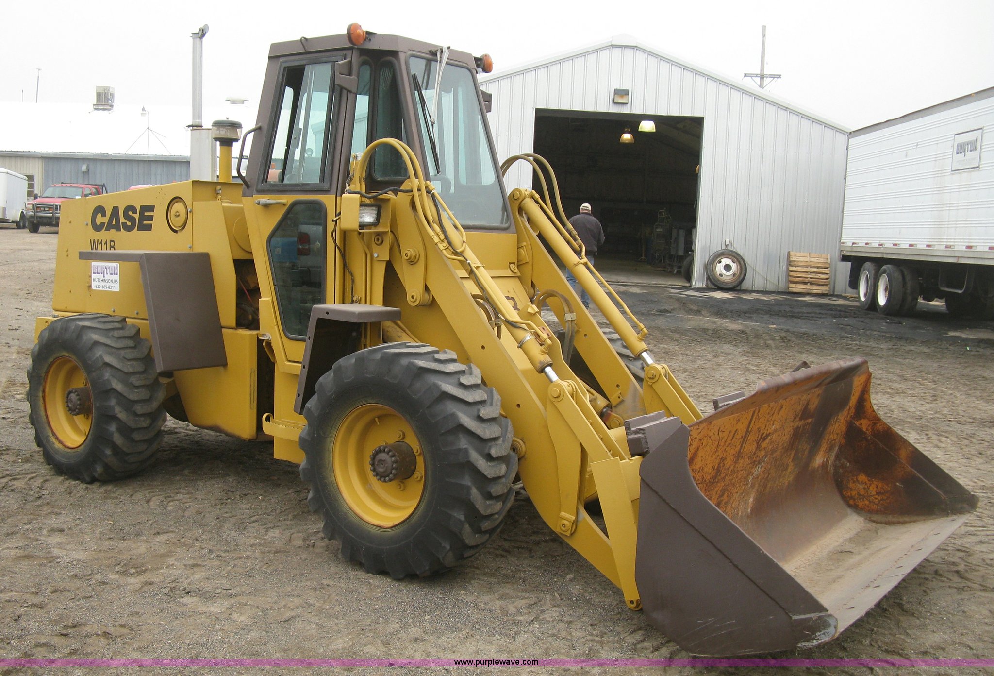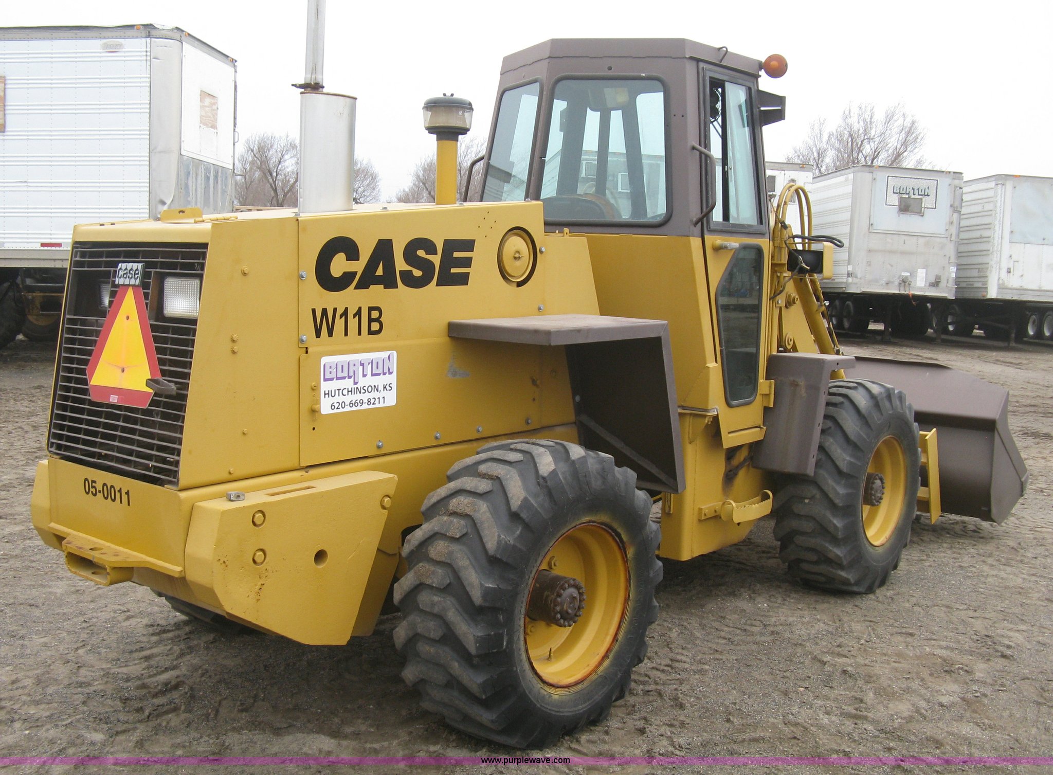 Purple Wave is selling a used Wheel Loader in Kansas. This item is a 1989 Case W11B wheel loader with the following: 366 hours on meter, Actual hours unknown, Four cylinder diesel engine, Model 4-390, Serial 44341311, Three speed shuttle shift transmission, Enclosed cab, Suspension seat, Two stick loader control, Quick coupler, 80" loader bucket, Bolt-on cutting edge, No edge included, Hang/hook over pallet forks, 15-19.5NHS tires, Some damaged, will hold air, 10,849 lbs. base operating weight, Serial JAK0017413, Unit# 05-0011