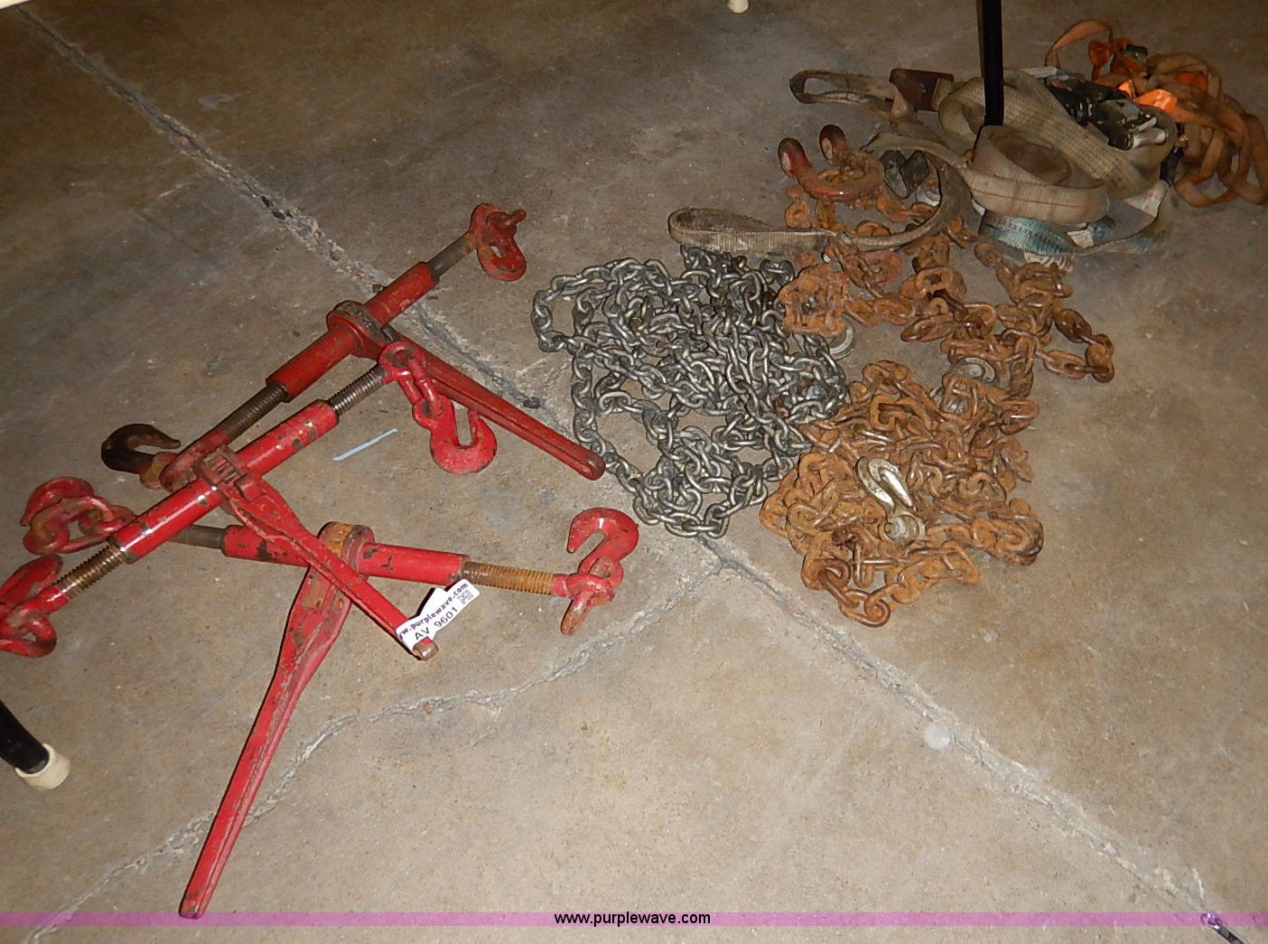 Purple Wave is selling a used Tools in Kansas. This item is a Assorted equipment with the following: (3) ratchet tie downs, Tow strap, Tie down straps, (3) chains