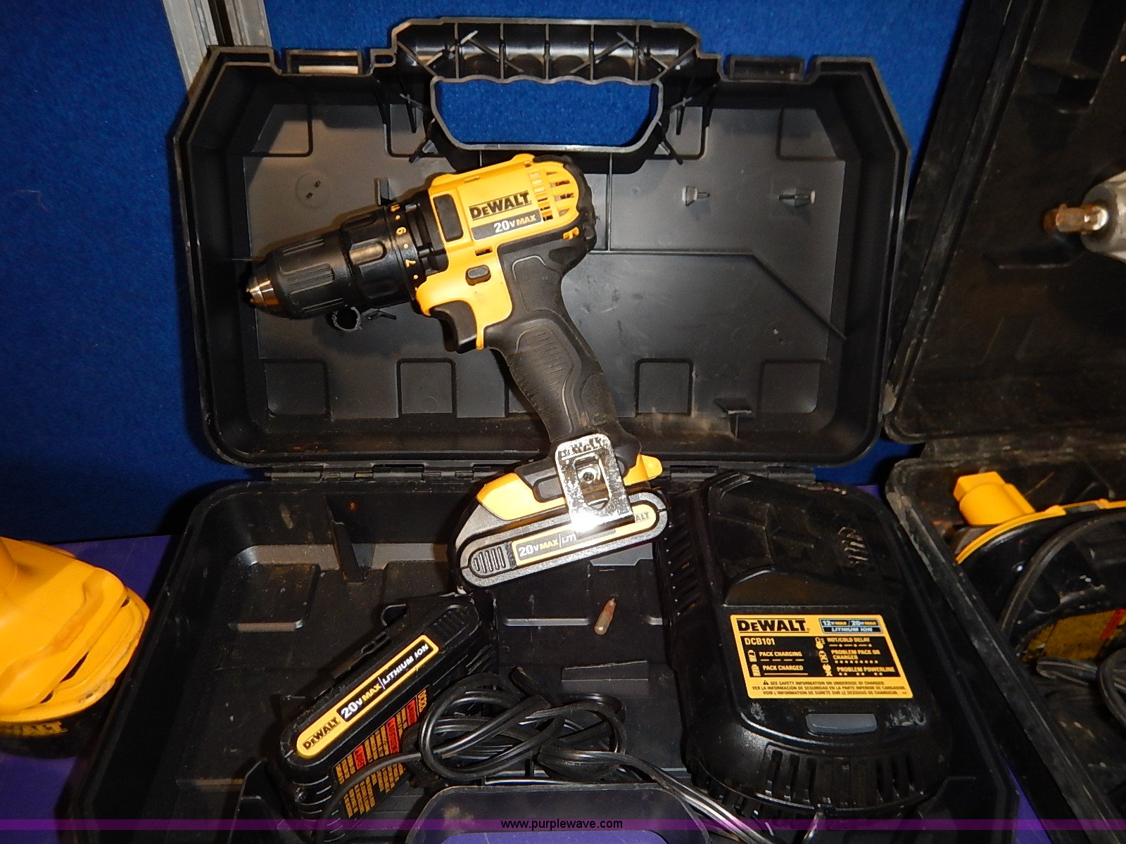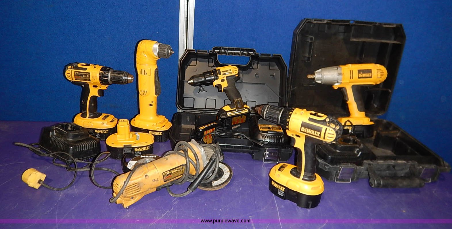 Purple Wave is selling a used Tools in Kansas. This item is a (6) DeWalt power tools with the following: DC720 18V drill, 1/2" chuck, 18V angle drill, D2840 angle grinder, 4.5", DC720 18V drill driver, 1/2" chuck, DCD780 20V drill driver, 1/2" chuck, DW059 18V impact wrench, 1/2", DC825 18V impact driver, 1/4" chuck, (7) 18V batteries, (2) 18V chargers, (2) 20V batteries, 20V charger